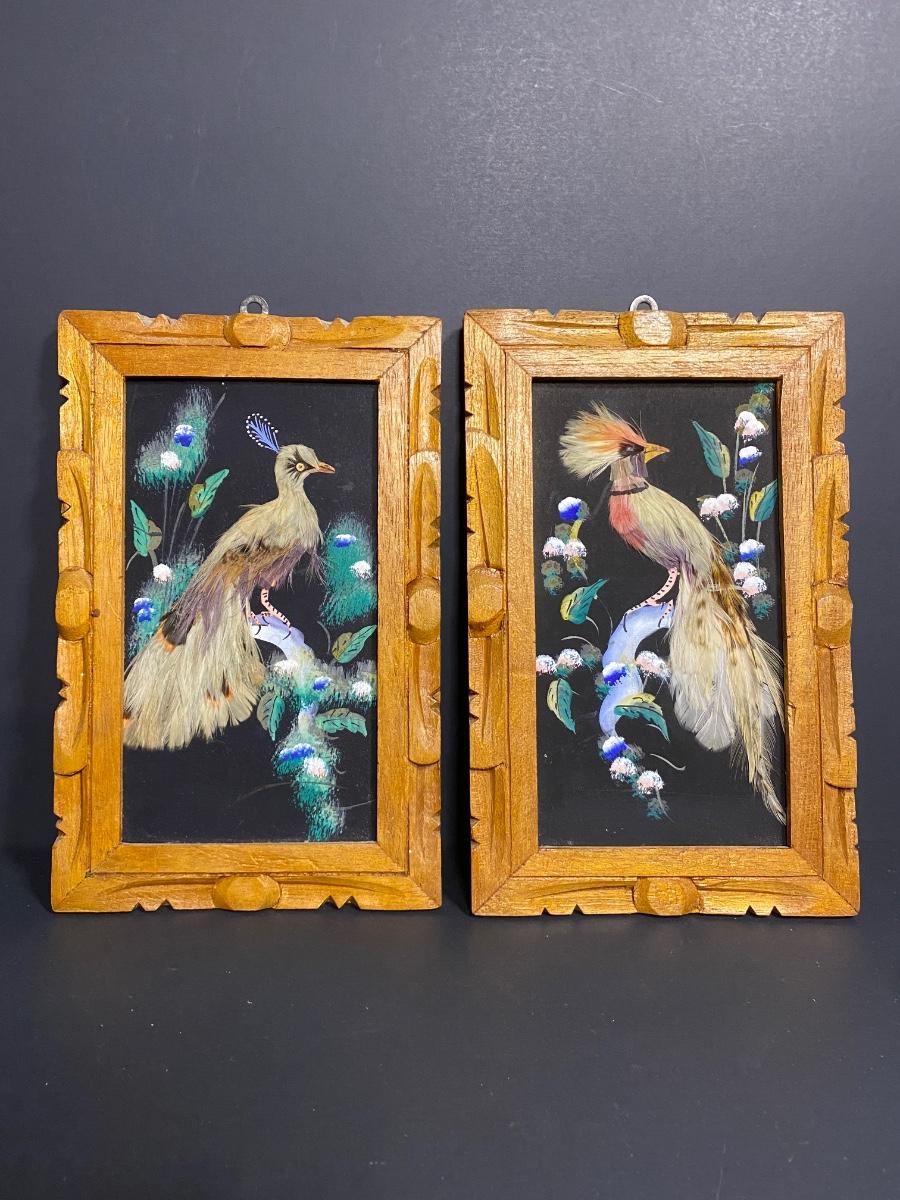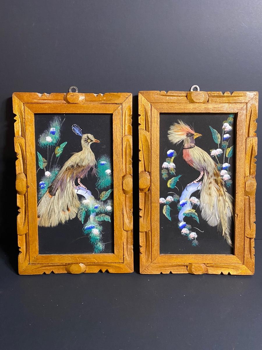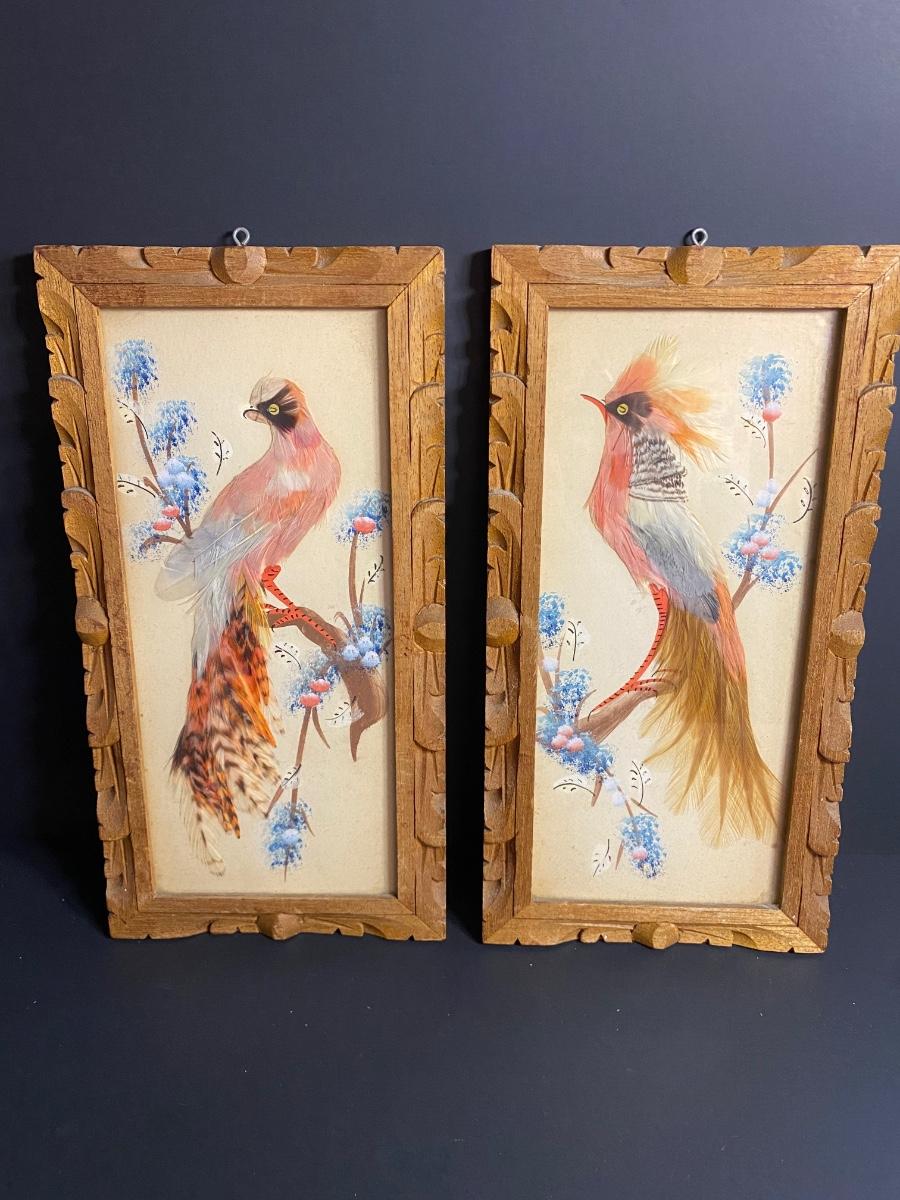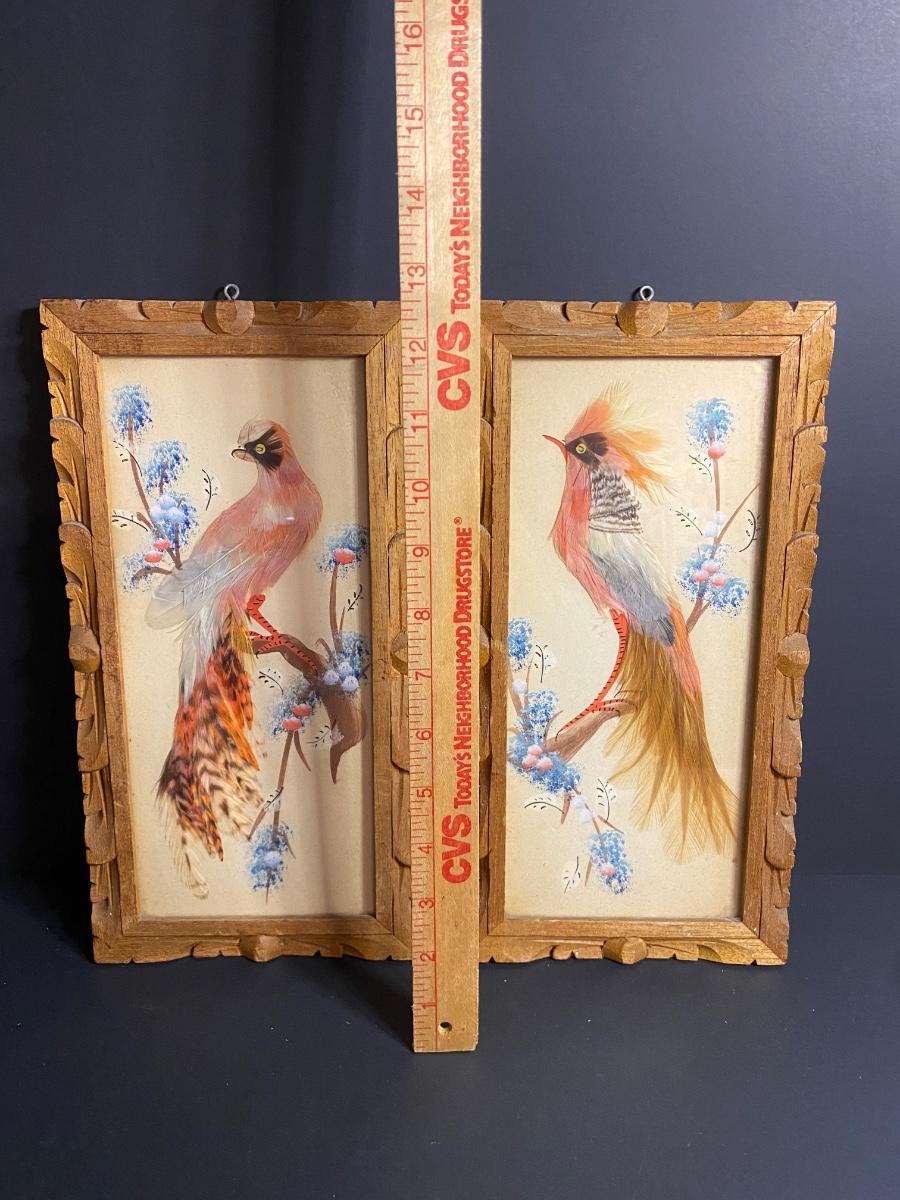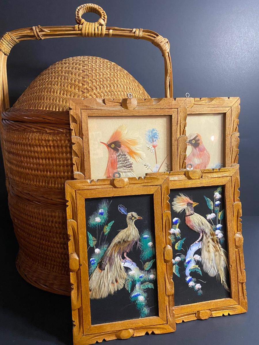 Lot 440: Asian 2 Tier Wedding Basket, MCM Feather Bird Art Sets