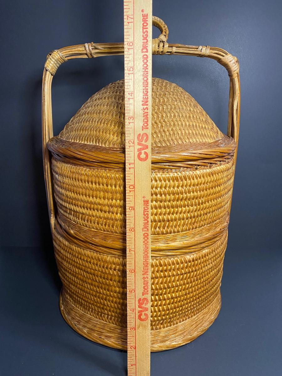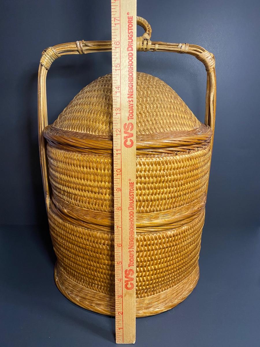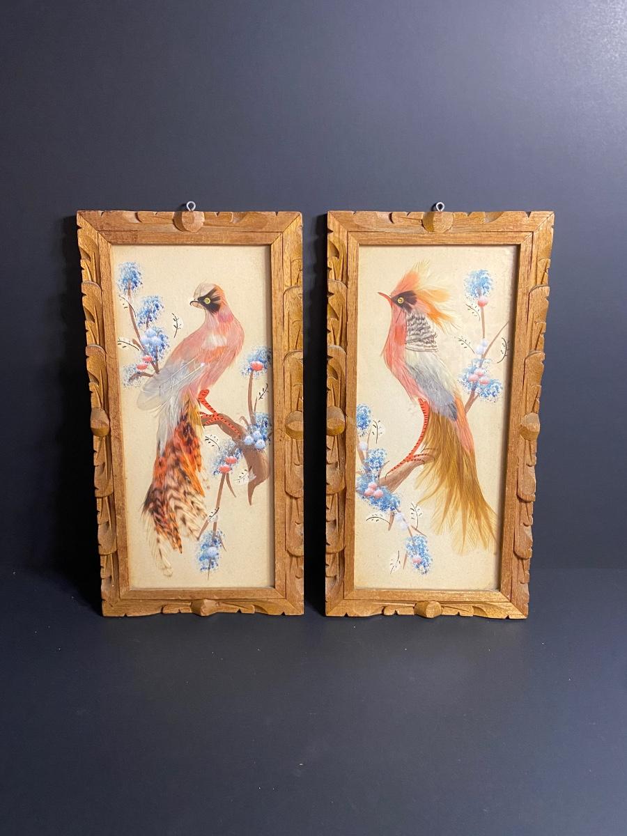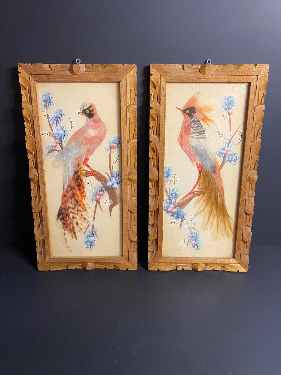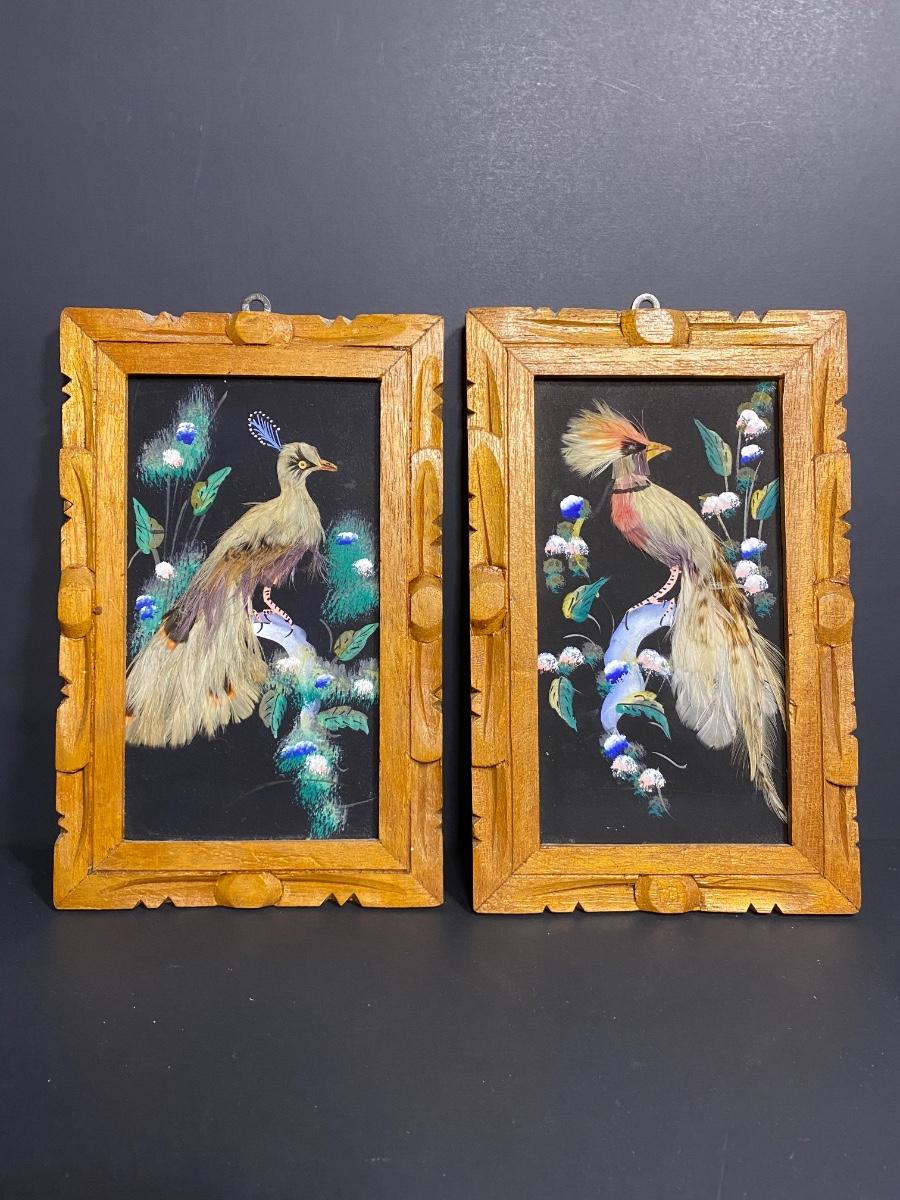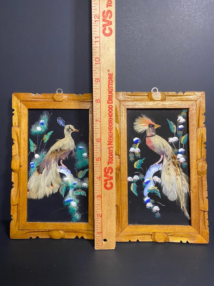 Lot 440: Asian 2 Tier Wedding Basket, MCM Feather Bird Art Sets