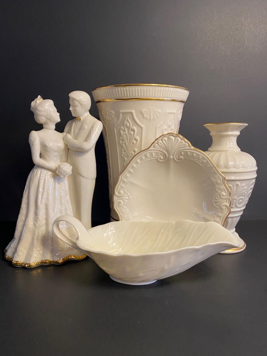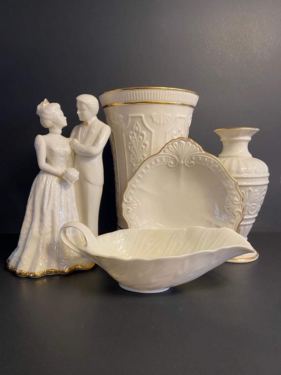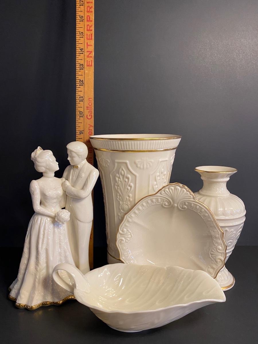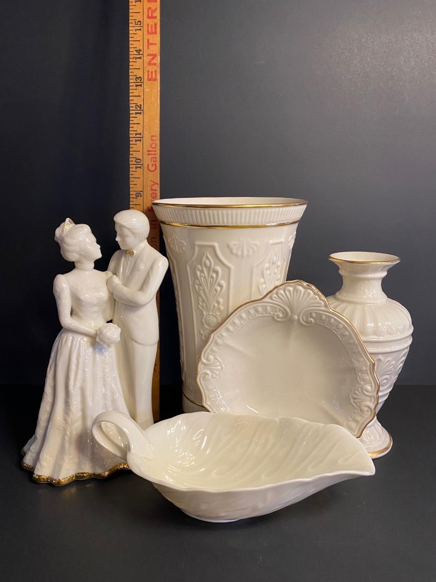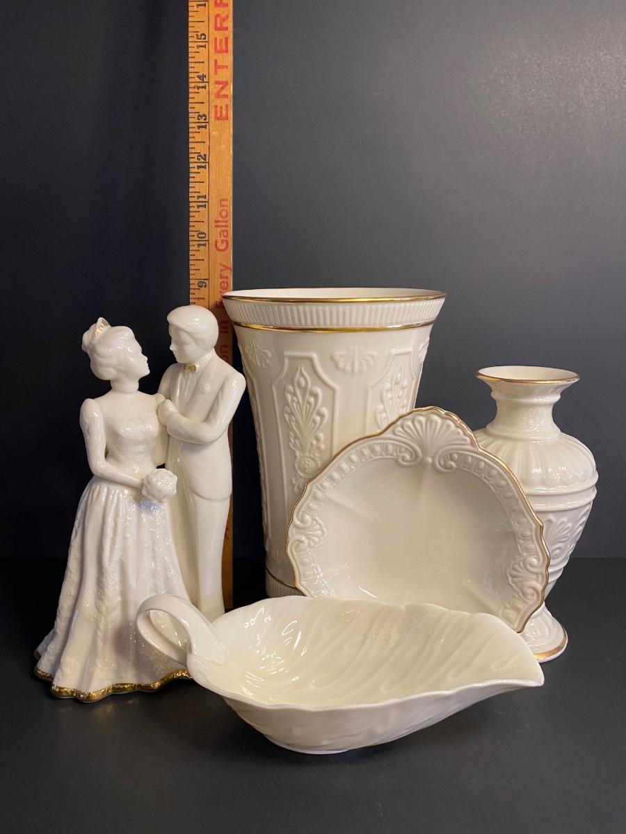 Collection of 5 Lenox pieces. Wedding Promises bride and groom, Gold trim vase and candy dish and more. Please see all pictures as they are the best representation of the items. The pictures show condition, measurements if taken, and what is included in the lot. Due to the large amount that we photograph and the time frame, we are not always able to take measurements. All items unless noted, are pre-owned and have been used. If you purchased furniture, you must bring help. We do not allow one person to carry large furniture out on their own. Bring help, tools and a truck for the safety of our client’s homes, and your personal safety. Company policy. Thank you.