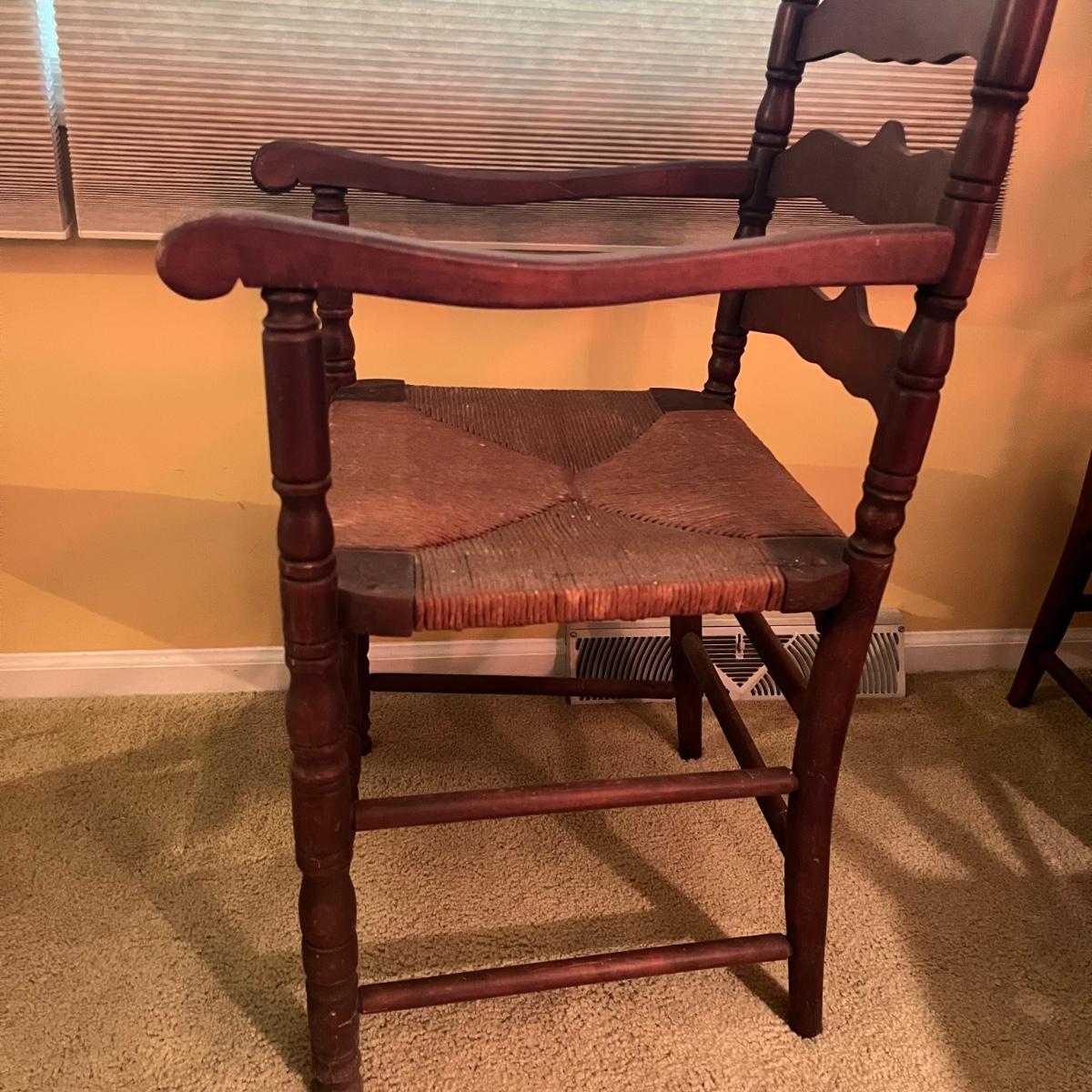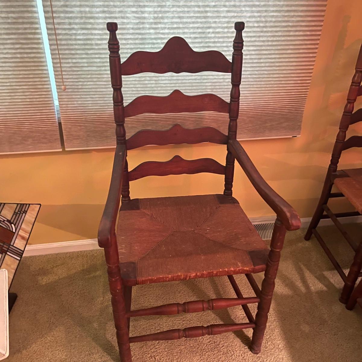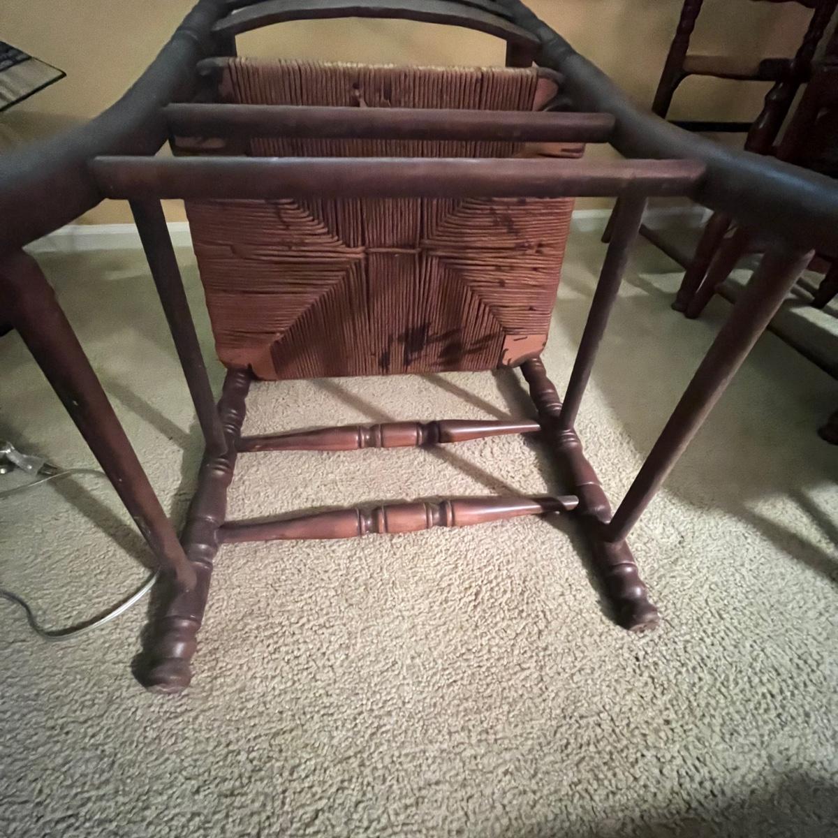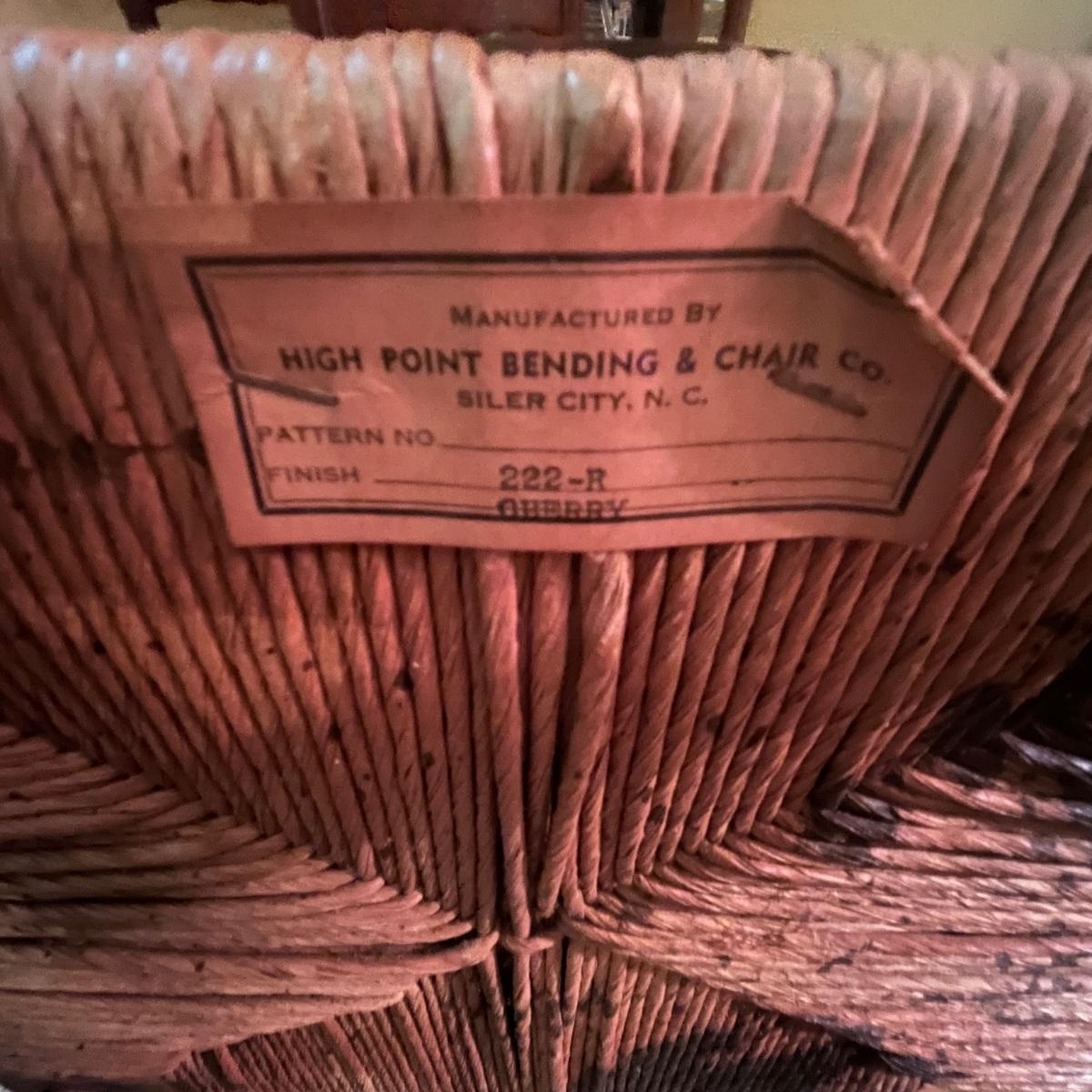 Lot includes one arm chair and five armless chairs made by the High Point Bending & Chair Company. All chairs appear to have a cherry finish with woven rush bottom seats. Arm chair measures 20” x 20.5” x 42” with a 17.5” seat height.