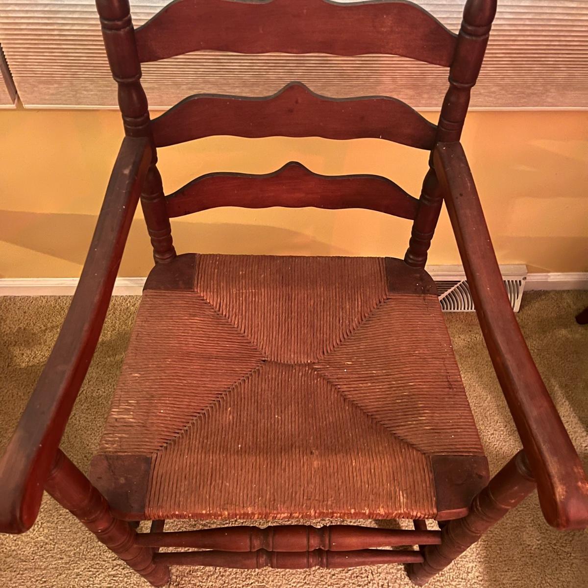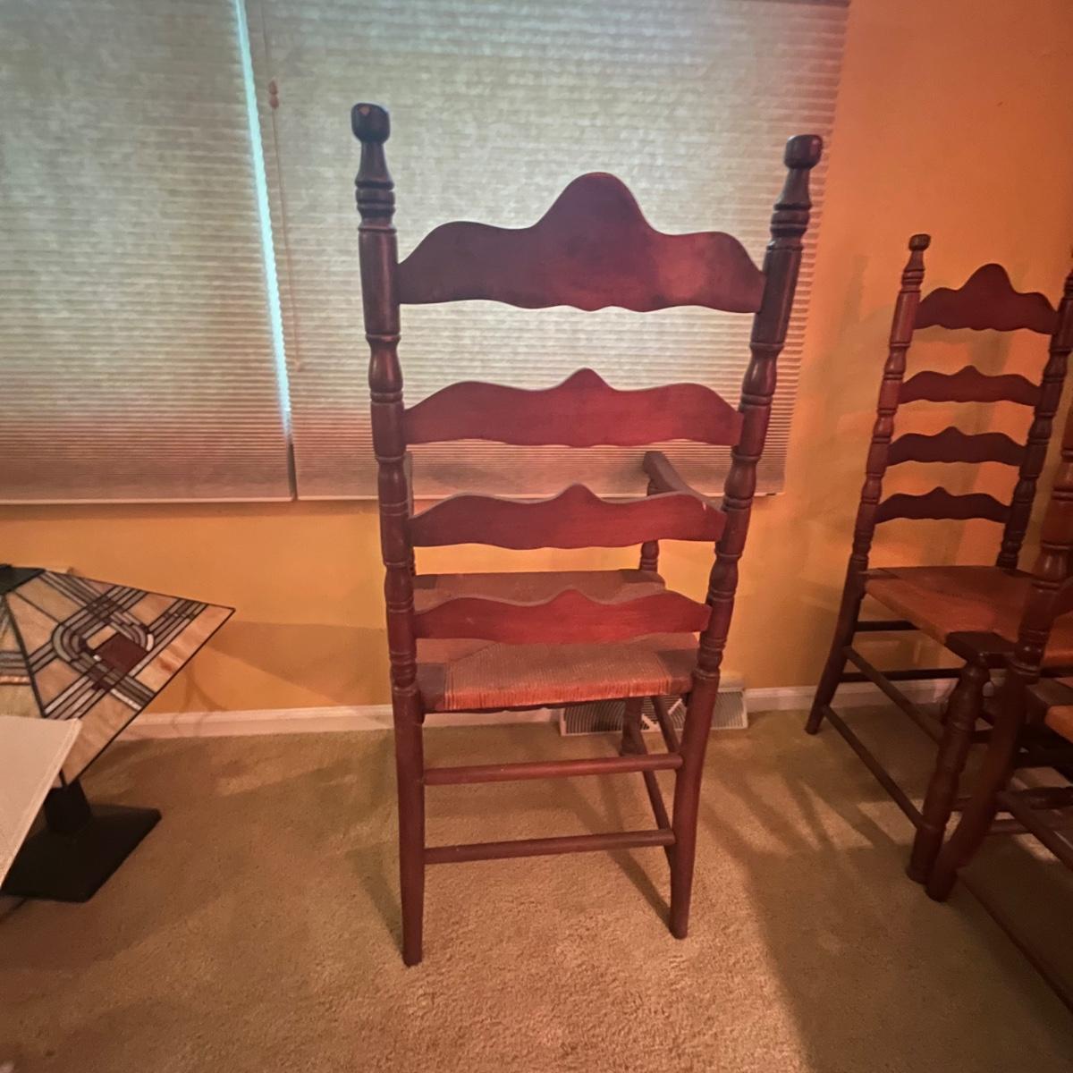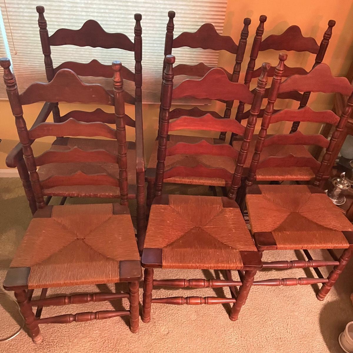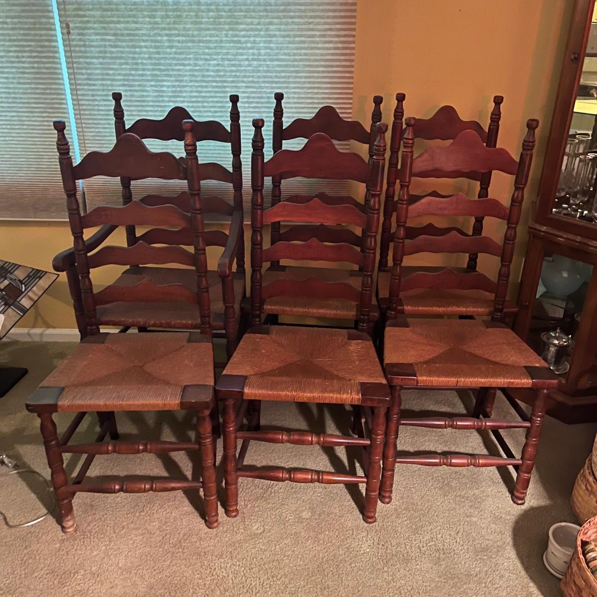 Lot includes one arm chair and five armless chairs made by the High Point Bending & Chair Company. All chairs appear to have a cherry finish with woven rush bottom seats. Arm chair measures 20” x 20.5” x 42” with a 17.5” seat height.