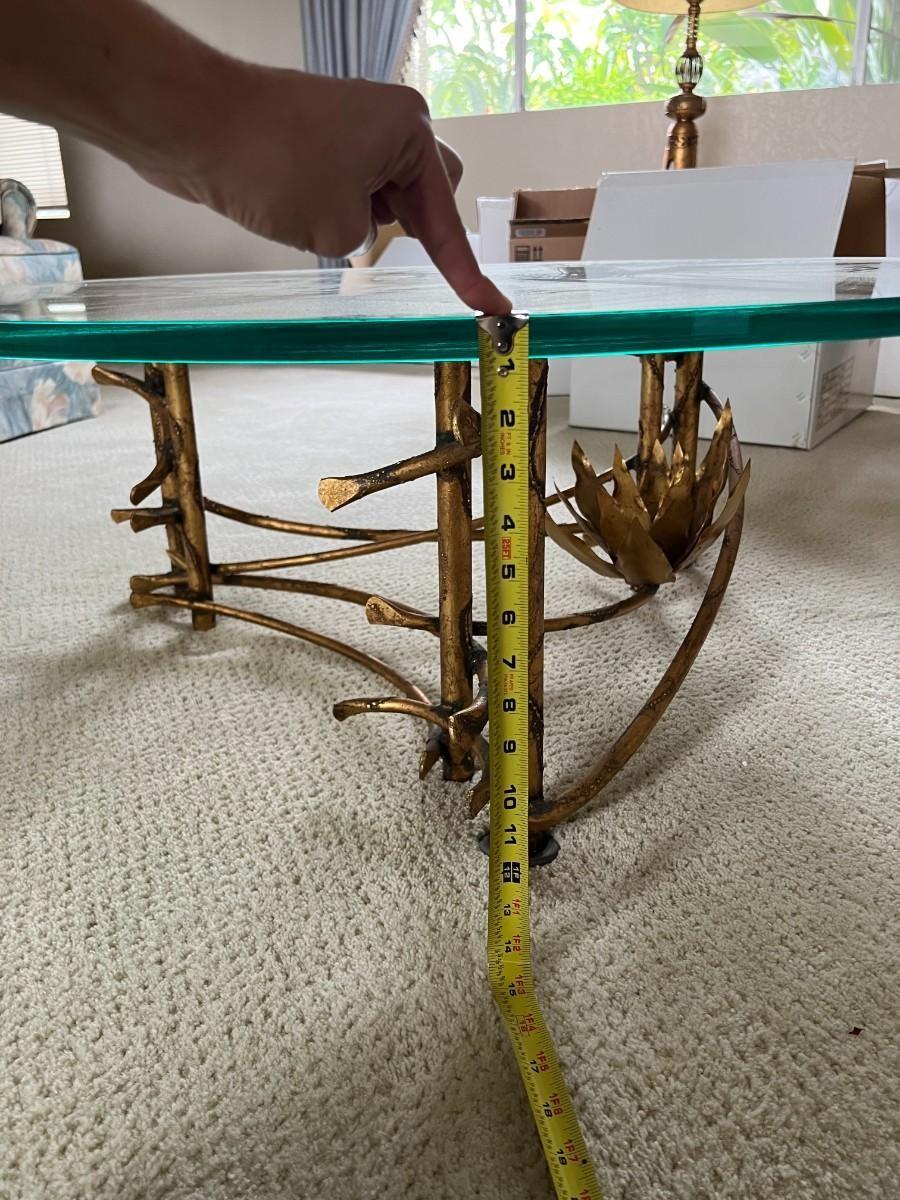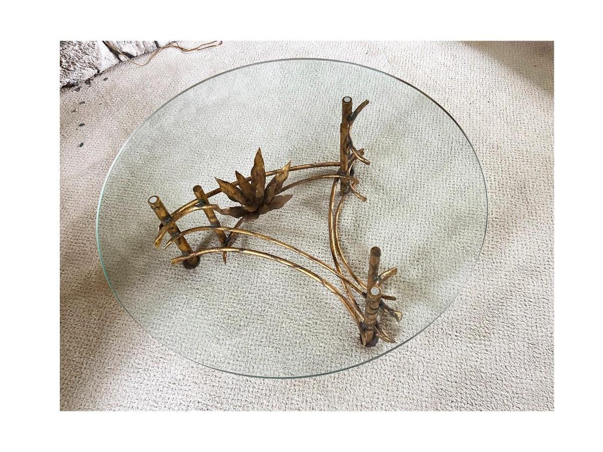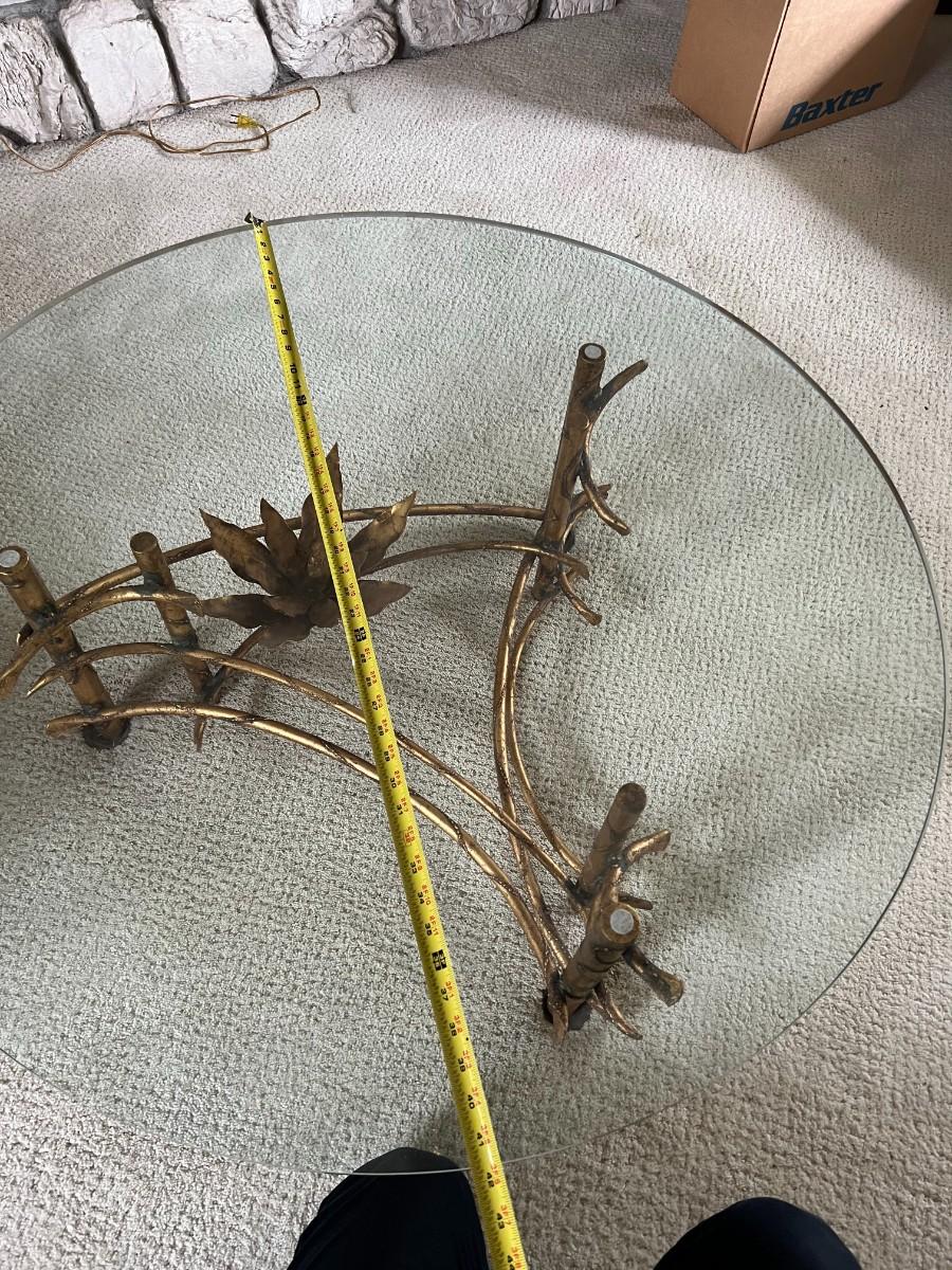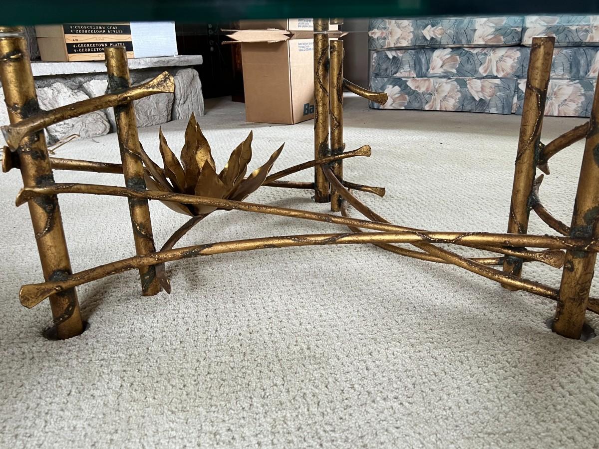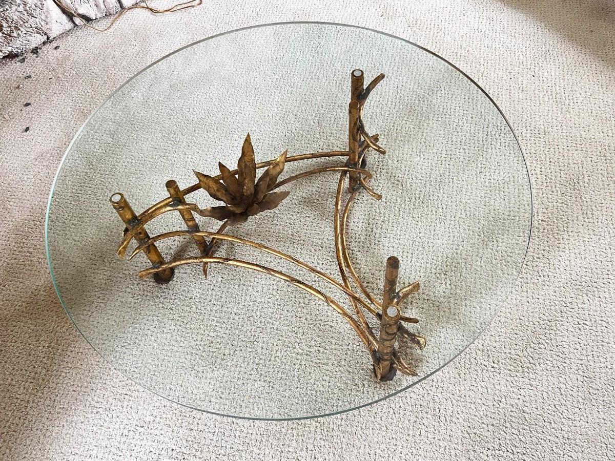 Vintage Silas Seandel Round Glass Top Brutalist Gold Gilt Lotus Coffee Table. Asian Regency style coffee table. Gold tone base has a bamboo like style with a leaf or lotus flower. 42" diameter and about 15" tall. This same table is listed on Etsy for over $900.00!
