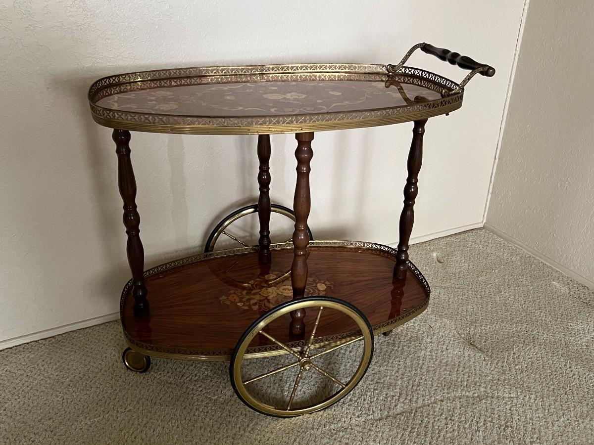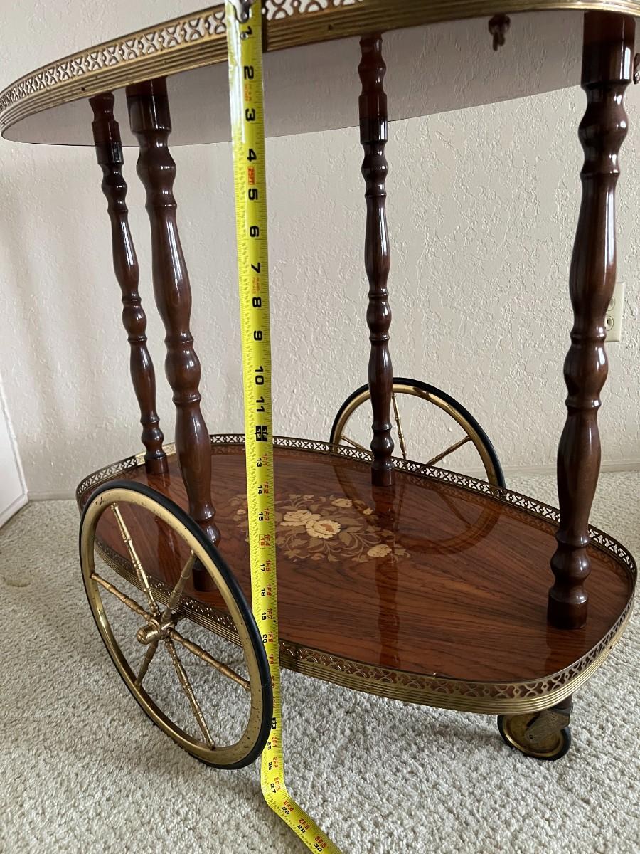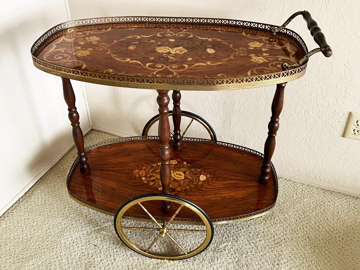 Vintage Inlaid Walnut Wood Trolley Tea Dessert Cart Italian Marquetry