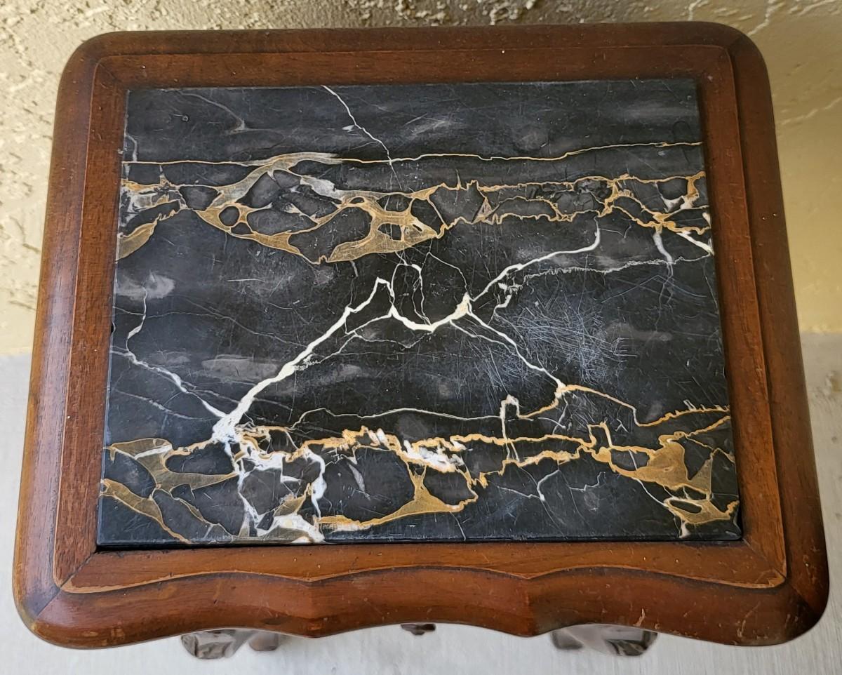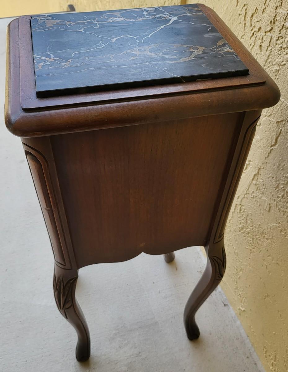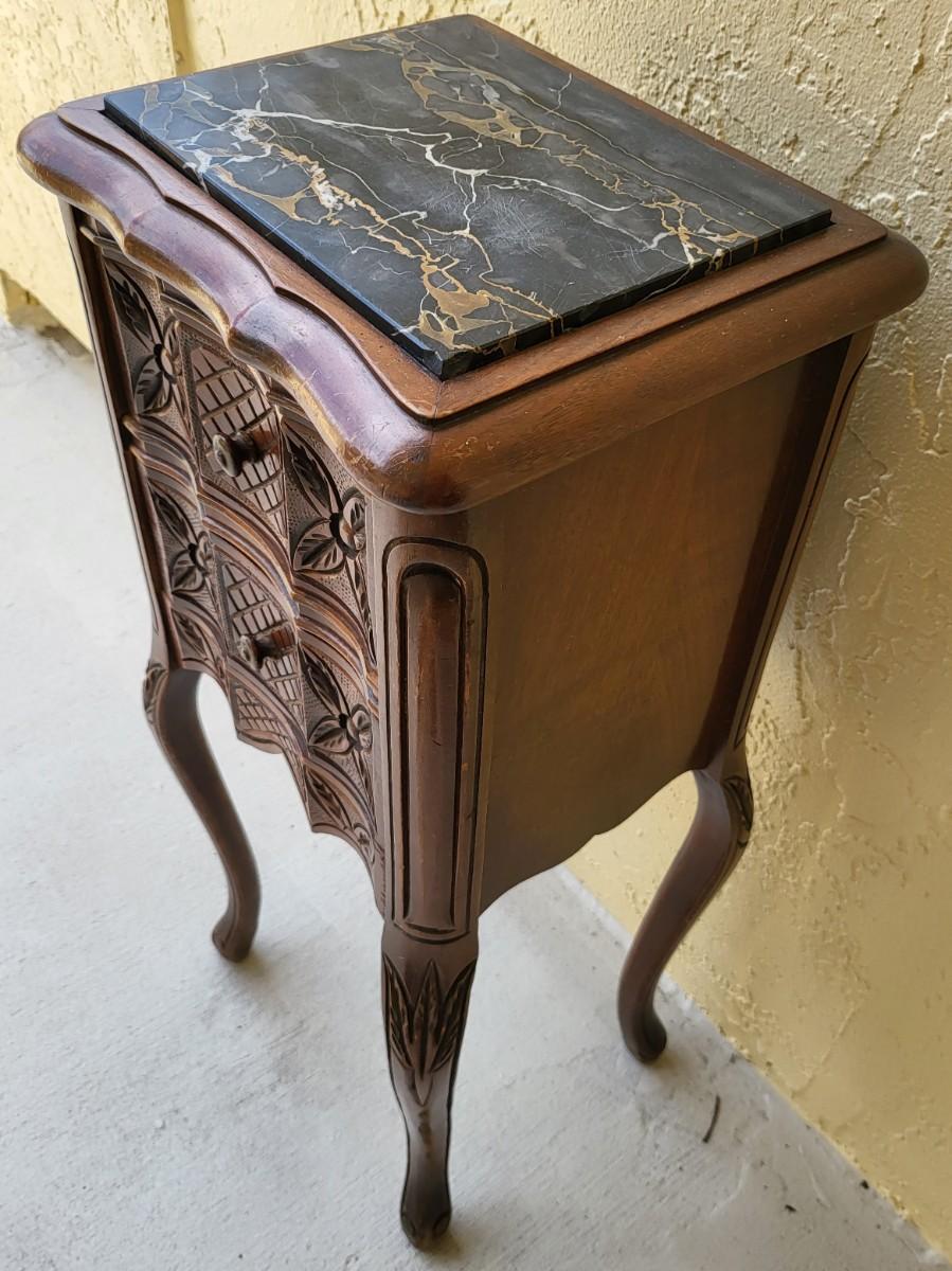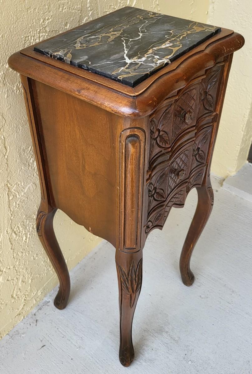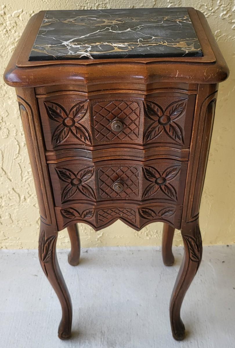 French Petite Chestnut Marble Top 2 Drawer Commode with ribbon carved molding and carved skirt