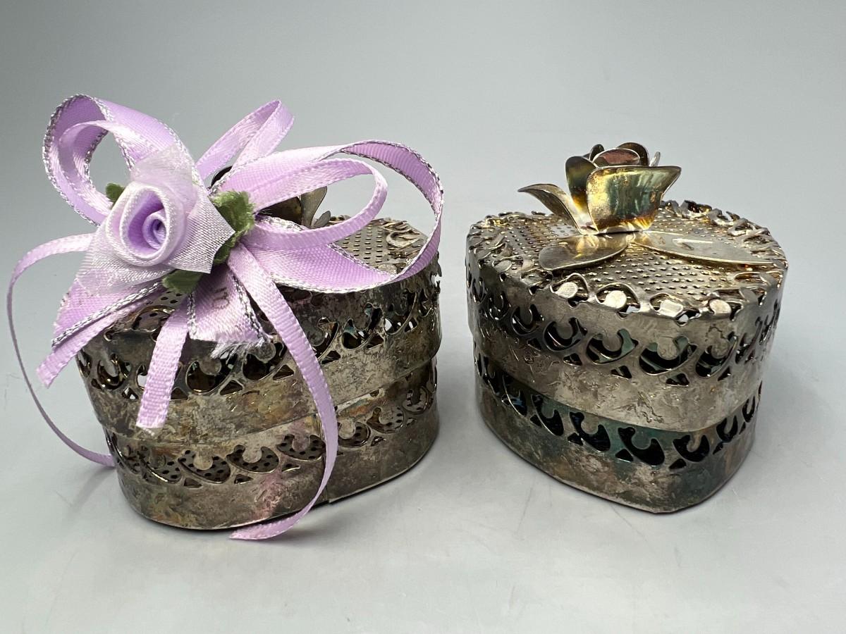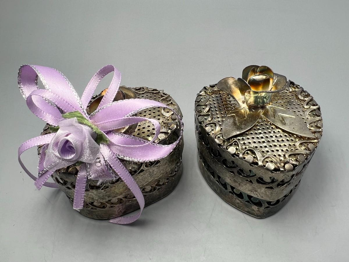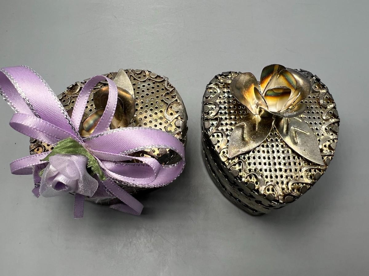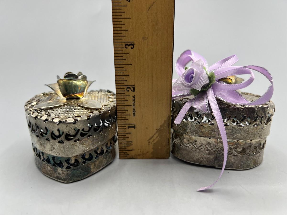 One of the metal boxes has a purple rose ribbon glued onto it, there is no damage to either pieces and in good condition. Check pictures for more details and for sizing.