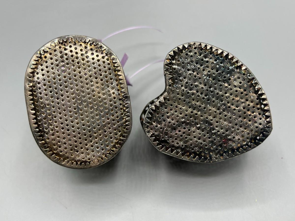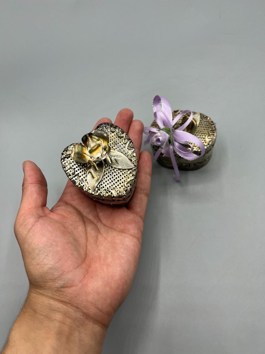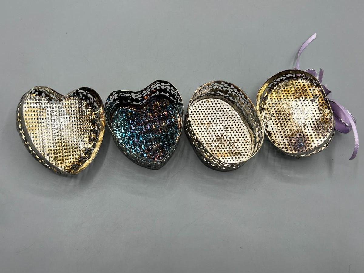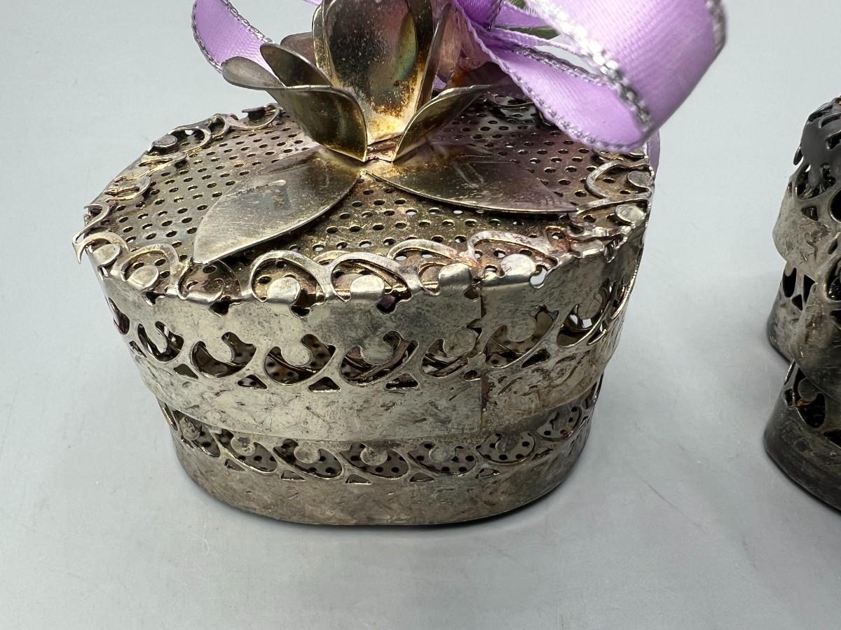 One of the metal boxes has a purple rose ribbon glued onto it, there is no damage to either pieces and in good condition. Check pictures for more details and for sizing.