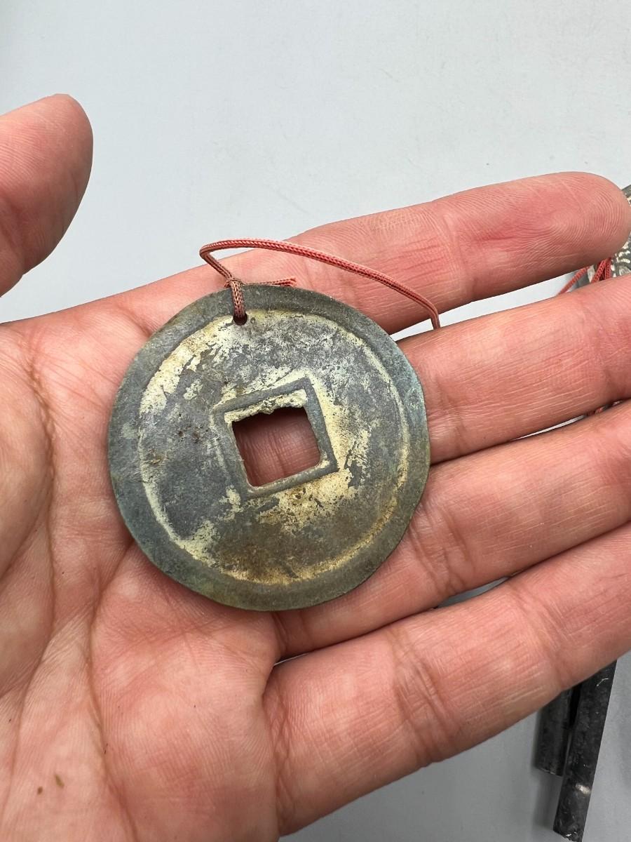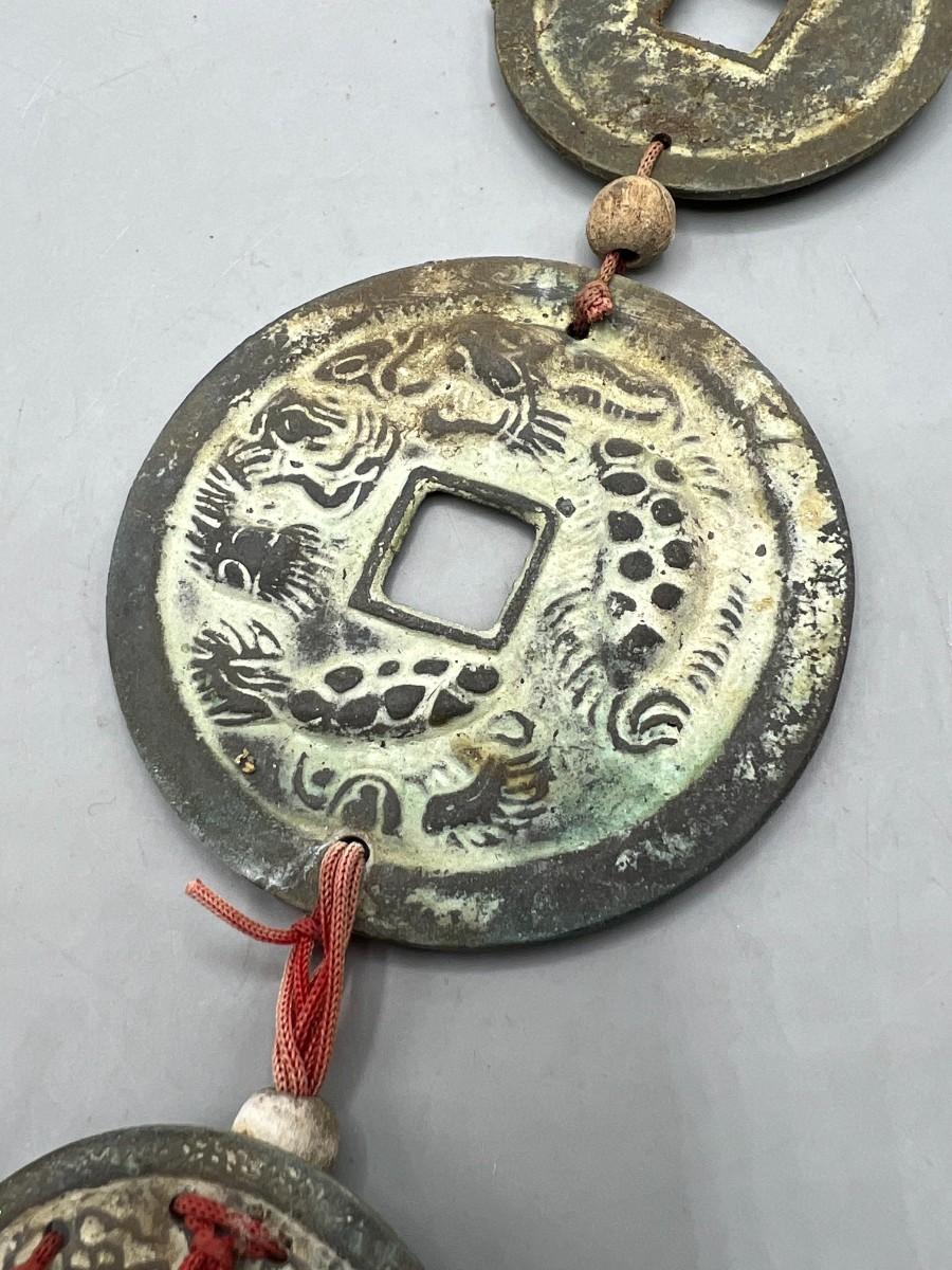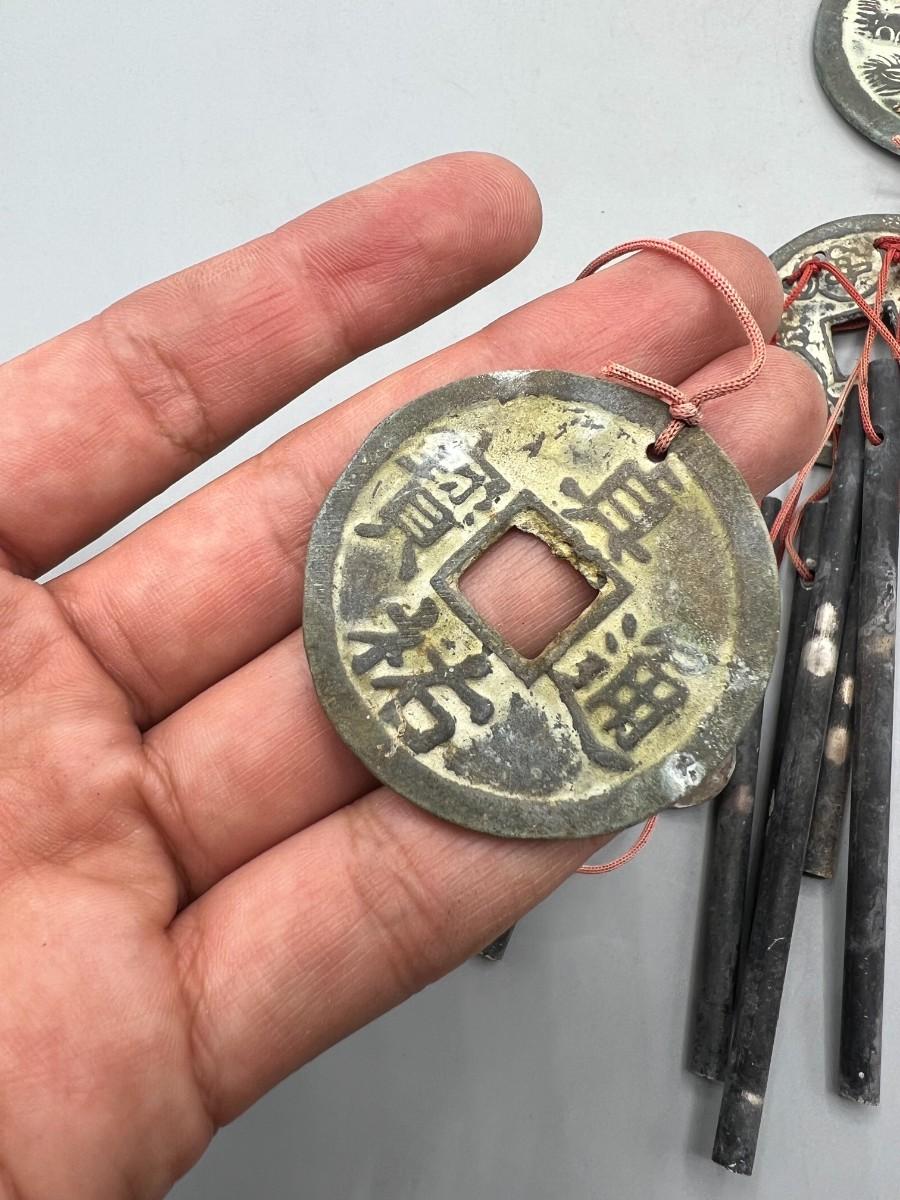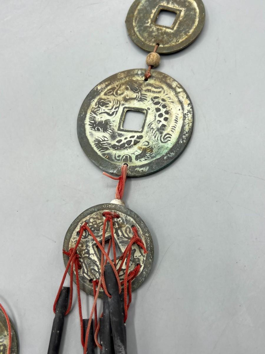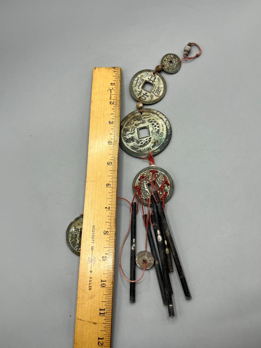 There is some light wear to the coins, but there is no damage and in good condition. The chime is on the smaller side, check the photos with the ruler.
