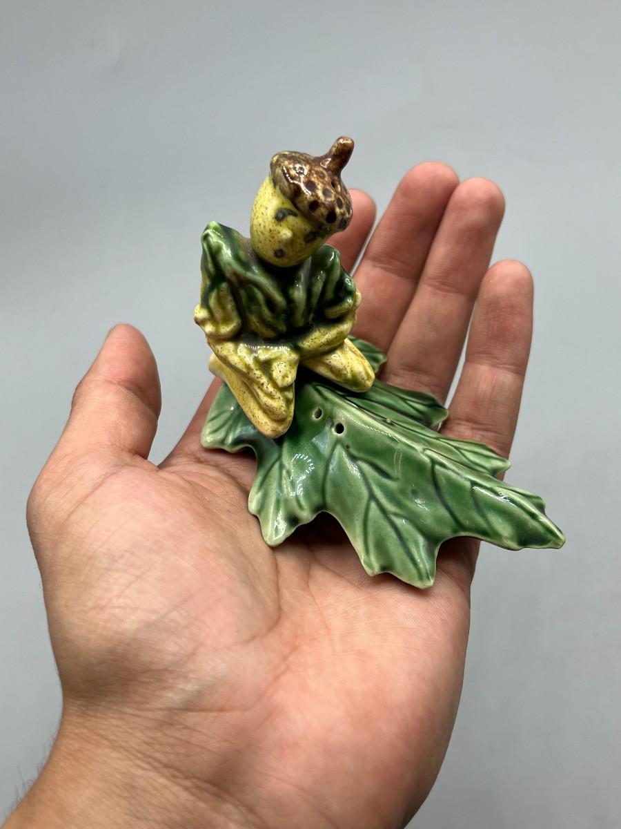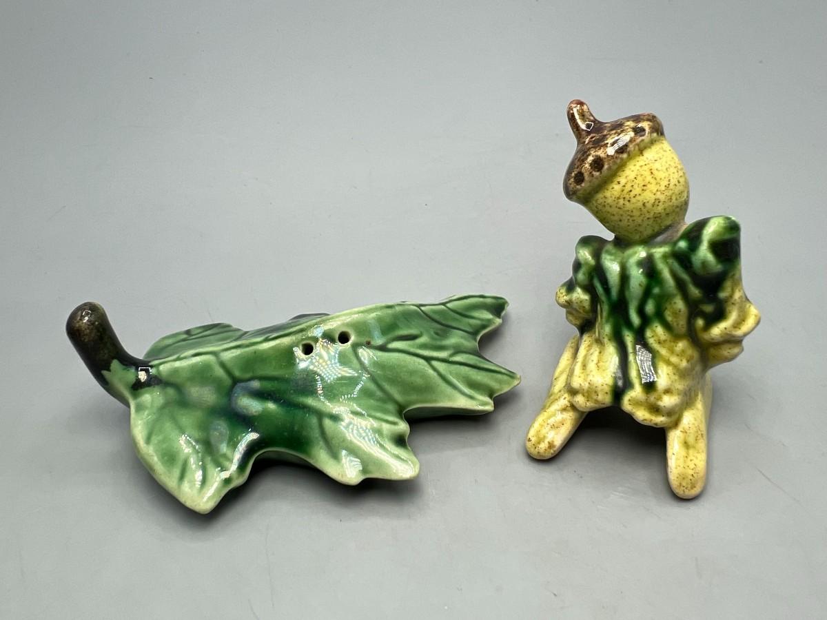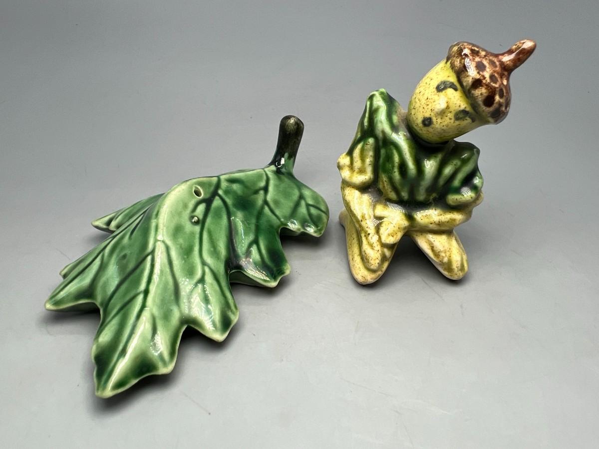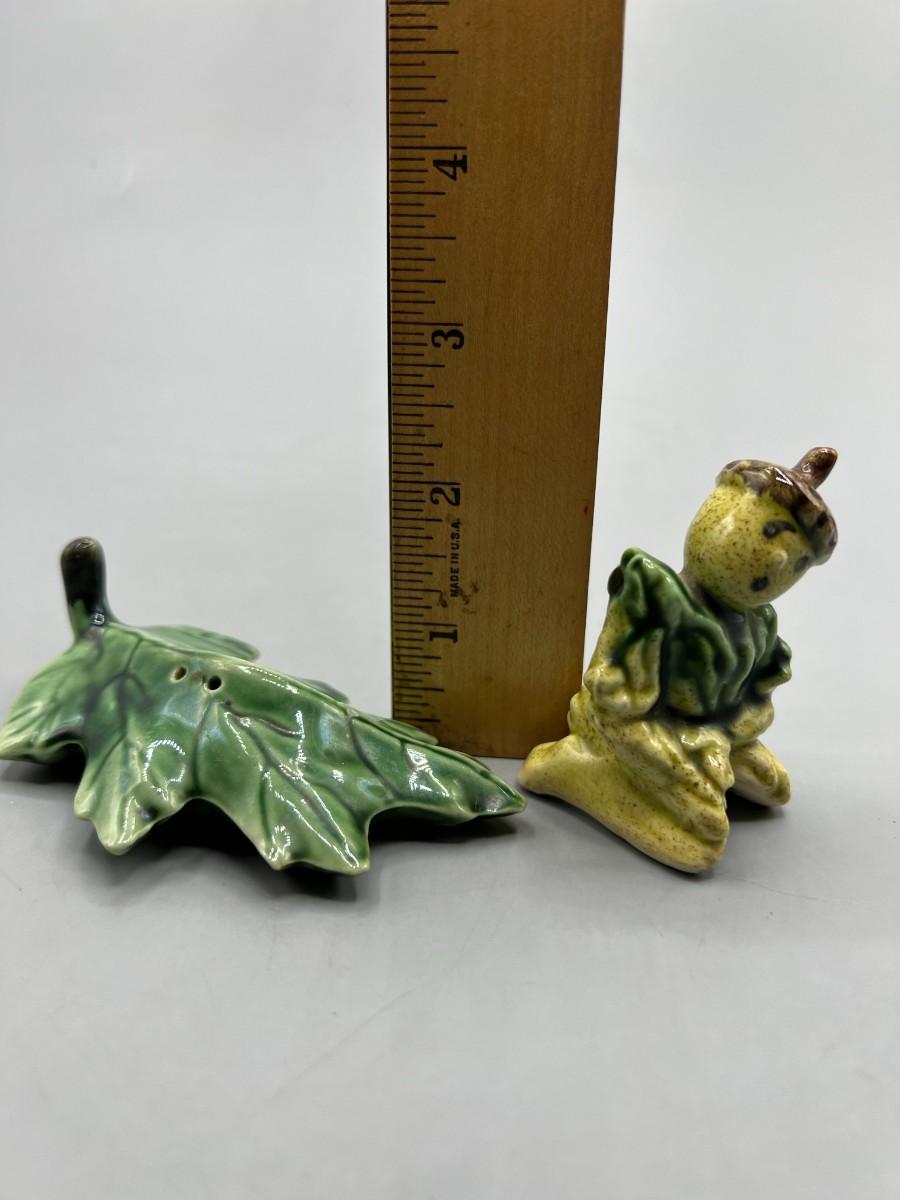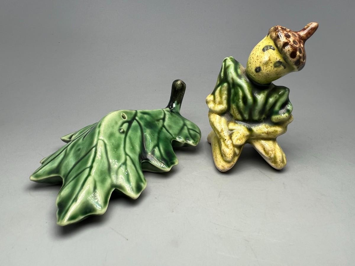 Vintage Ceramic Arts Studios Green Nature Acorn Man Figurine with Leaf Salt & Pepper Shakers