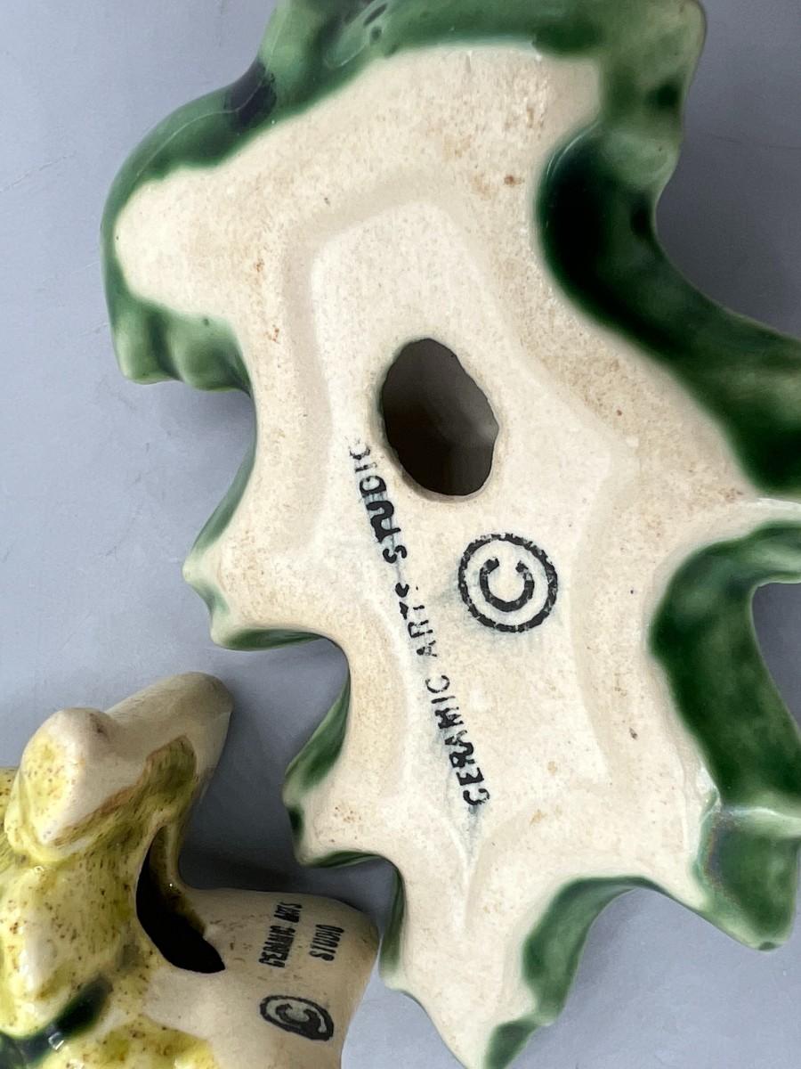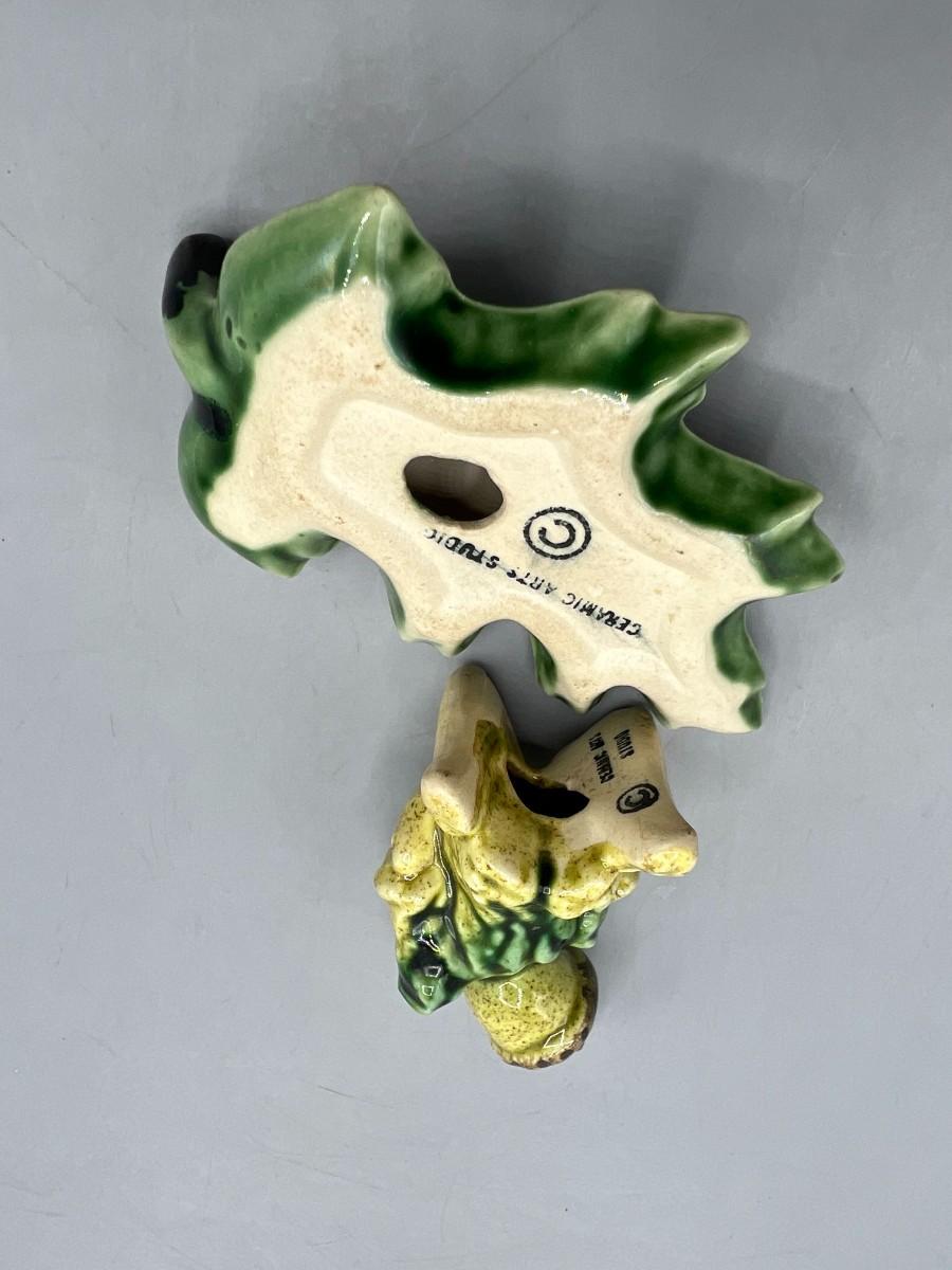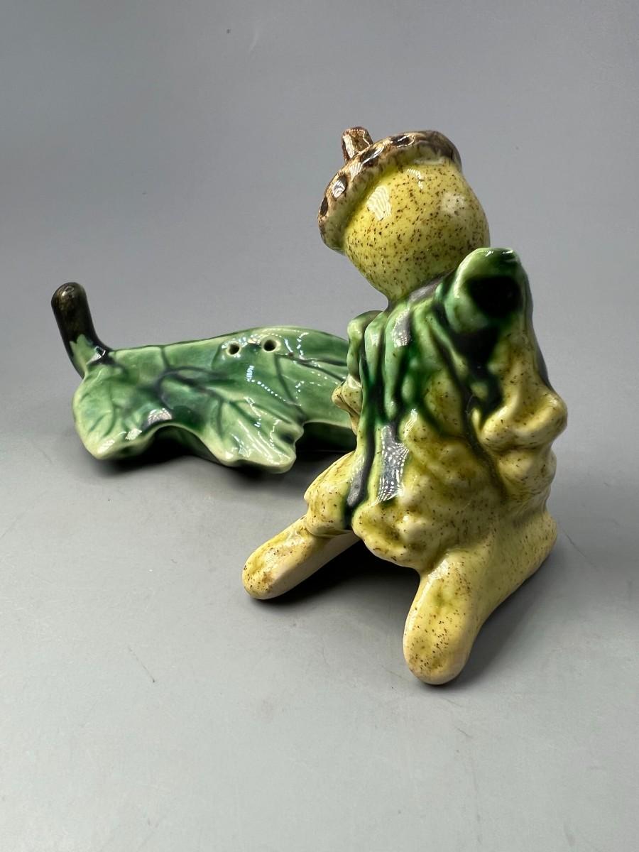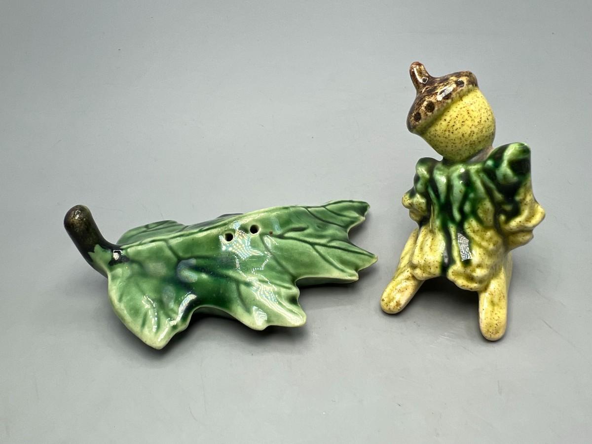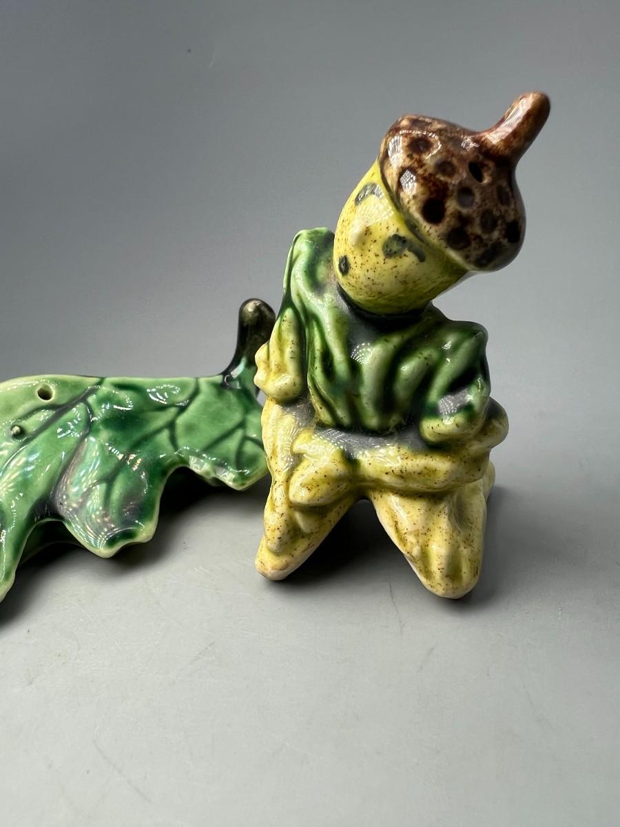 Vintage Ceramic Arts Studios Green Nature Acorn Man Figurine with Leaf Salt & Pepper Shakers
