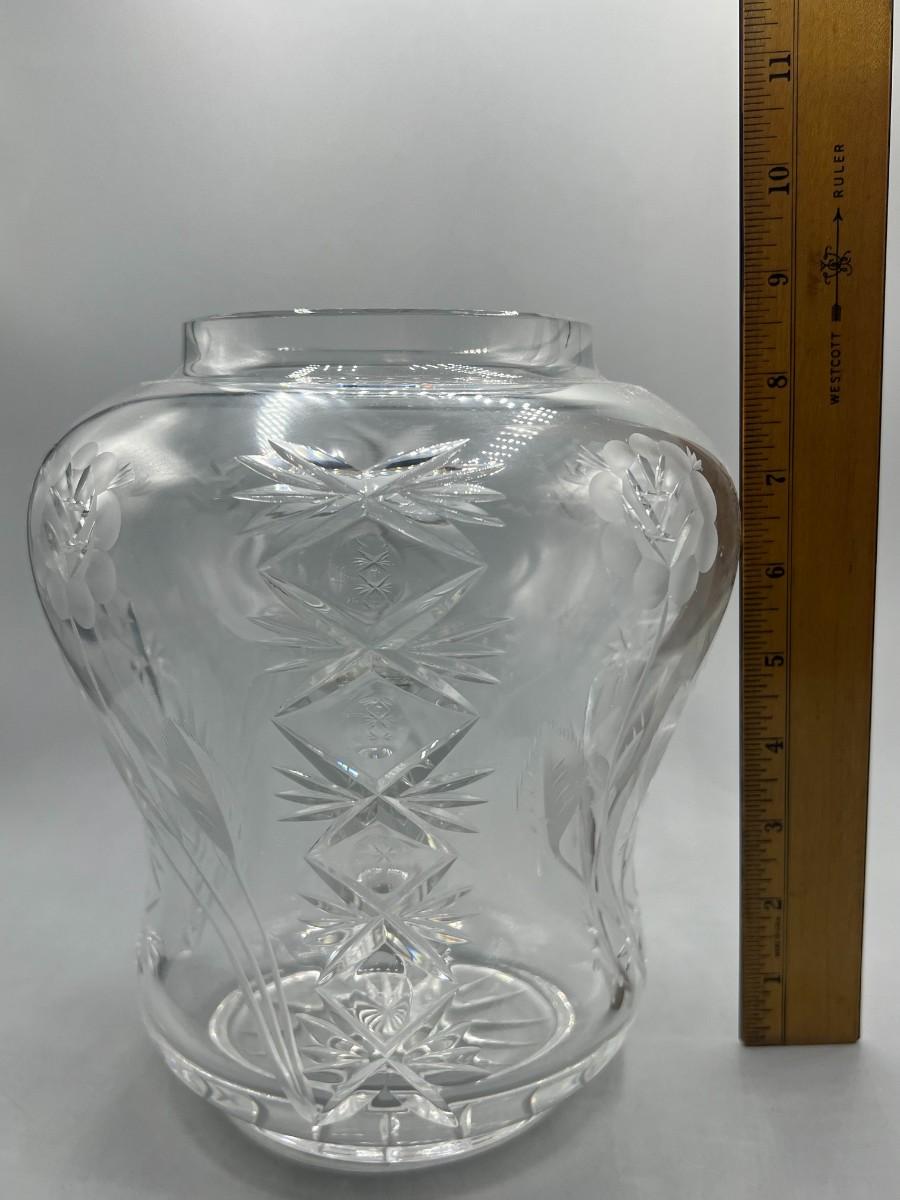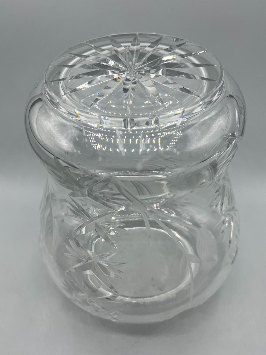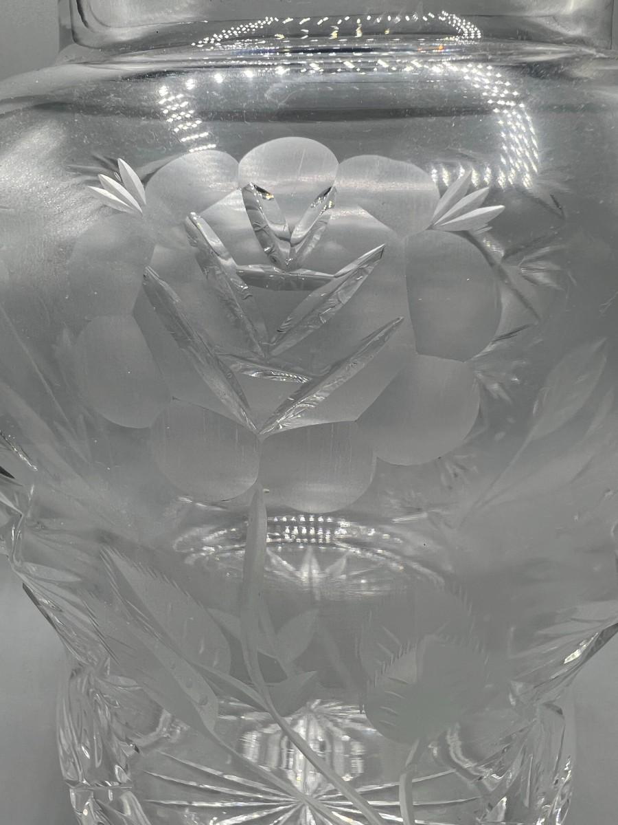 Vintage Flower Pattern Cut Crystal Urn Style Vase. In good condition. Looks like it may have been a biscuit canister or candy dish but missing the lid by looking at the top rim.