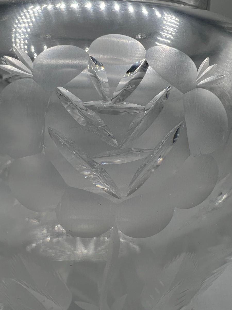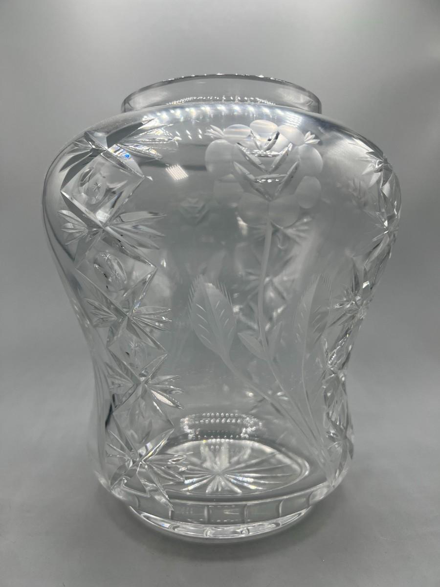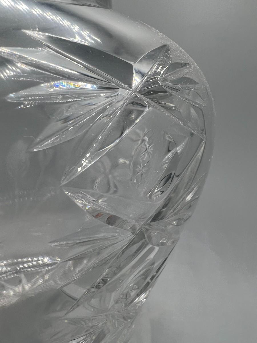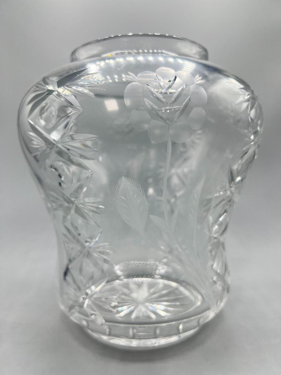 Vintage Flower Pattern Cut Crystal Urn Style Vase. In good condition. Looks like it may have been a biscuit canister or candy dish but missing the lid by looking at the top rim.