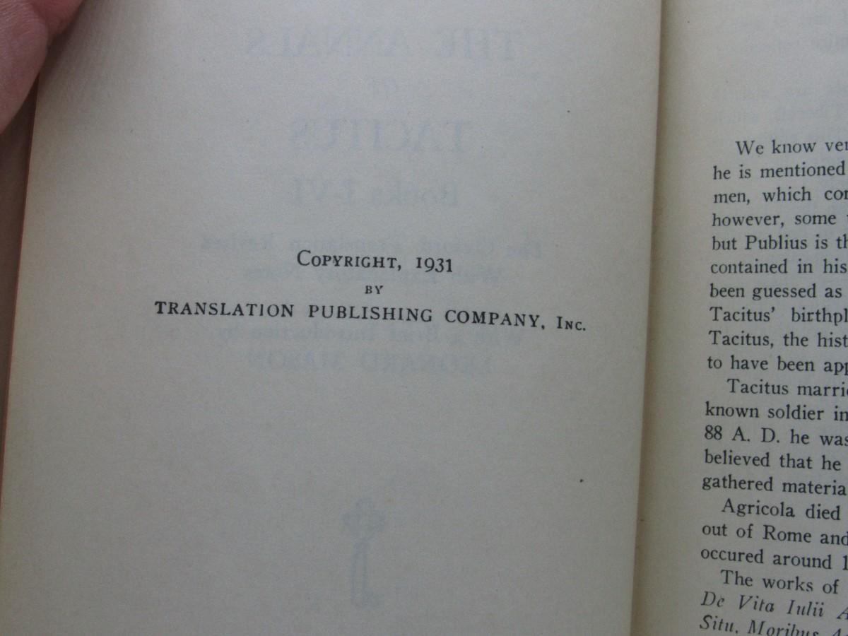 Vintage Copy of The Annals of Tacitus Books I-VI Students Literal Translations Hardcover Book 1931. In good vintage condition.