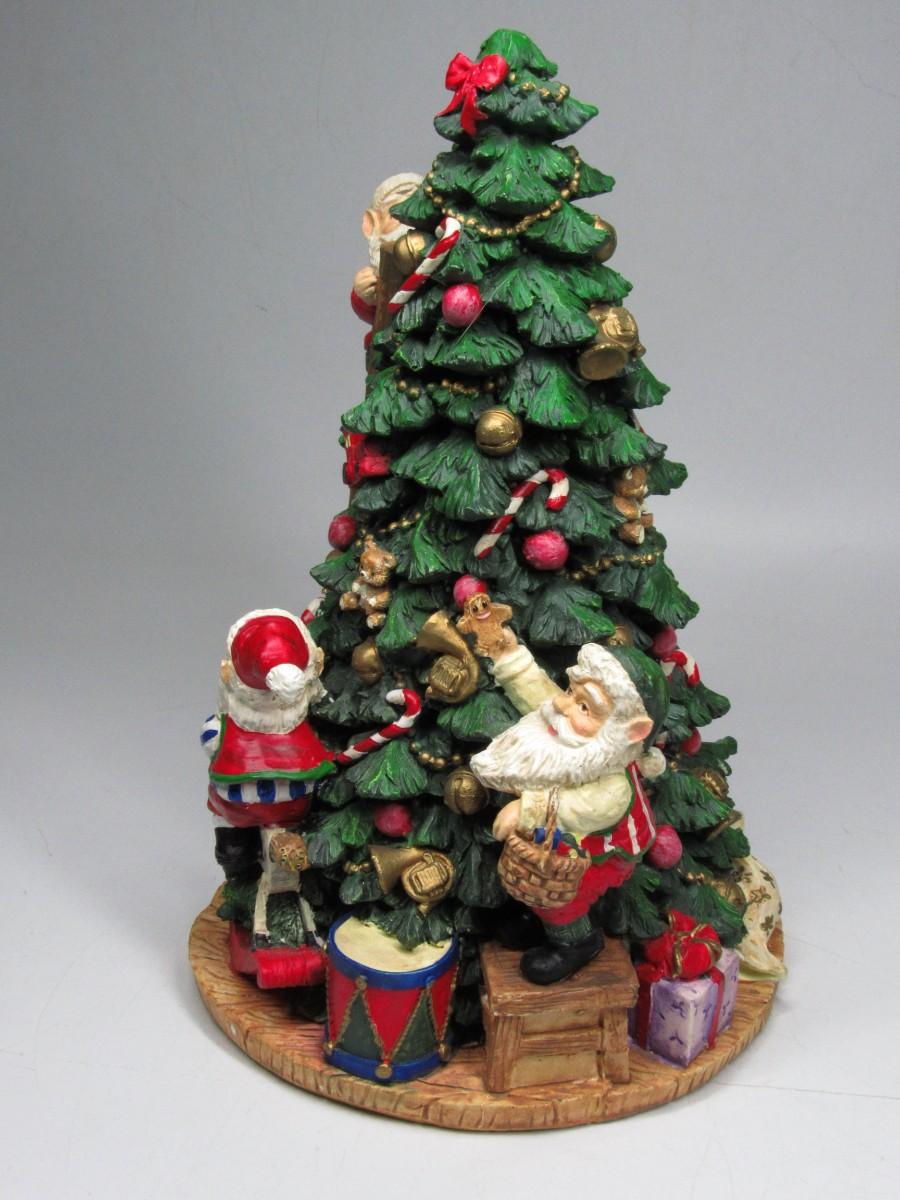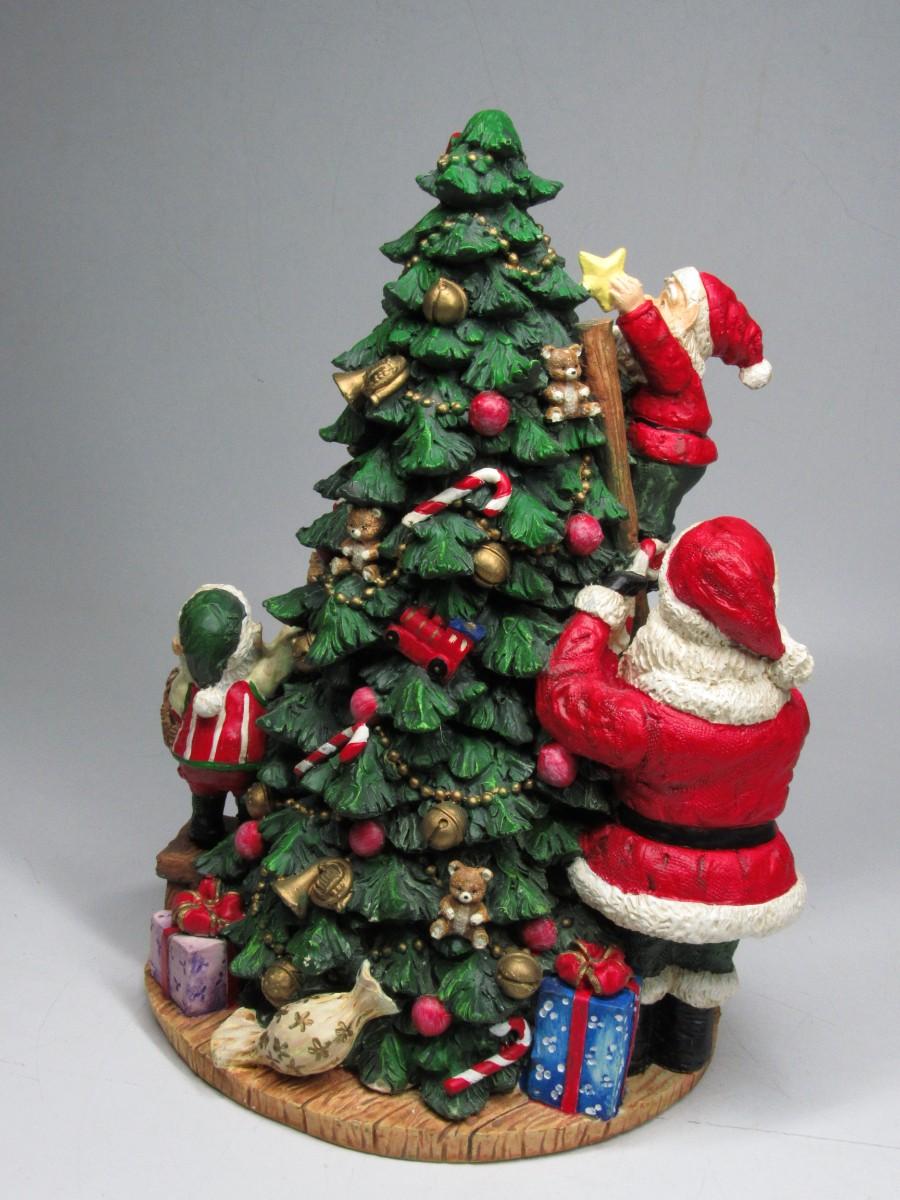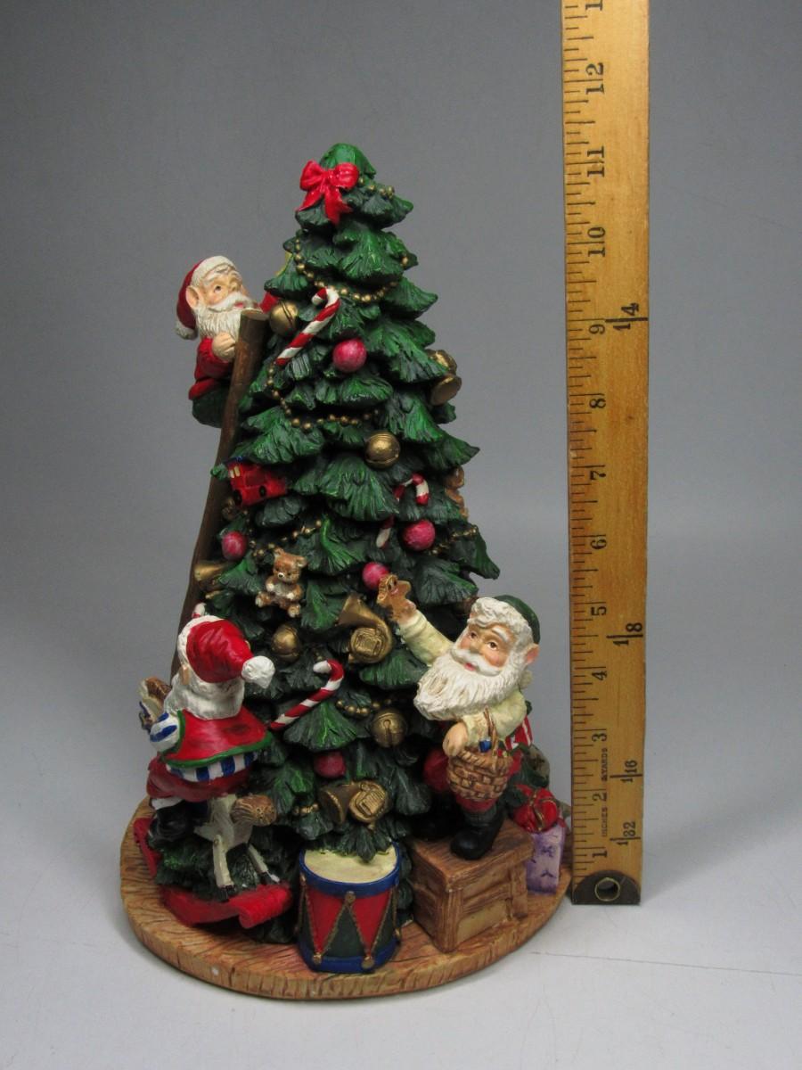 Santa Claus and Elves Decorating Holiday Tree Christmas Figurine with Original Box. Was given as a gift in 1996 according to the bottom of tree. In good condition. About 11" size.