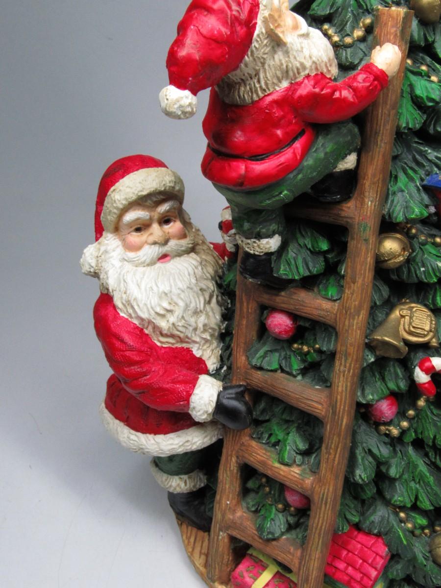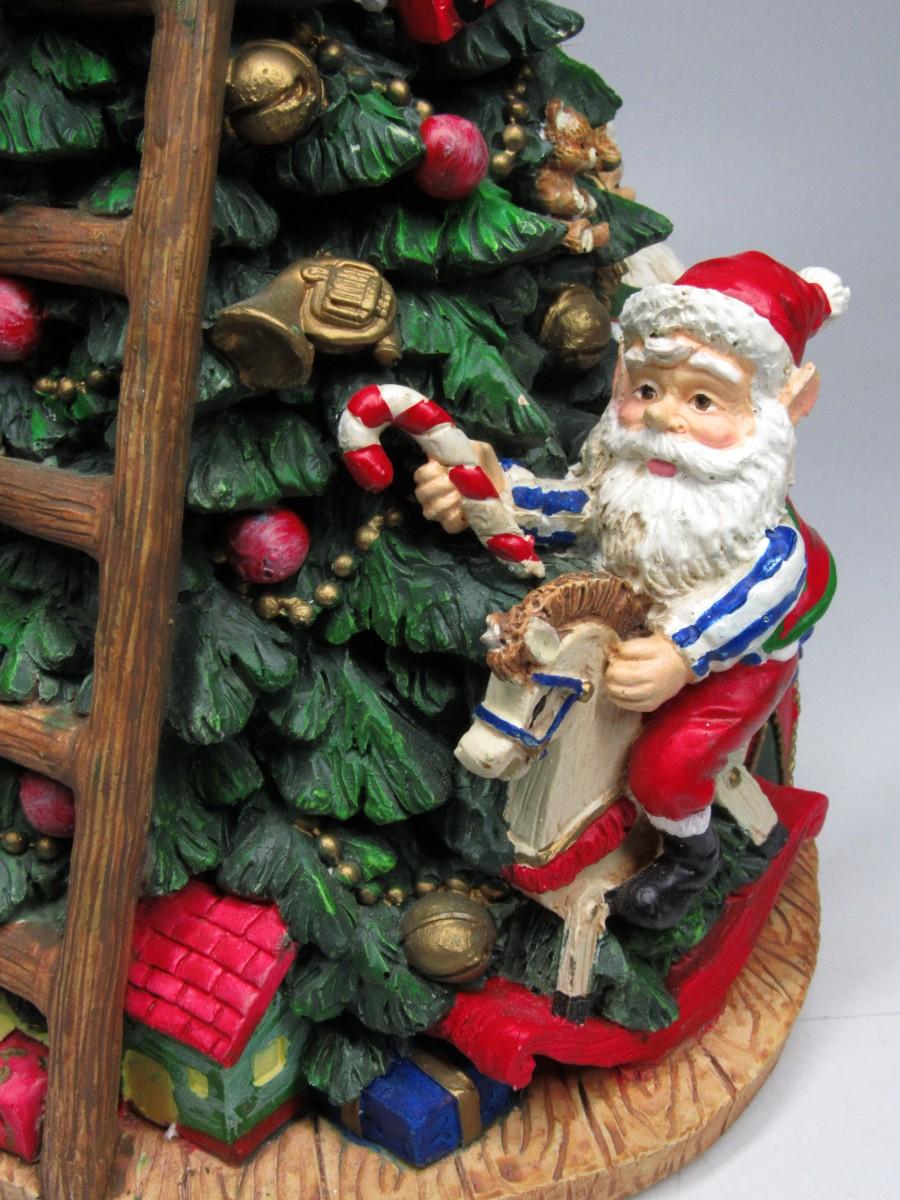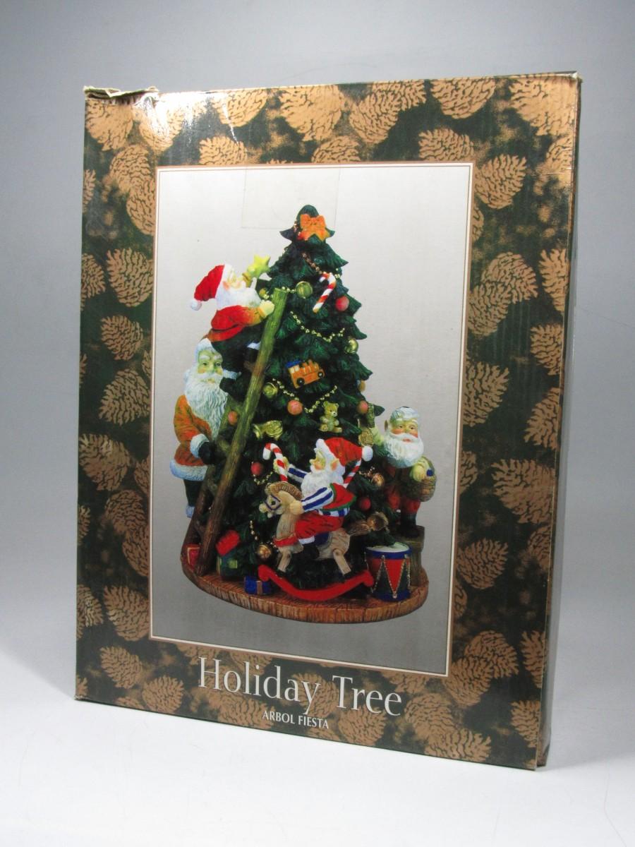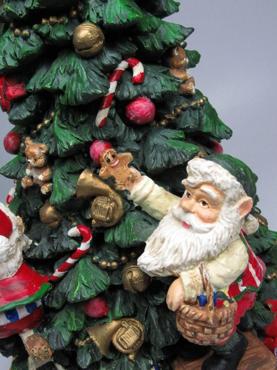 Santa Claus and Elves Decorating Holiday Tree Christmas Figurine with Original Box. Was given as a gift in 1996 according to the bottom of tree. In good condition. About 11" size.