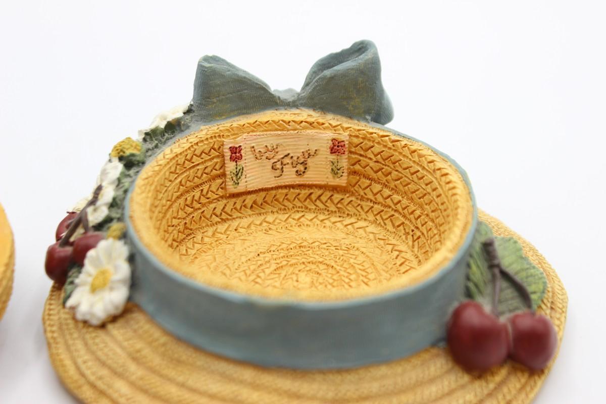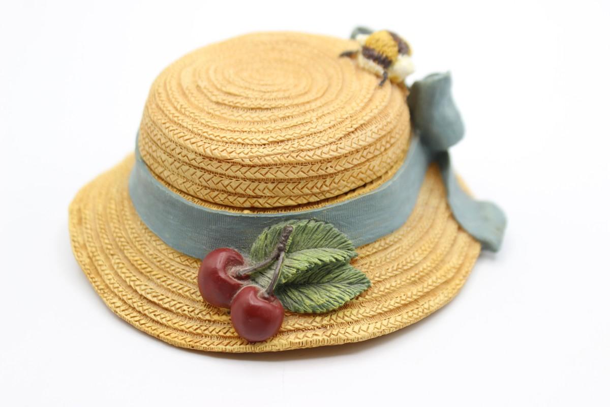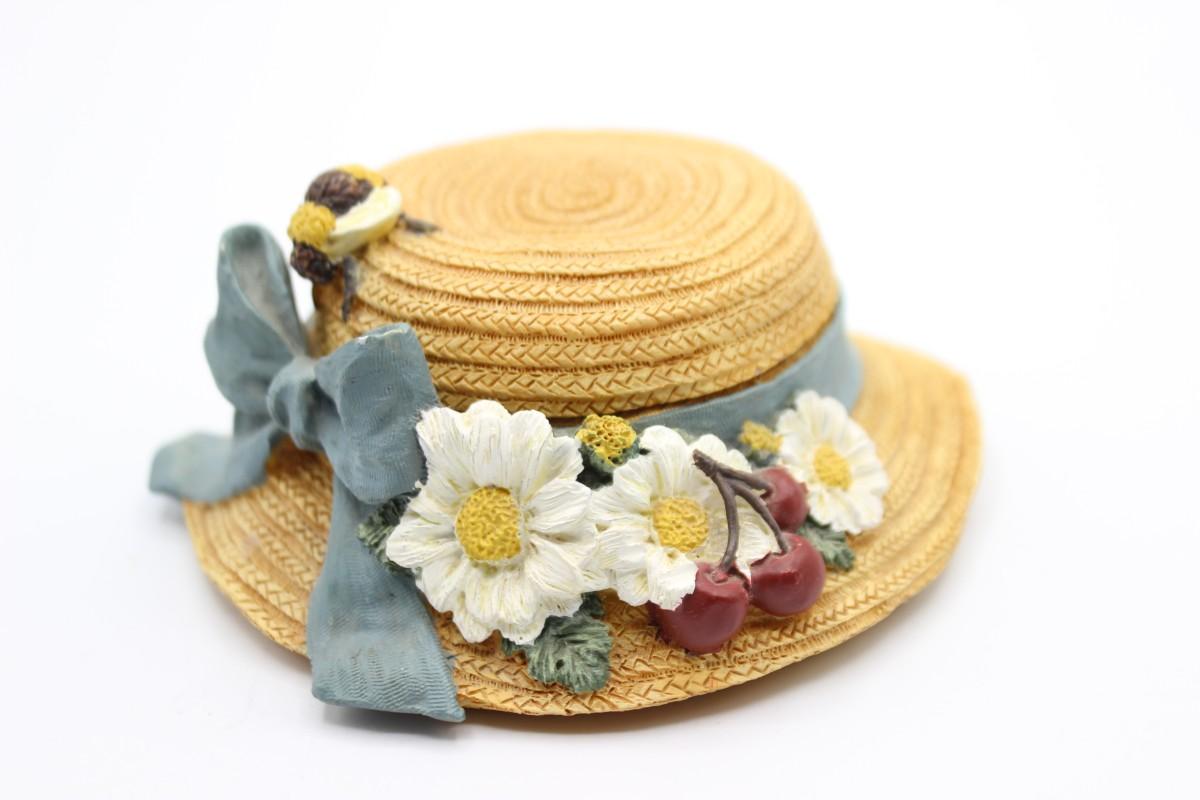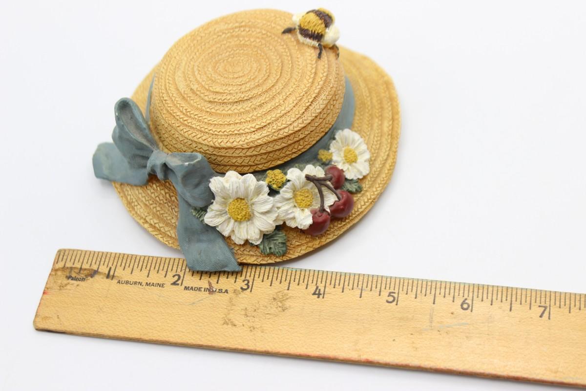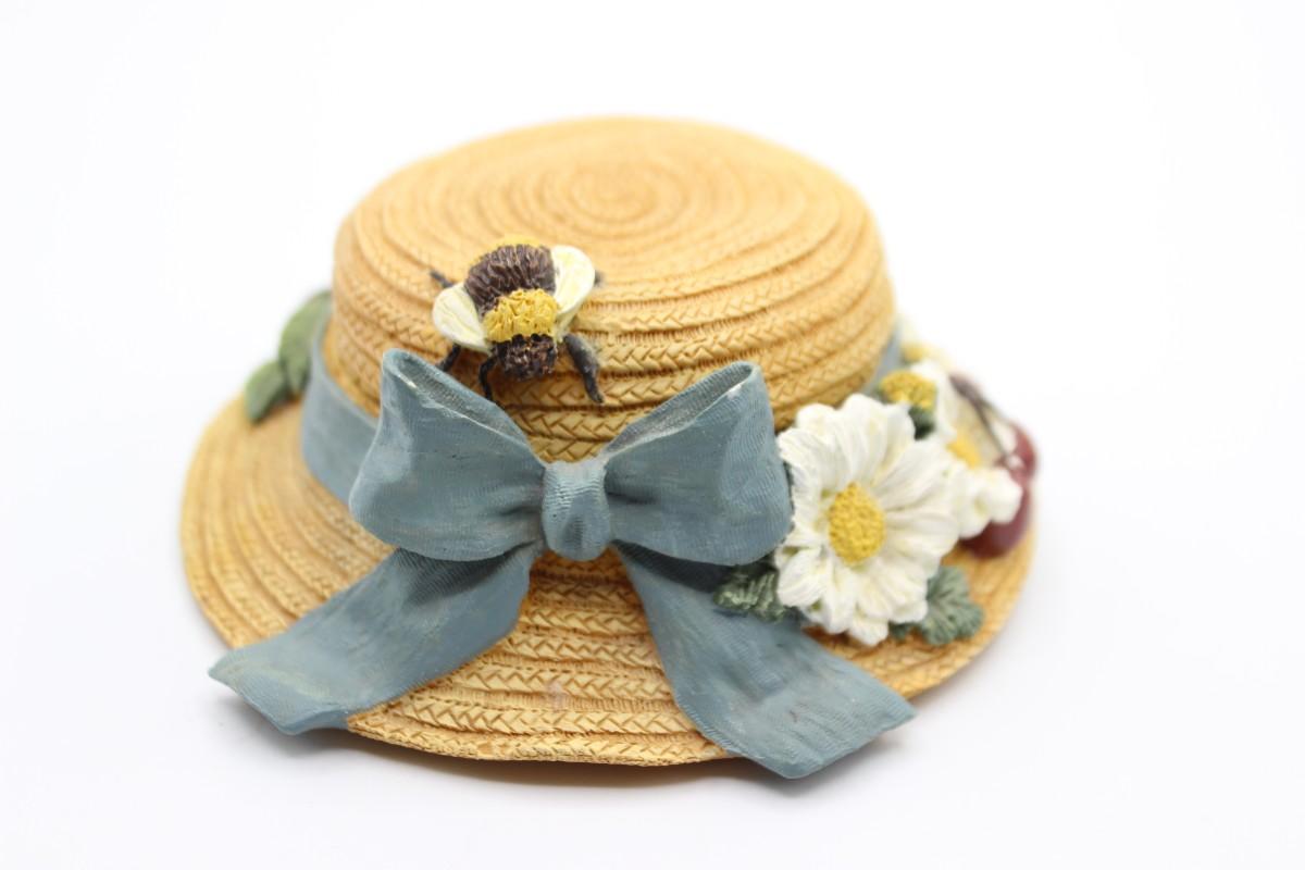 Retro Resin Straw Hat Bumble Bee Blue Ribbon Flowers Cottagecore Trinket Box