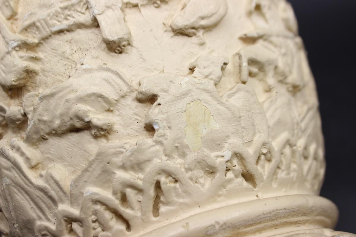 There are scuff marks and small chipped pieces of plaster on the surface of the vase, but there is no significant damage and is in good condition. Check pictures for more details and sizing.