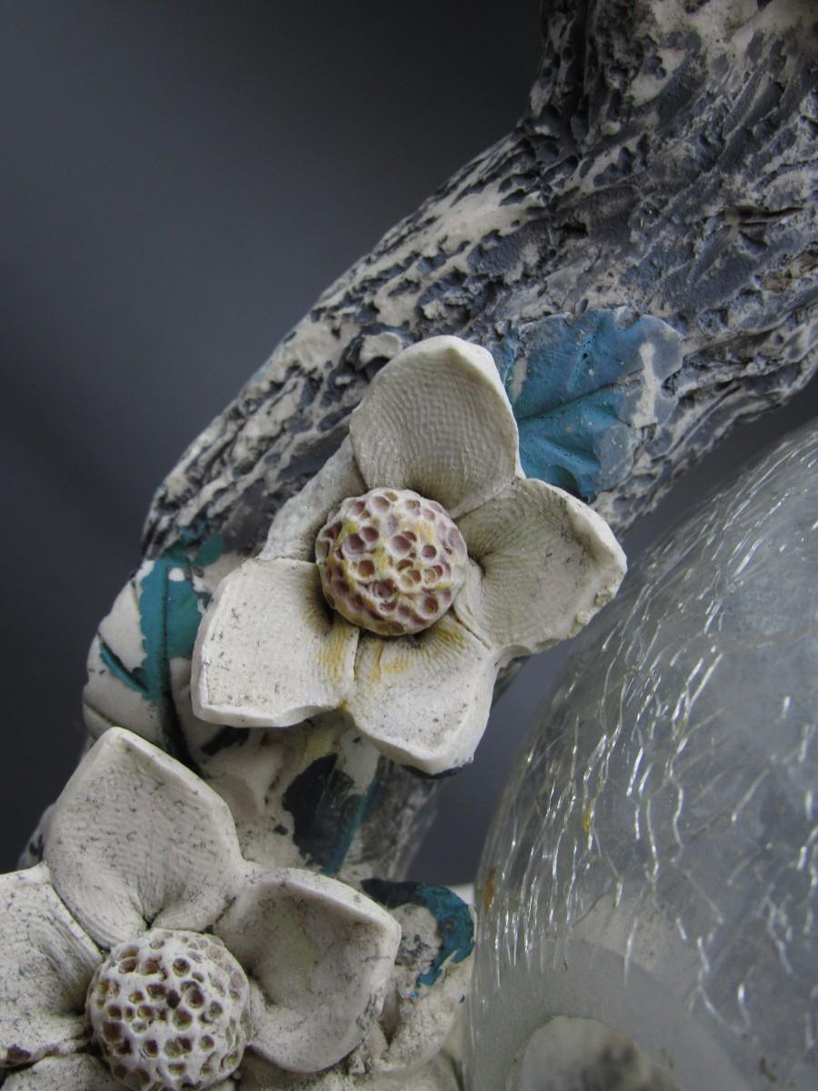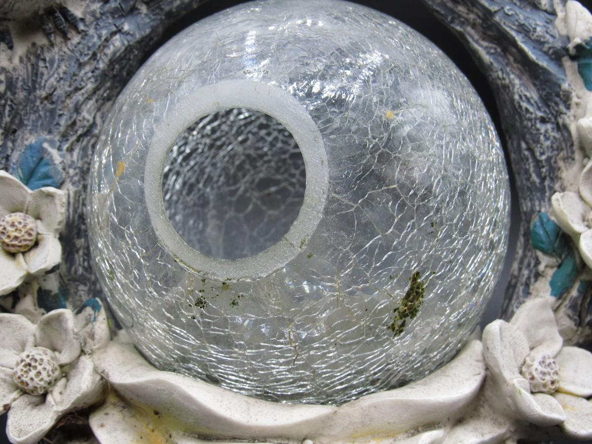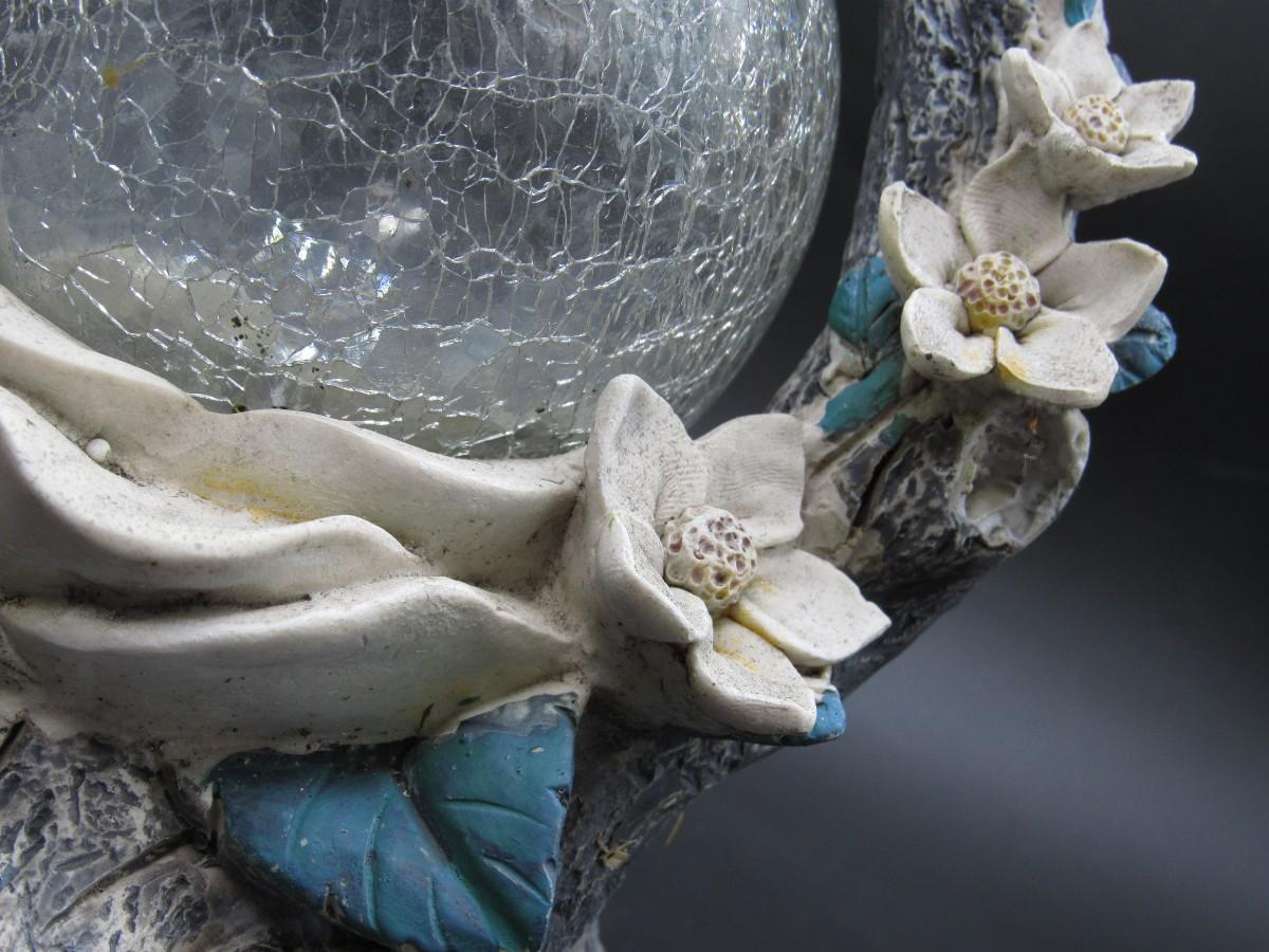There is wear all over the yard art piece and there is a chipped flower petal. Check pictures for more details and for sizing.
