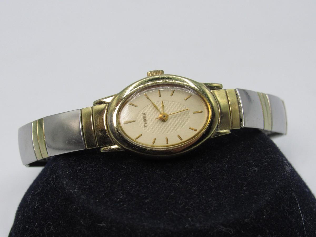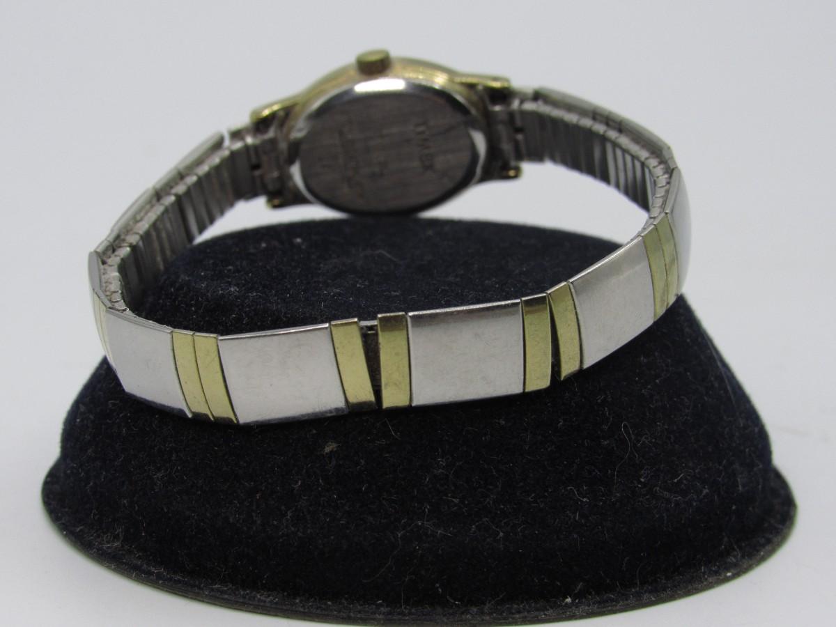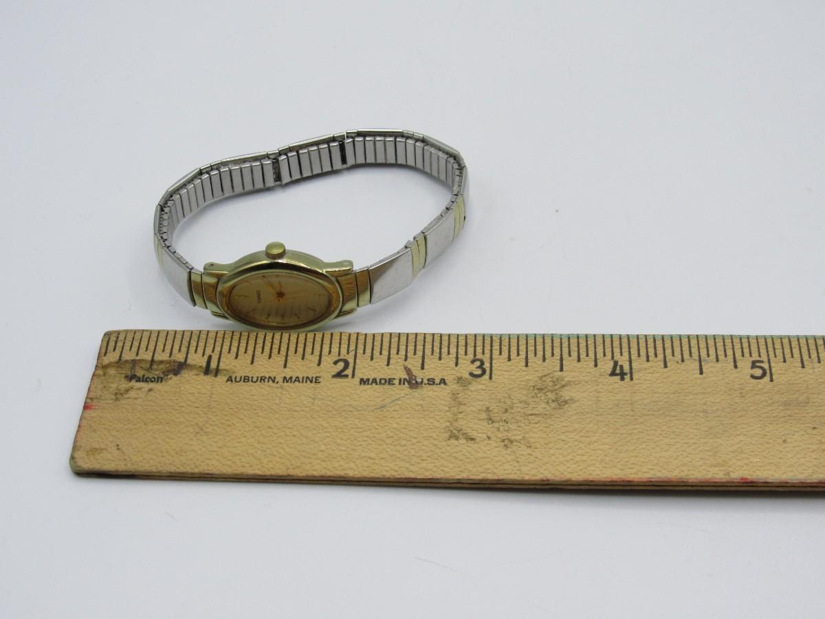 Timex Watch Silver Tone Dial Oval Case Gold Tone Two Toned Stretch Band