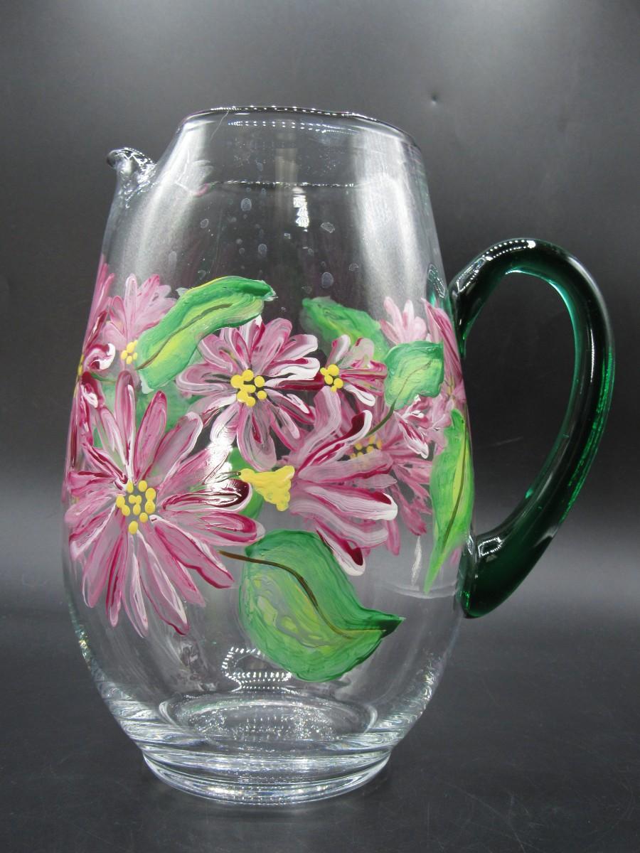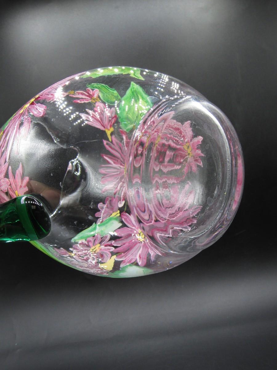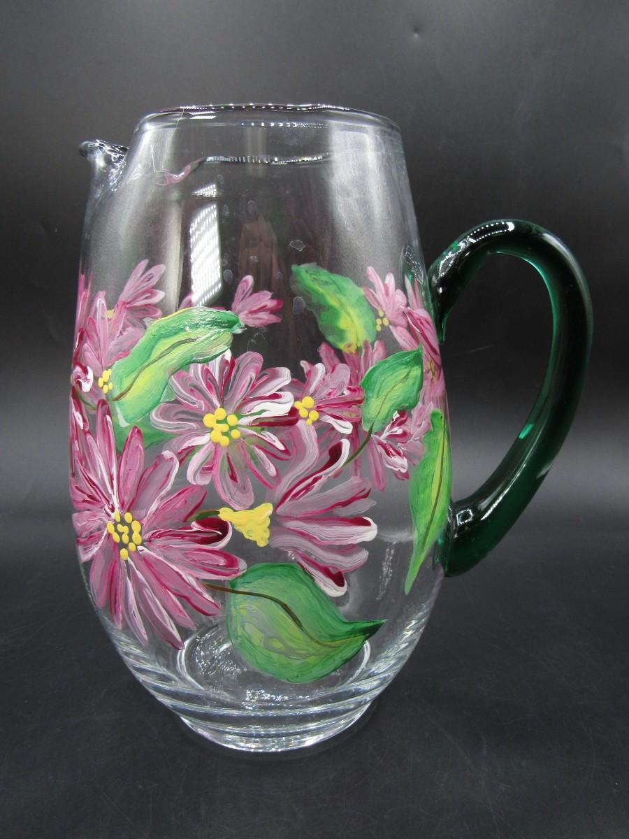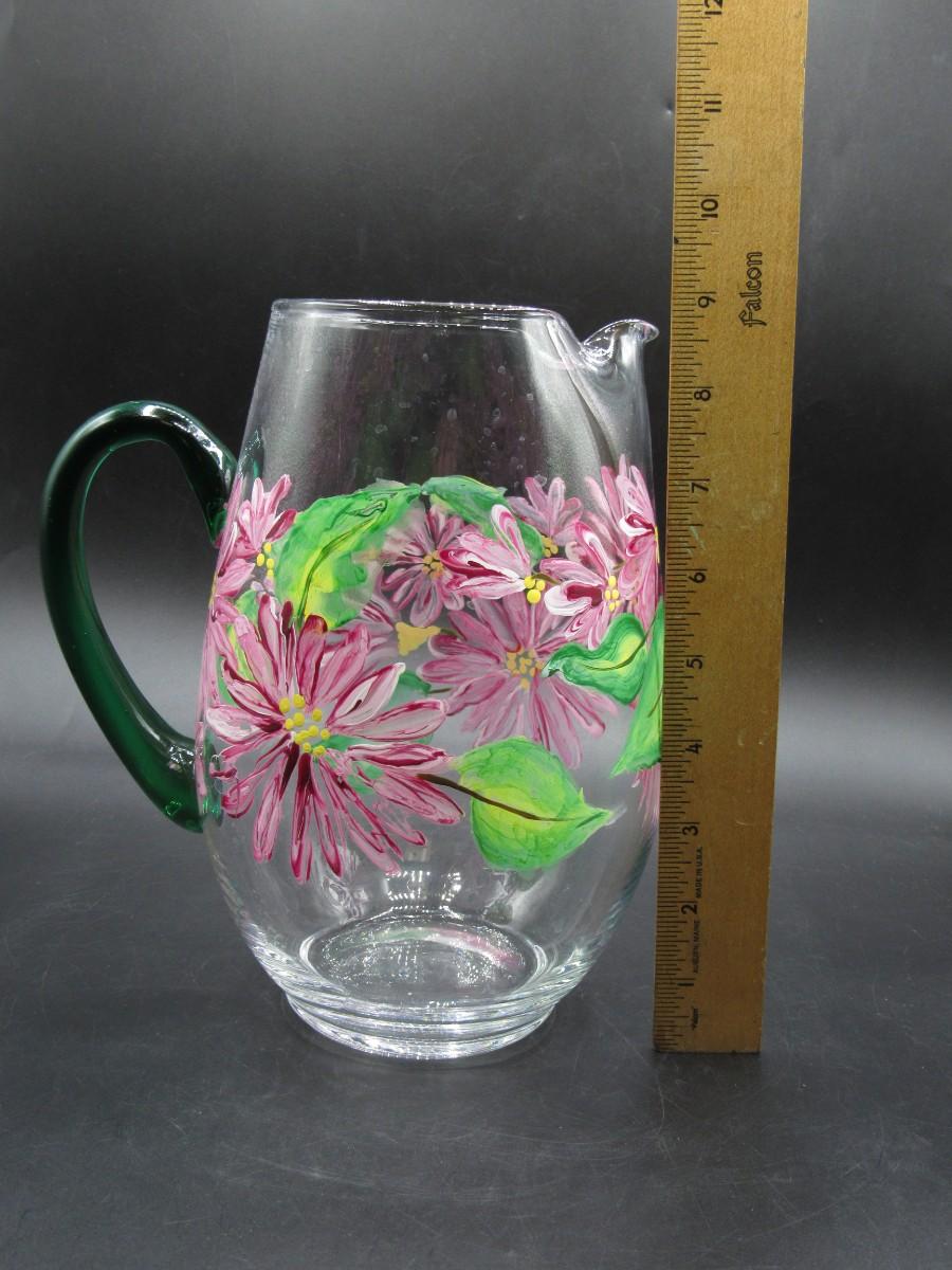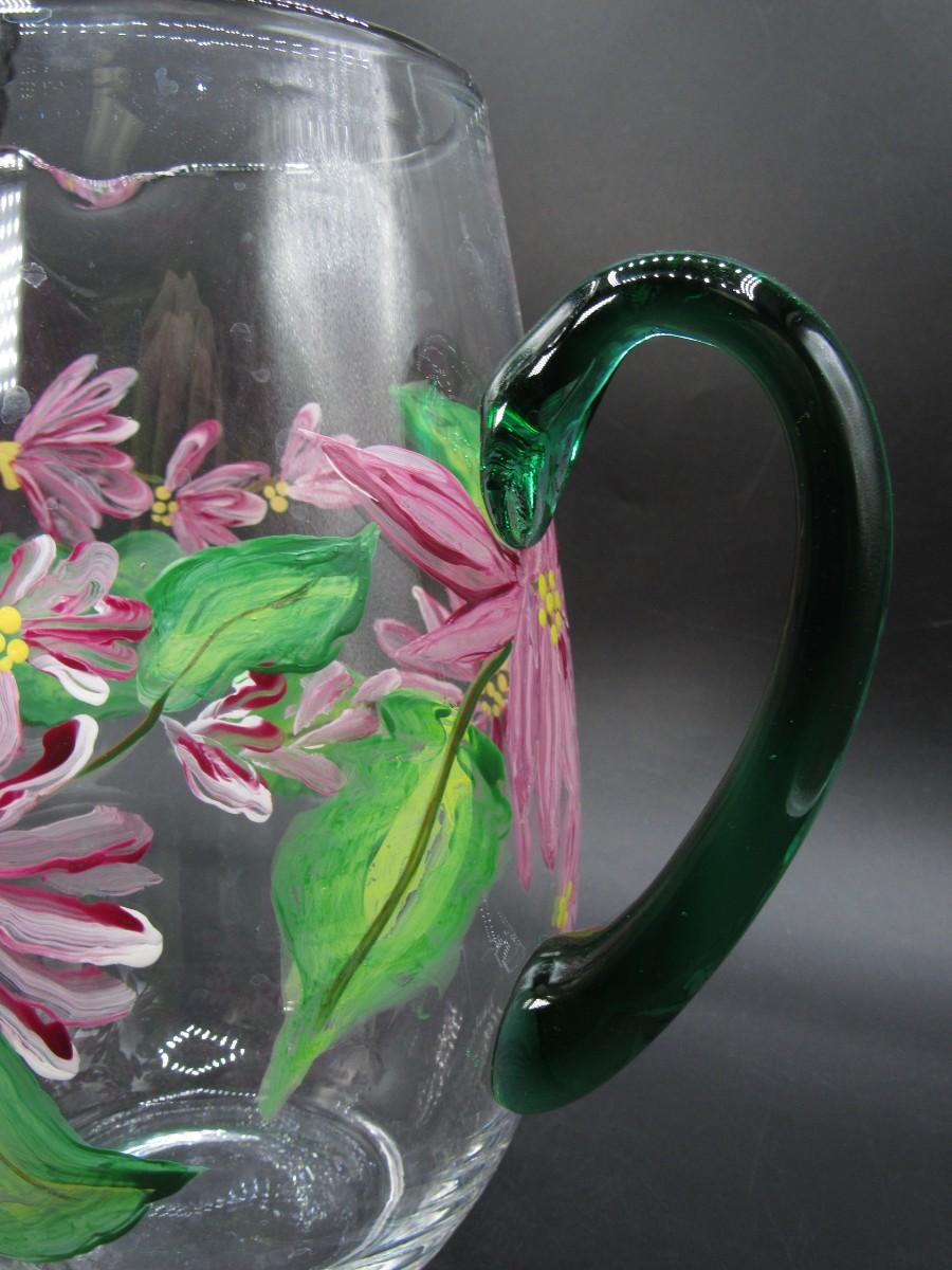 Vintage Handpainted Groovy Purple Flowers Glass Serving Pitcher with Green Handle