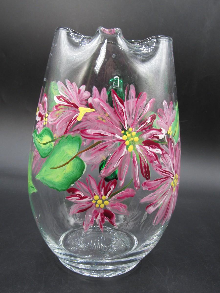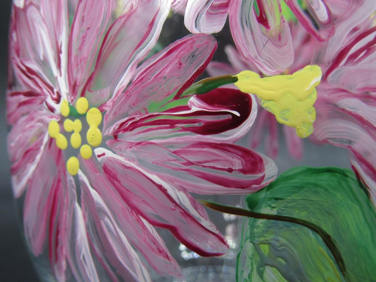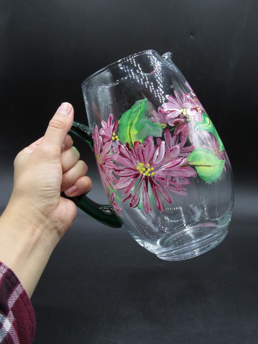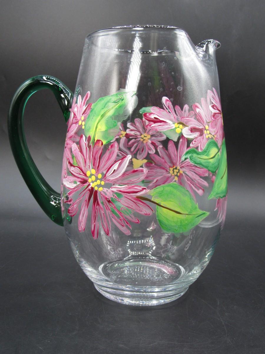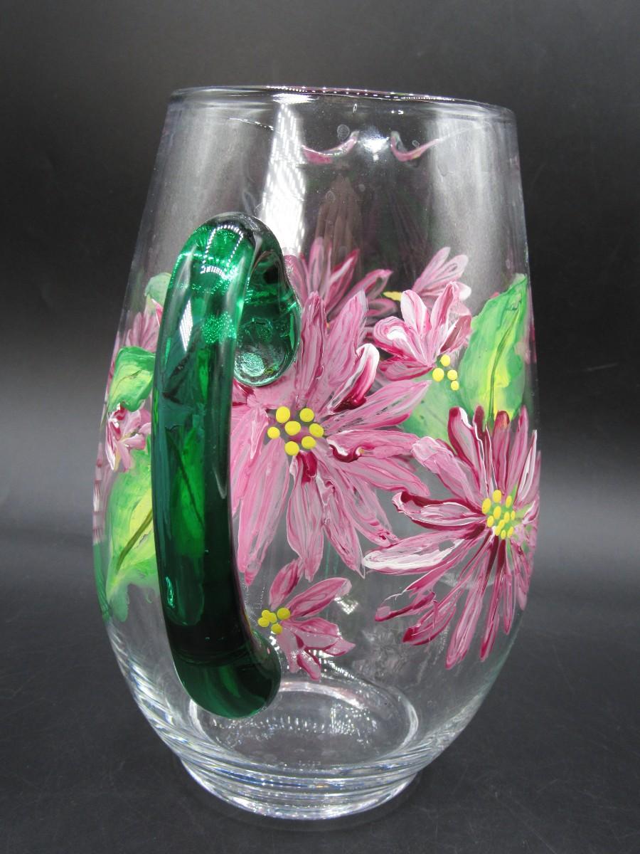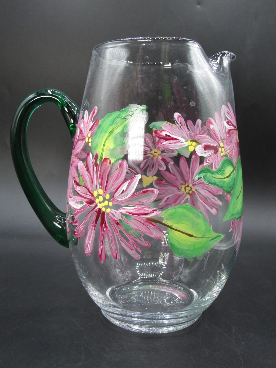 Vintage Handpainted Groovy Purple Flowers Glass Serving Pitcher with Green Handle