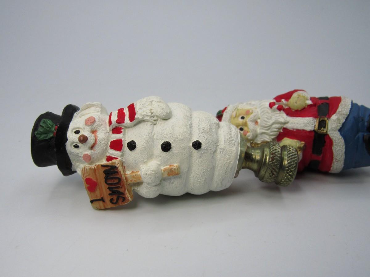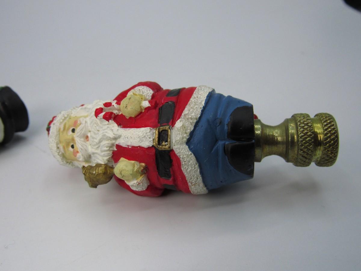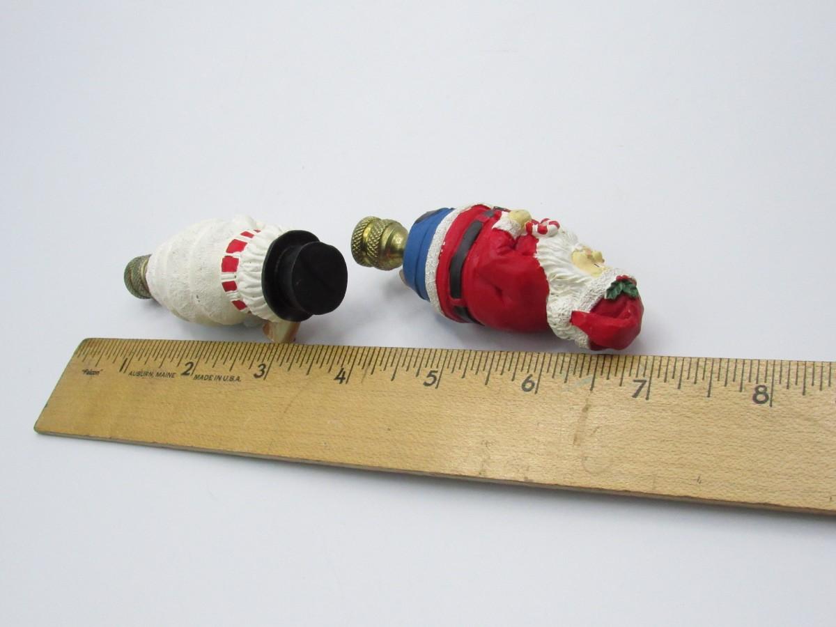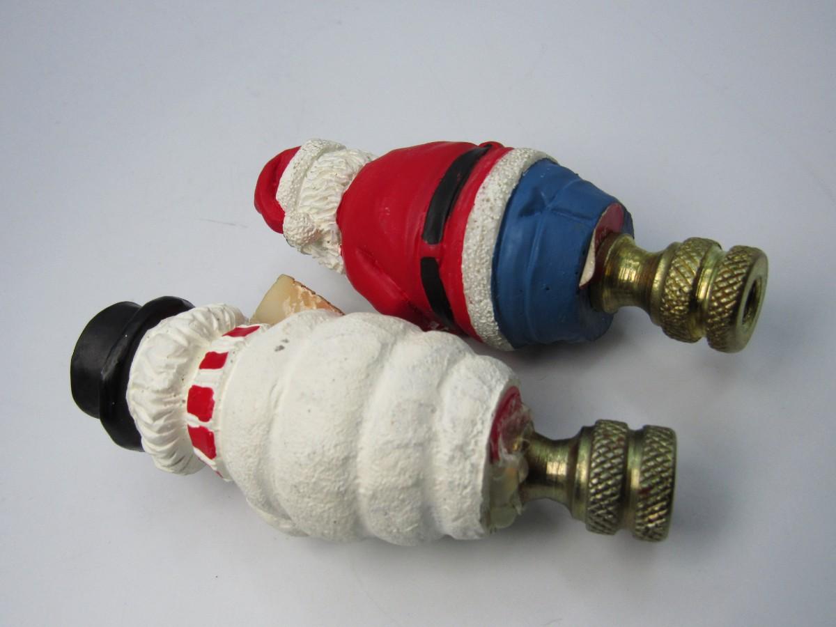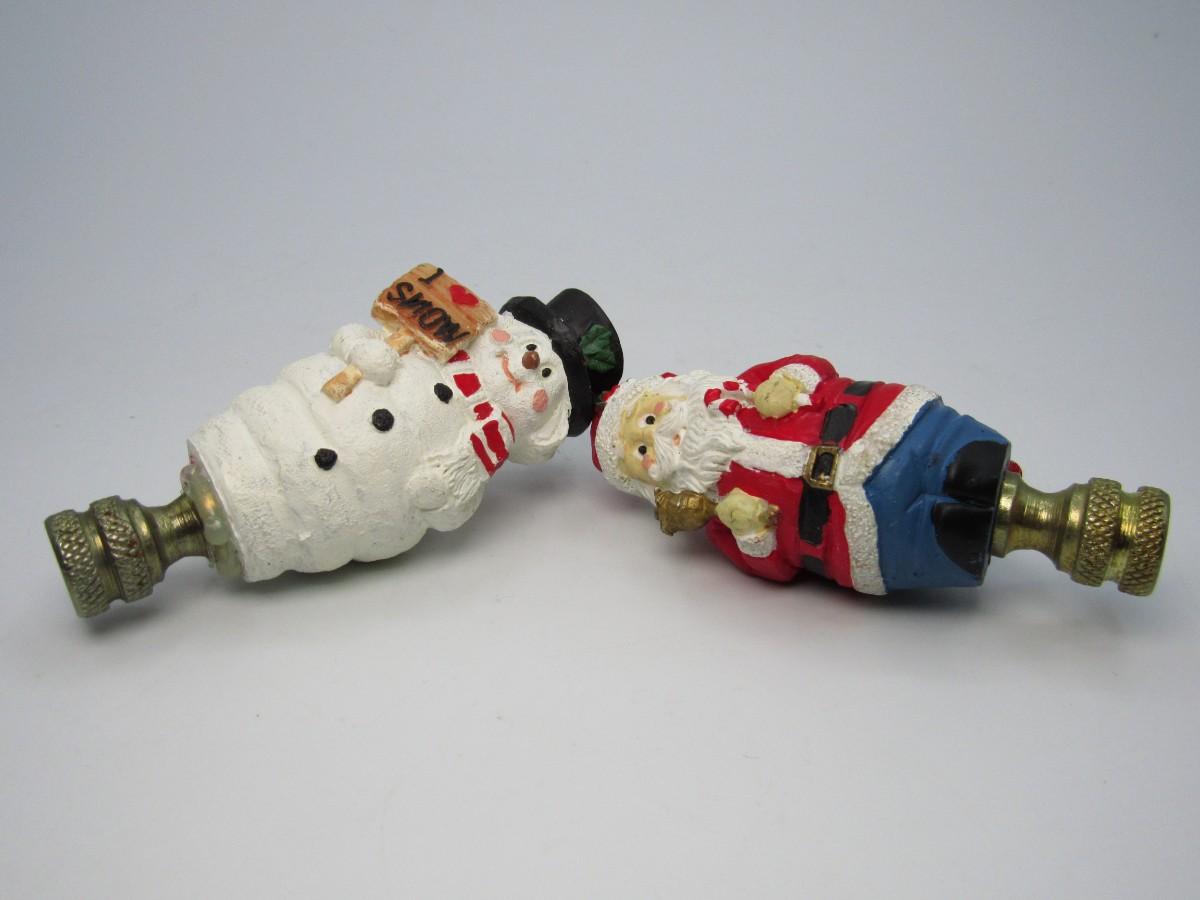 Pair of Christmas Holiday Finial Lamp Shade Toppers Snowman Holding Sign & Jolly Santa Claus