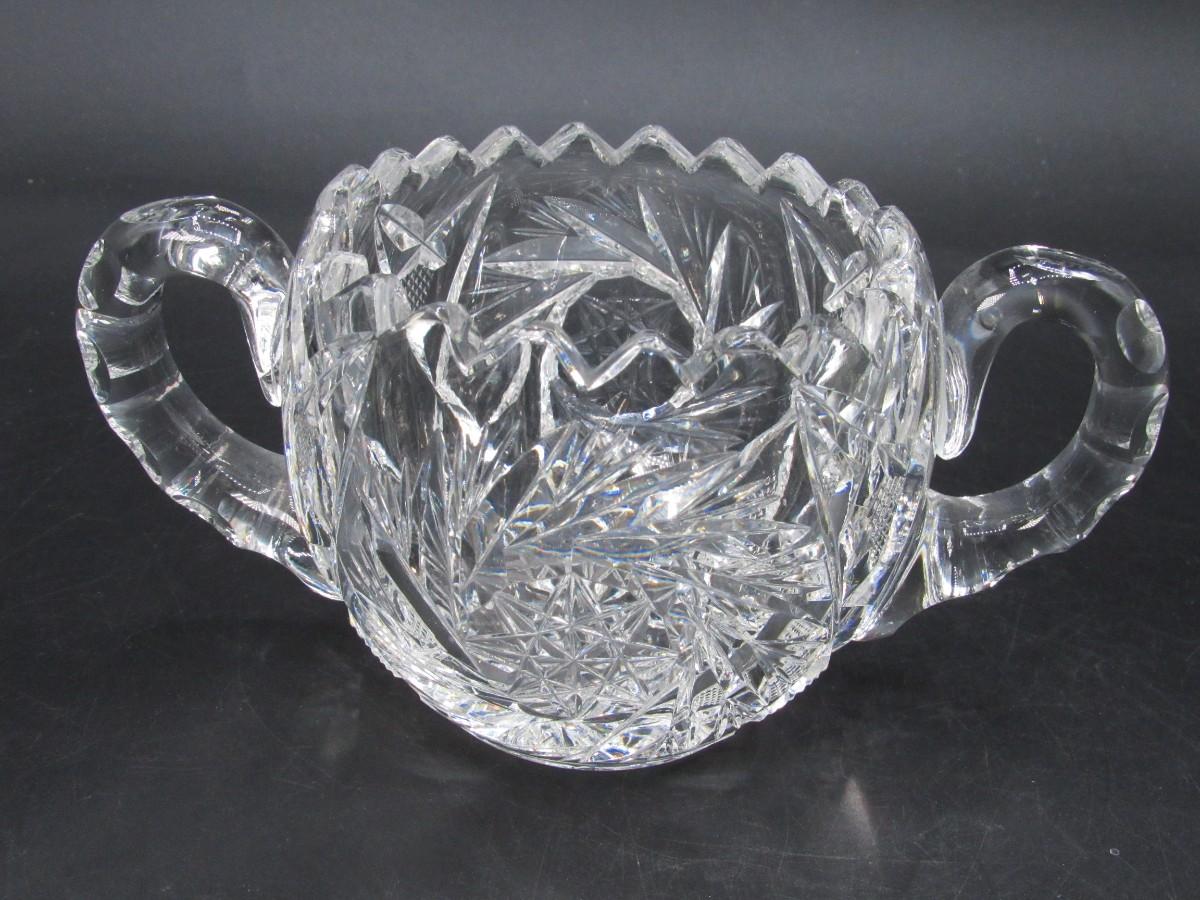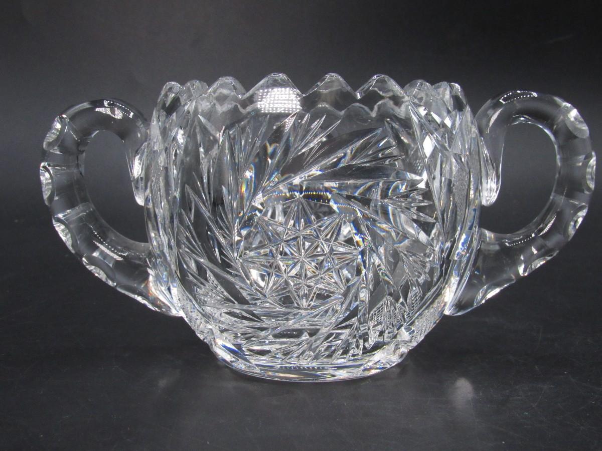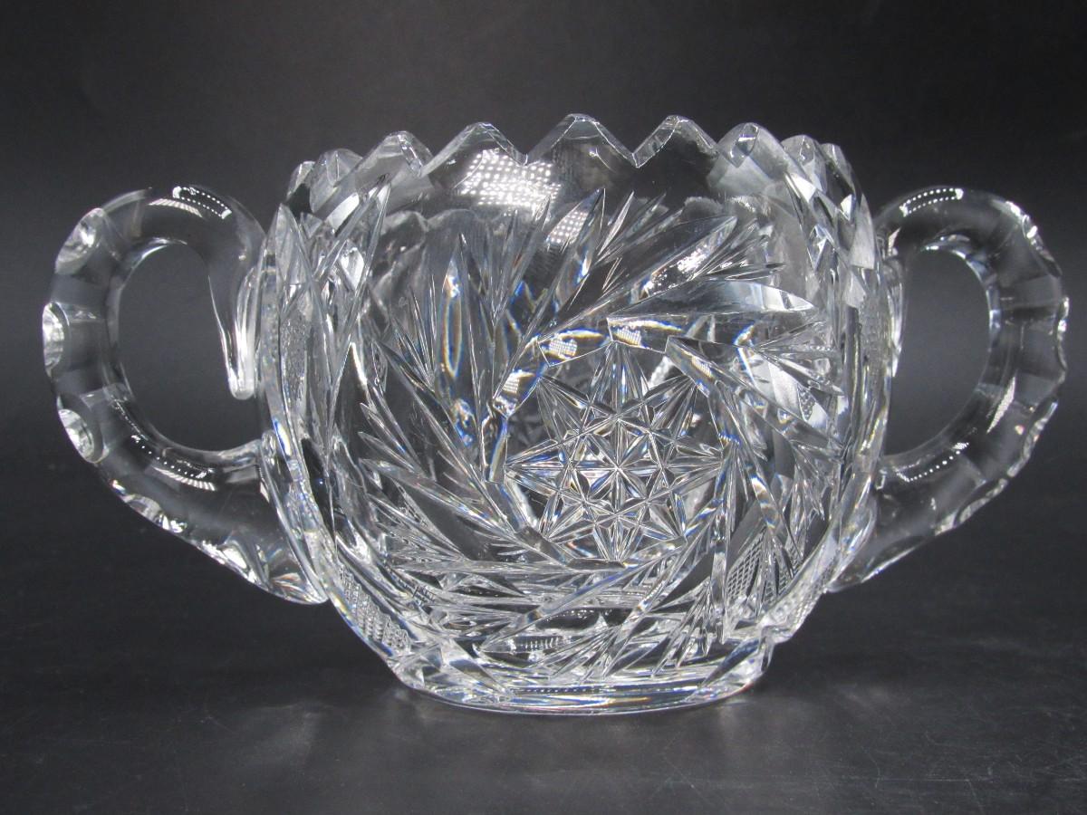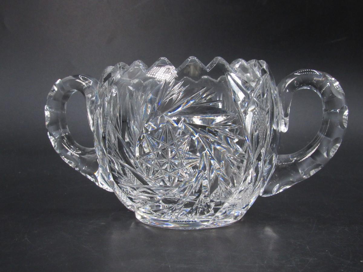 Antique American Brilliant Sugar Bowl Heavy Cut Crystal Glass Sawtooth Edge 2 Handles