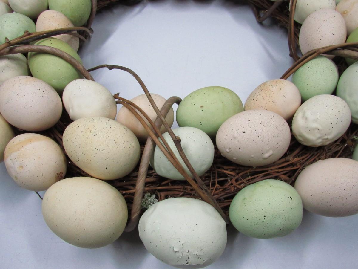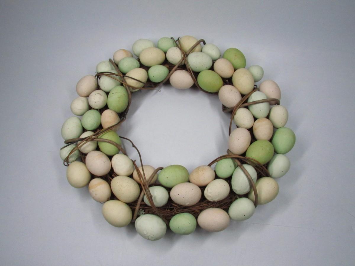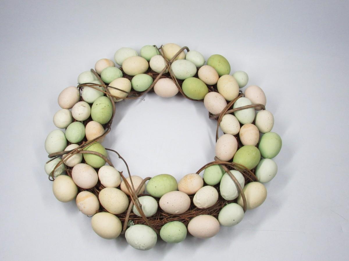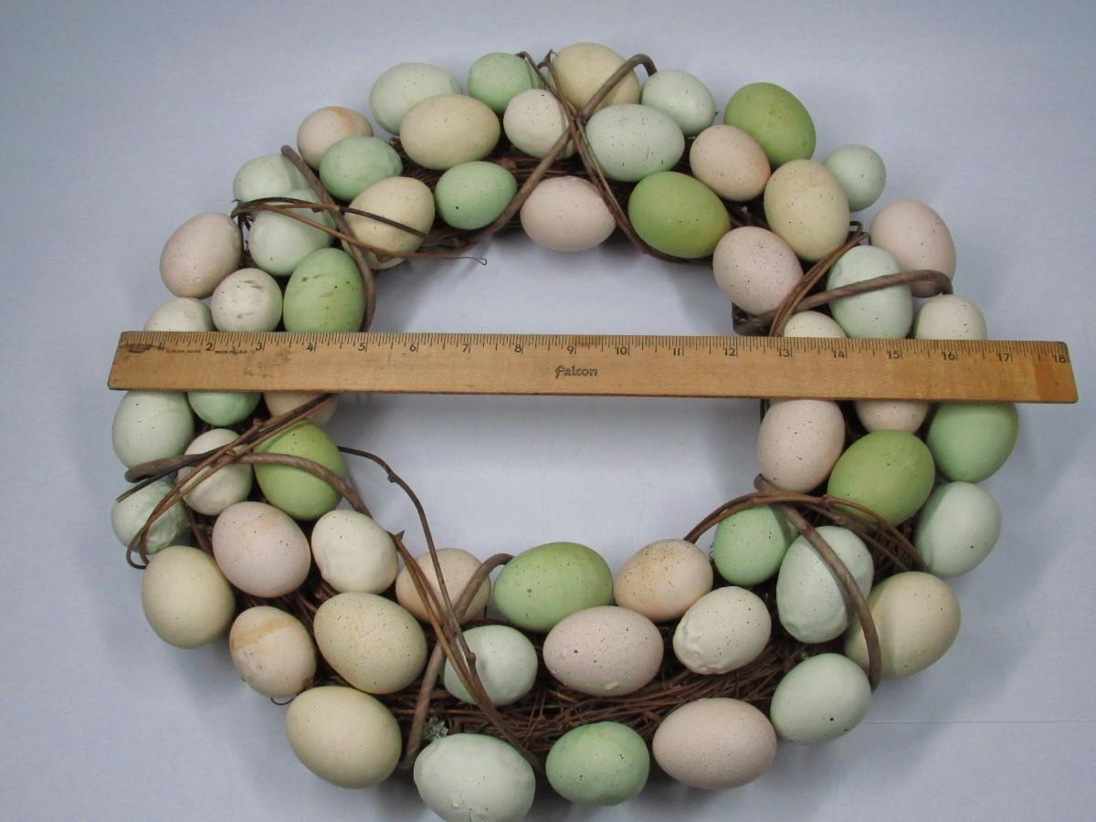 There is some light wear to the eggs on the wreath, but there is no significant damage and in good displayable condition. Check pictures for more details and sizing.