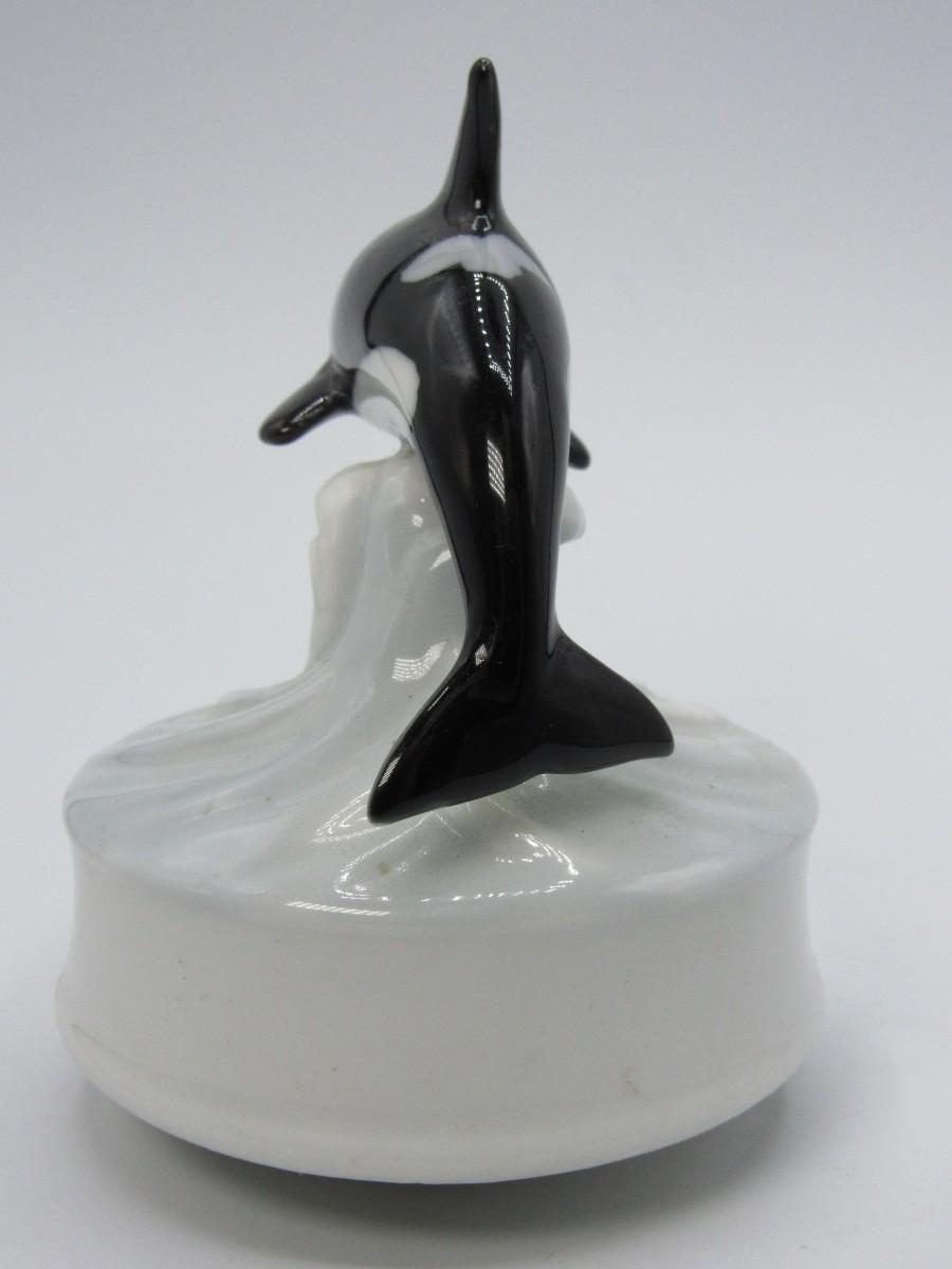 This figural music box of Killer Whale riding the surf is in good used condition. The music box does not work and cannot be wound up.