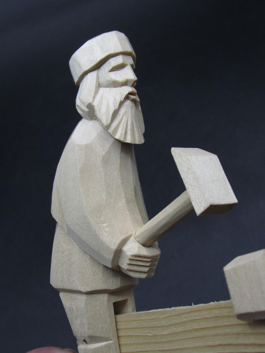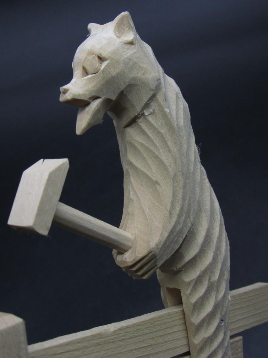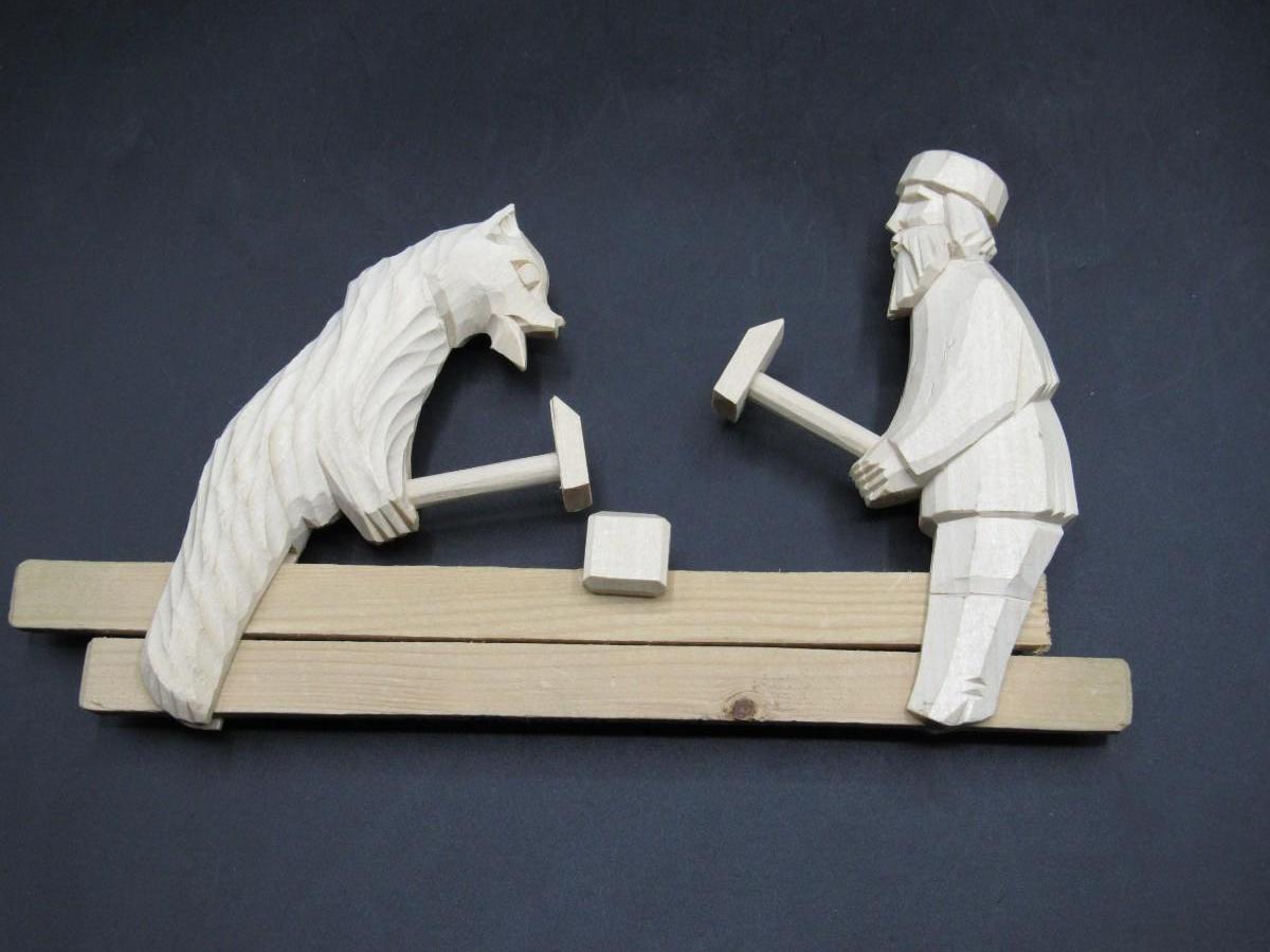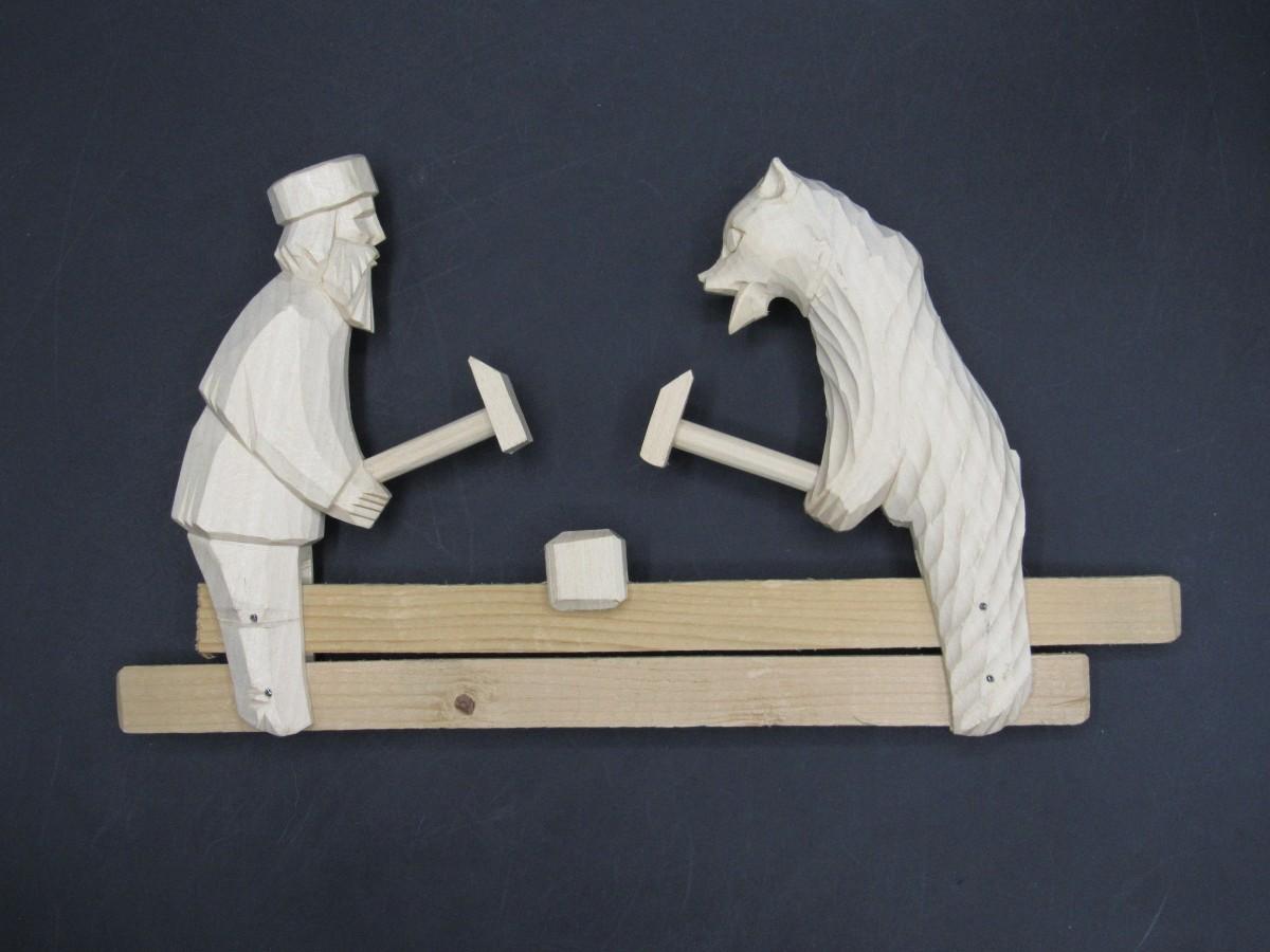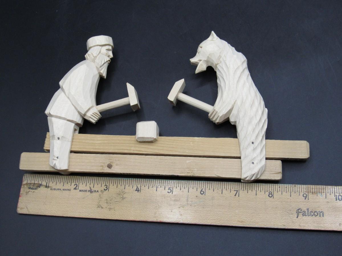 Retro Made in Russia Carved Wooden Hammering Bear & Man Kids Souvenir Toy