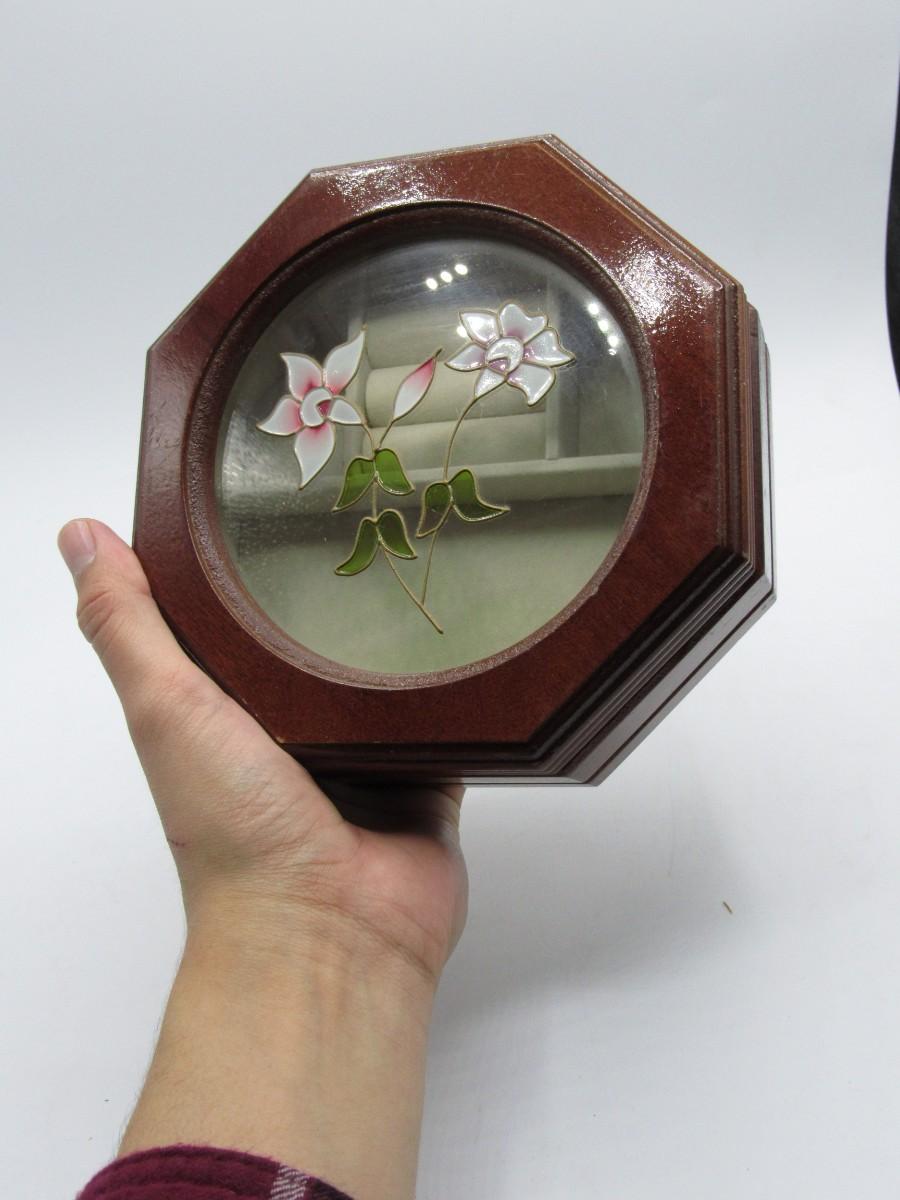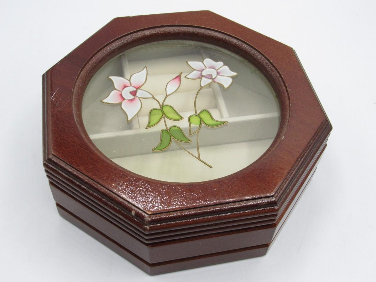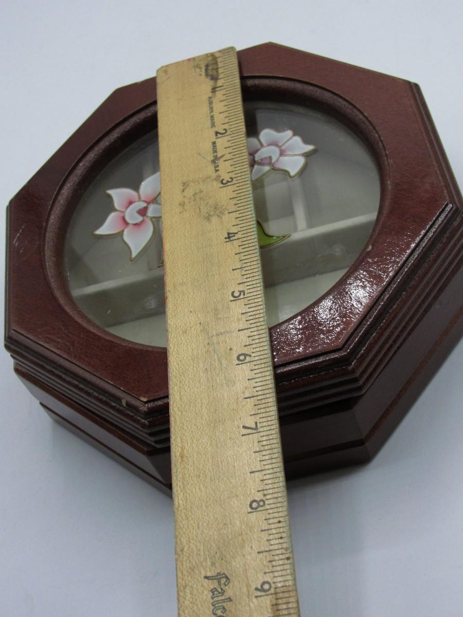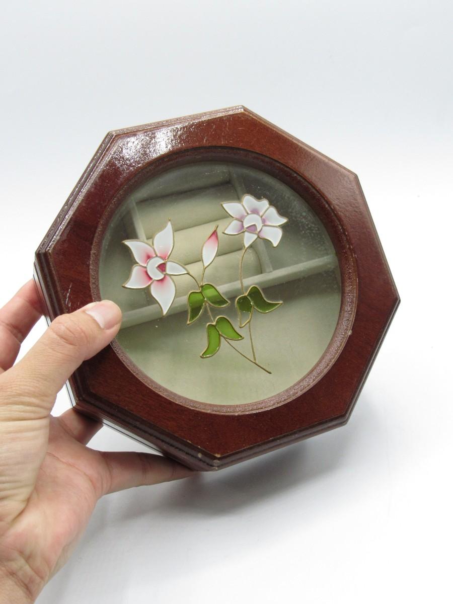 Retro Glass & Wood Octagon Shape Jewelry Trinket Keepsake Box Pink Flowers