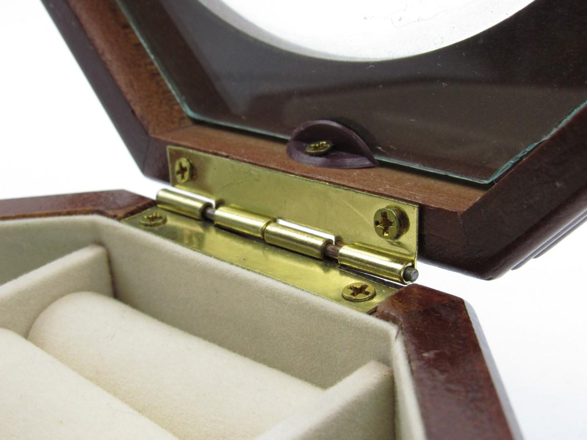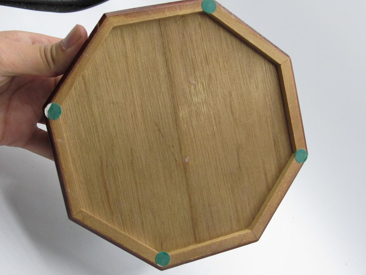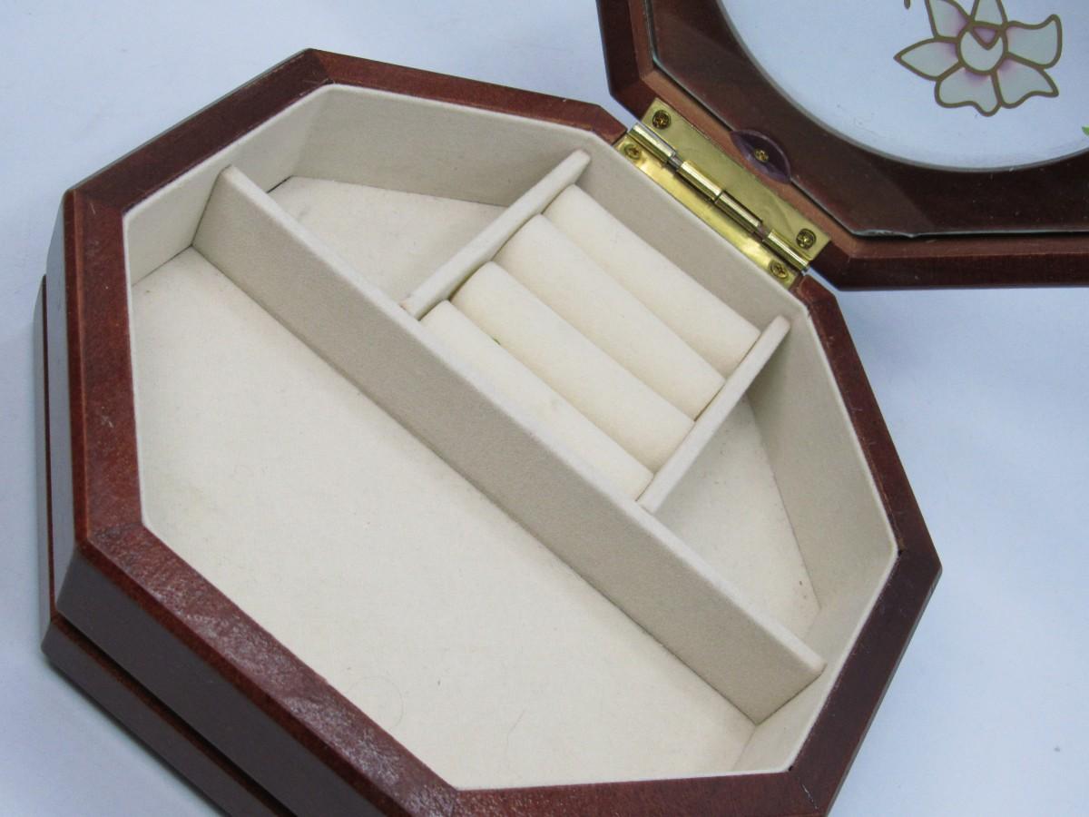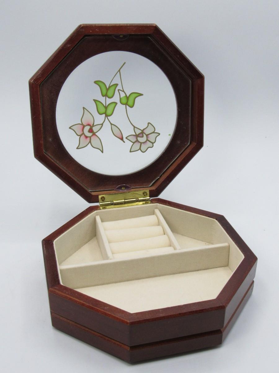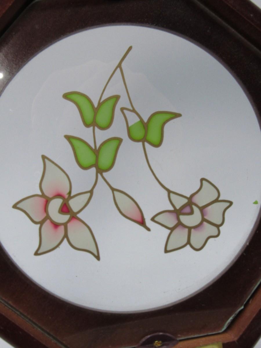 Retro Glass & Wood Octagon Shape Jewelry Trinket Keepsake Box Pink Flowers