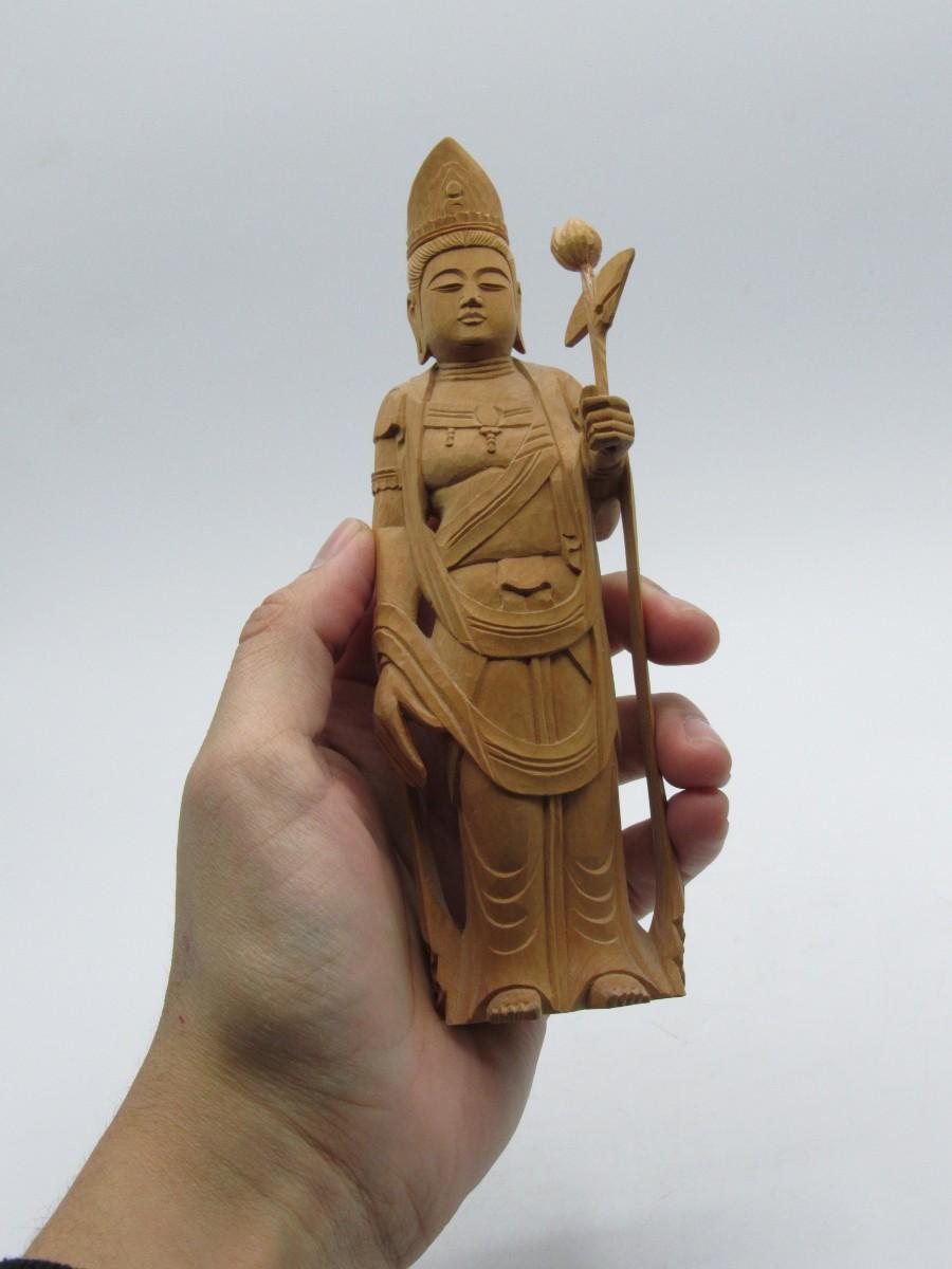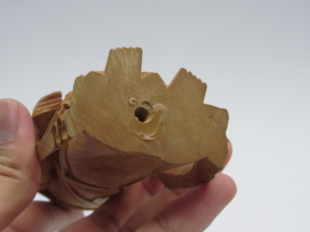 There is no damage to the wood and is in good displayable condition. Check pictures for more details and for sizing. There is a hole drilled on the bottom of the statue.