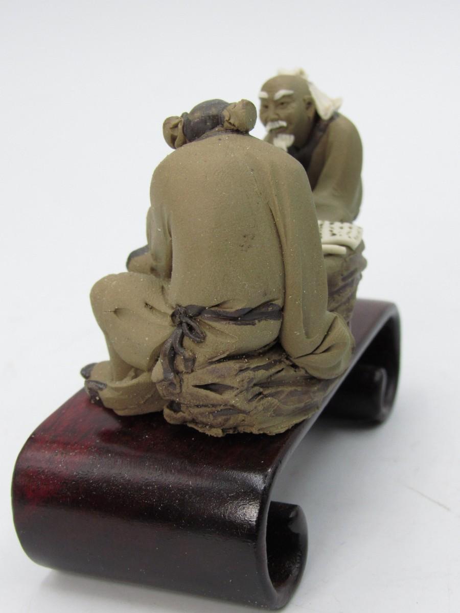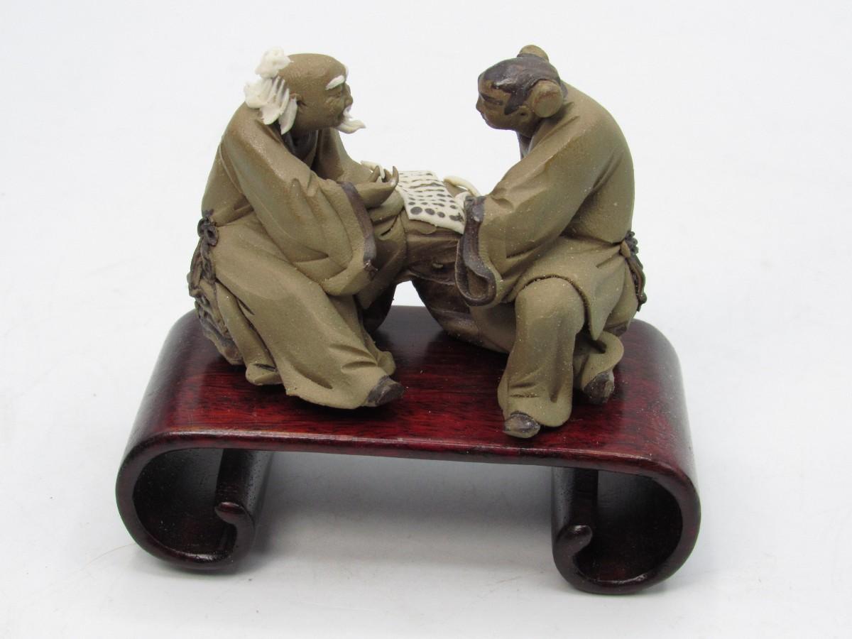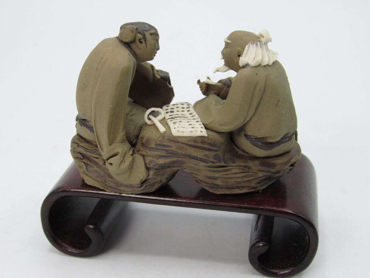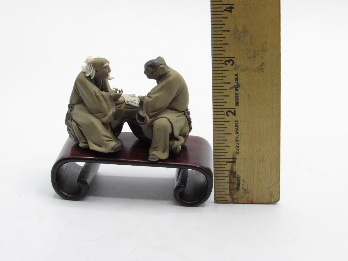 Vintage Chinese Mudmen Scholars Discussing Writing Small Sculptural Figurine with Stand