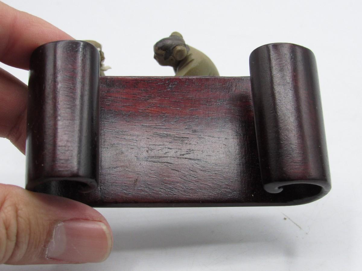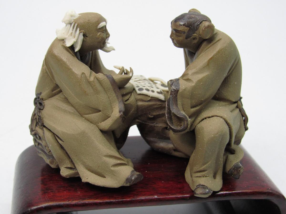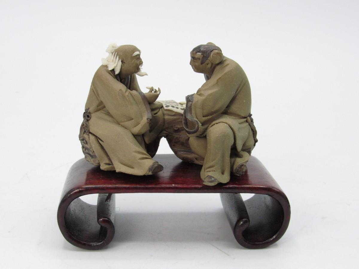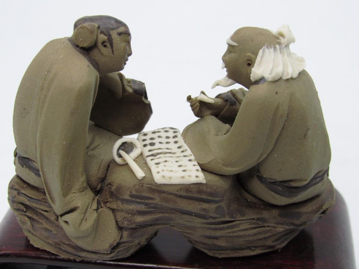 Vintage Chinese Mudmen Scholars Discussing Writing Small Sculptural Figurine with Stand