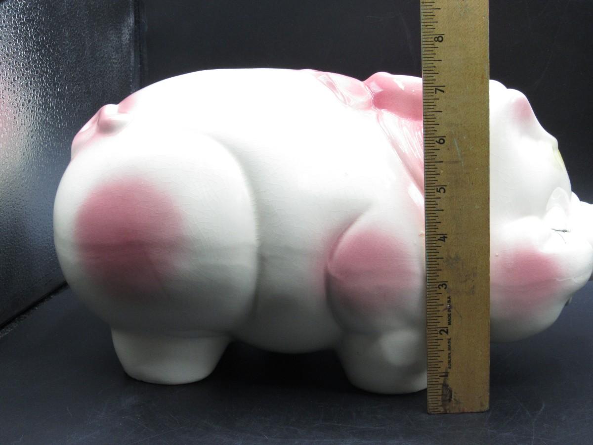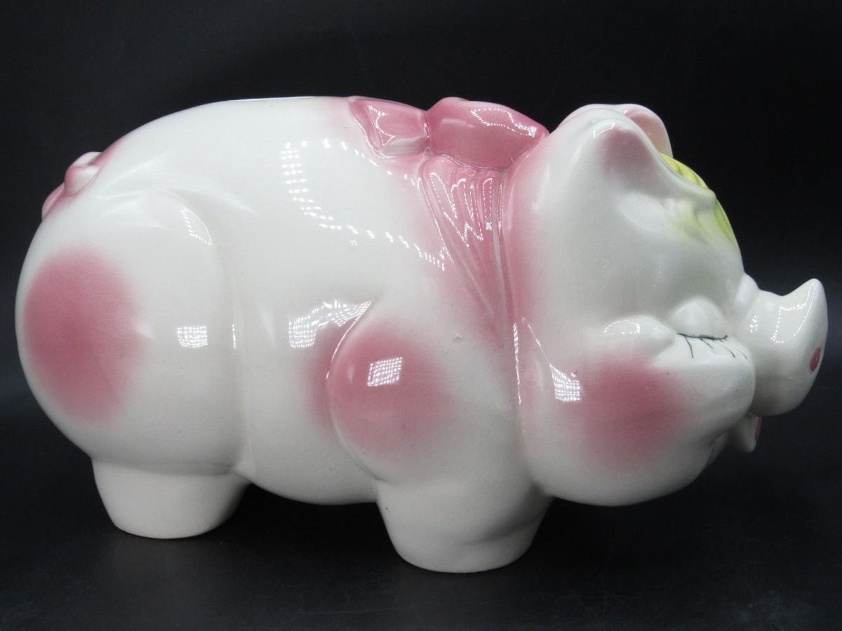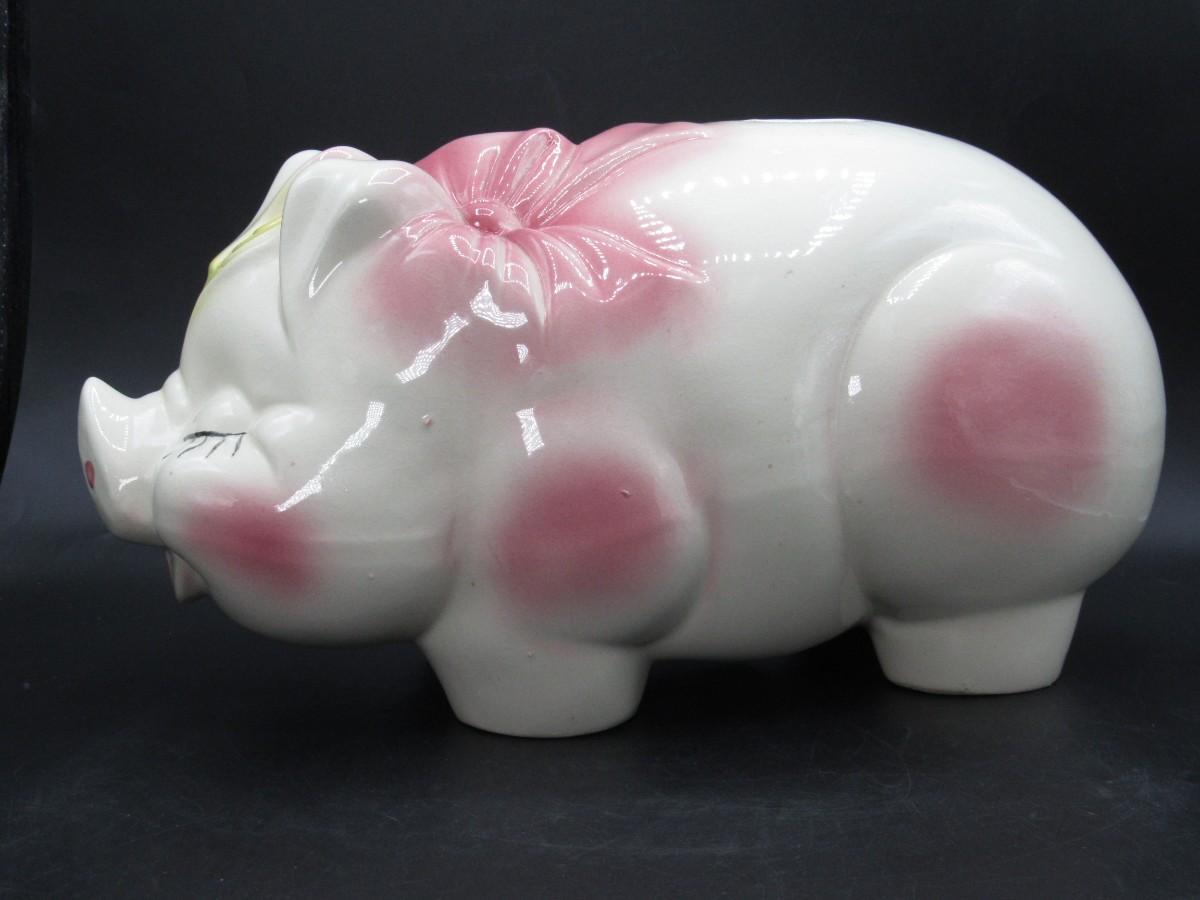 Large Antique Pottery Piggy Bank Pig with Pink Spots