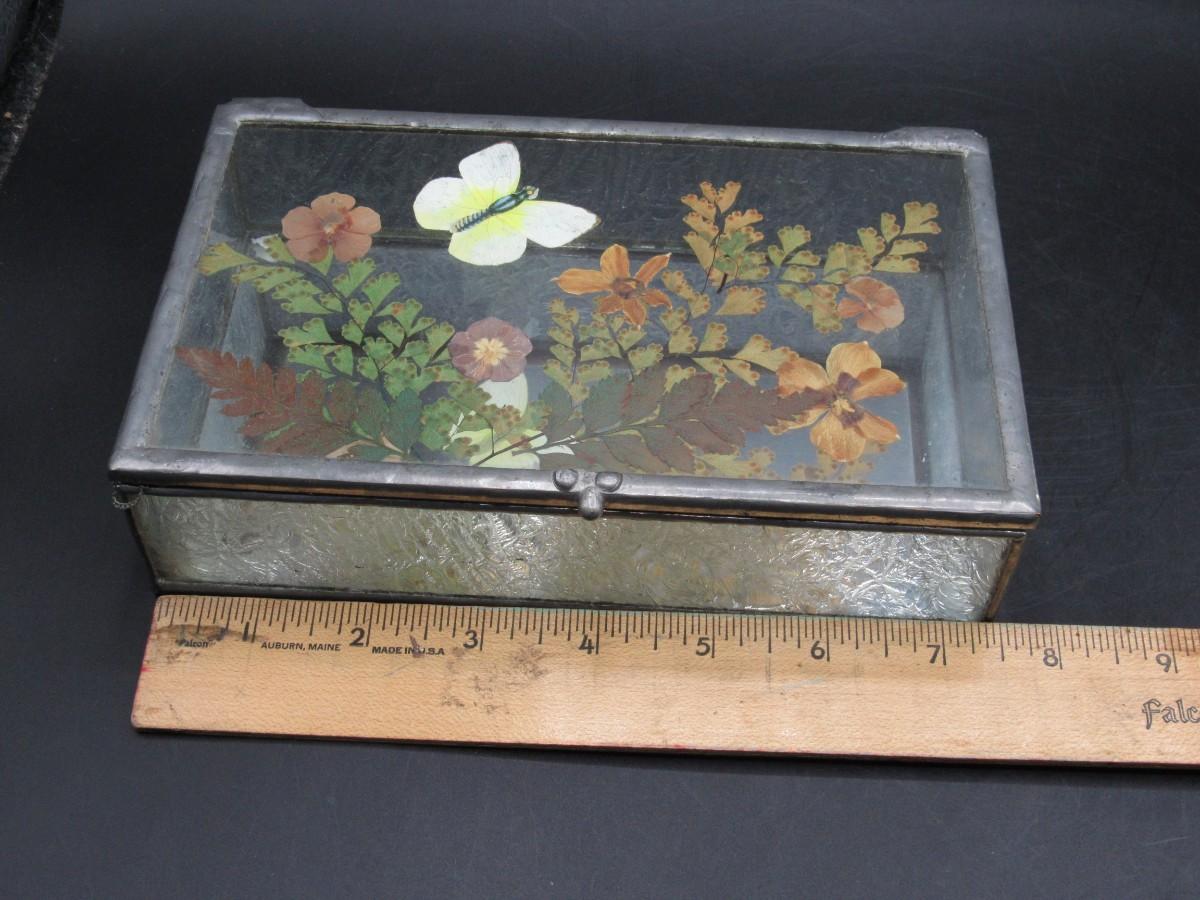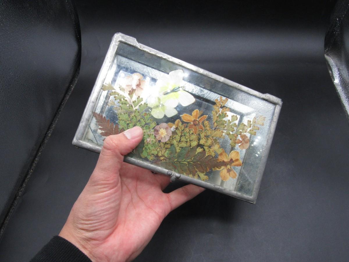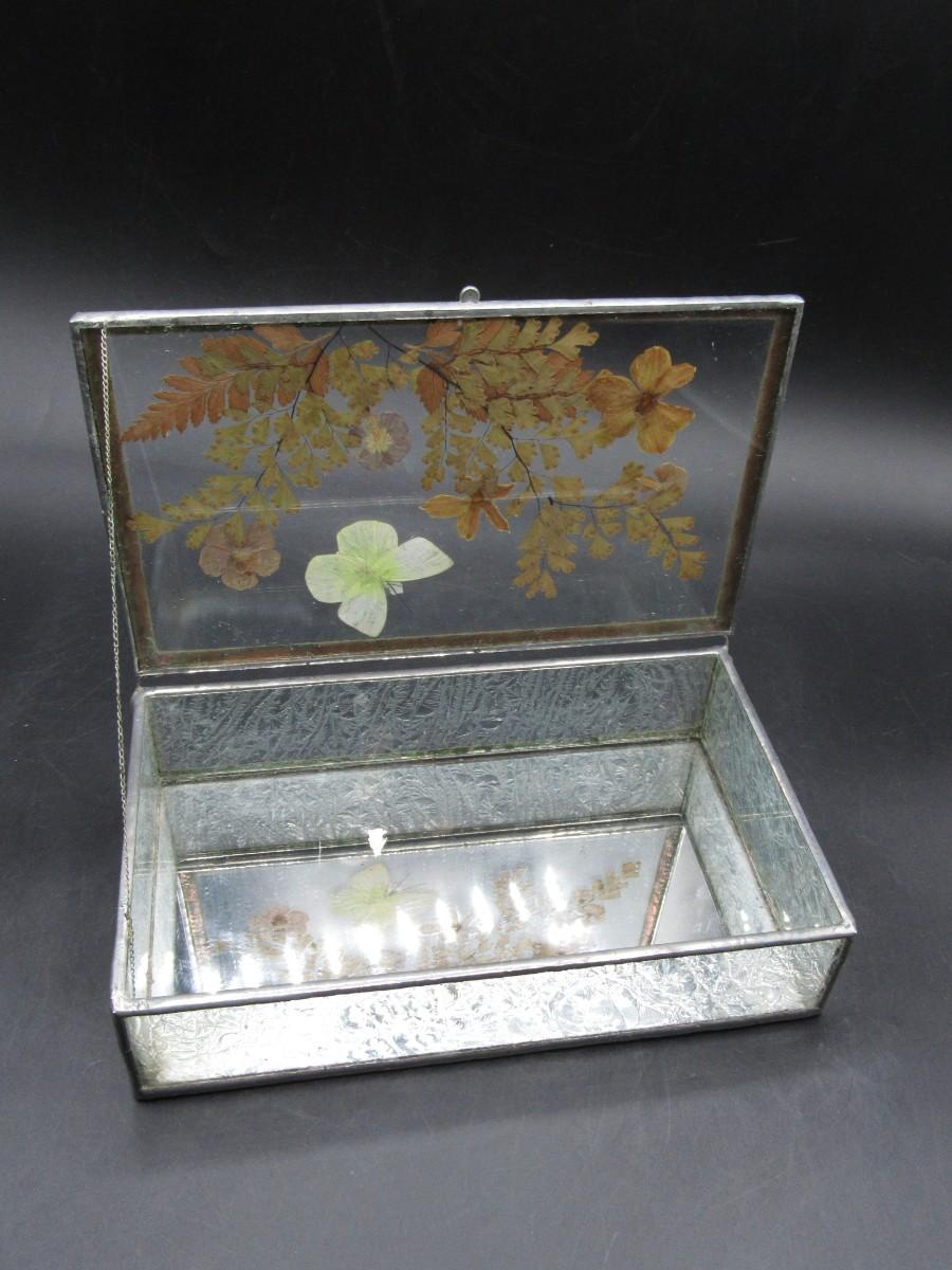 Vintage Clear Mirror Glass Real Pressed Flower Trinket Jewelry Keepsake Box