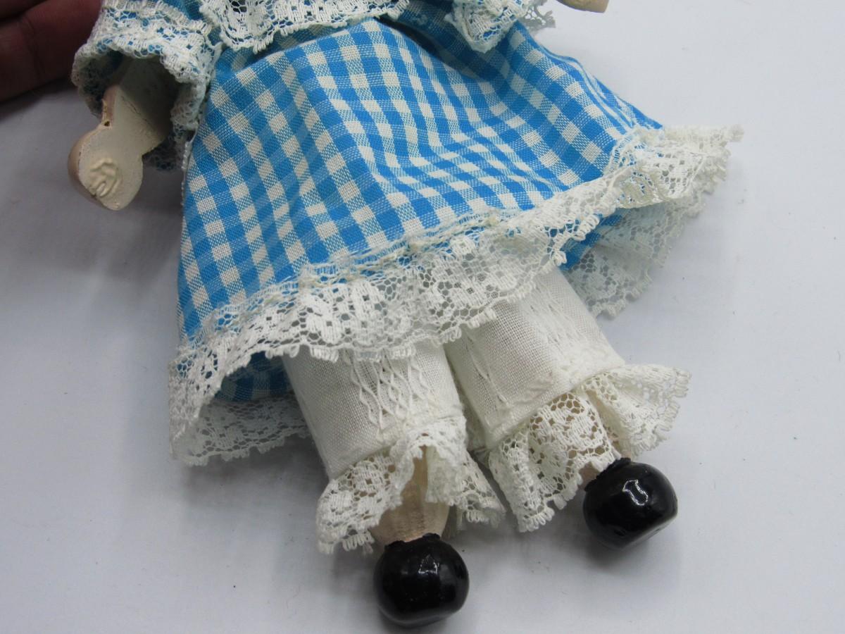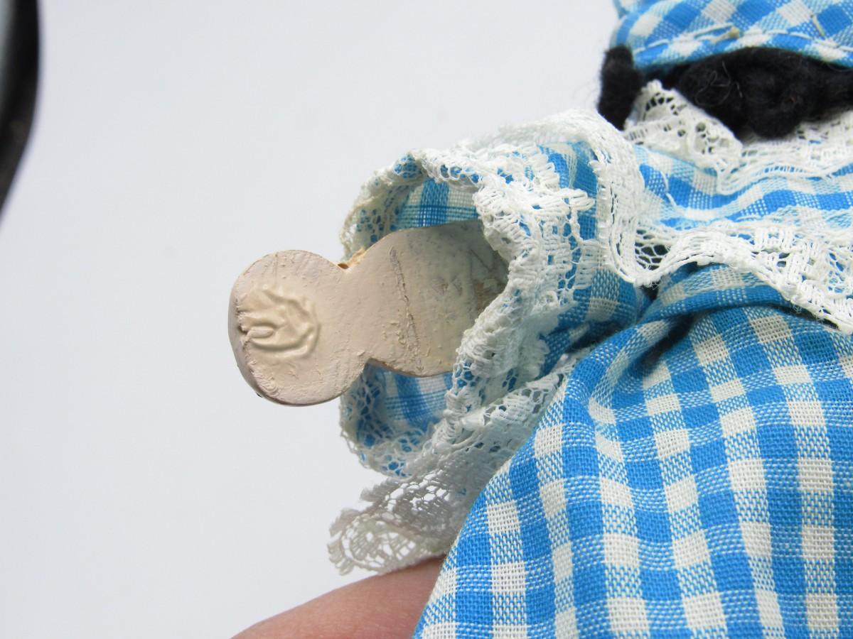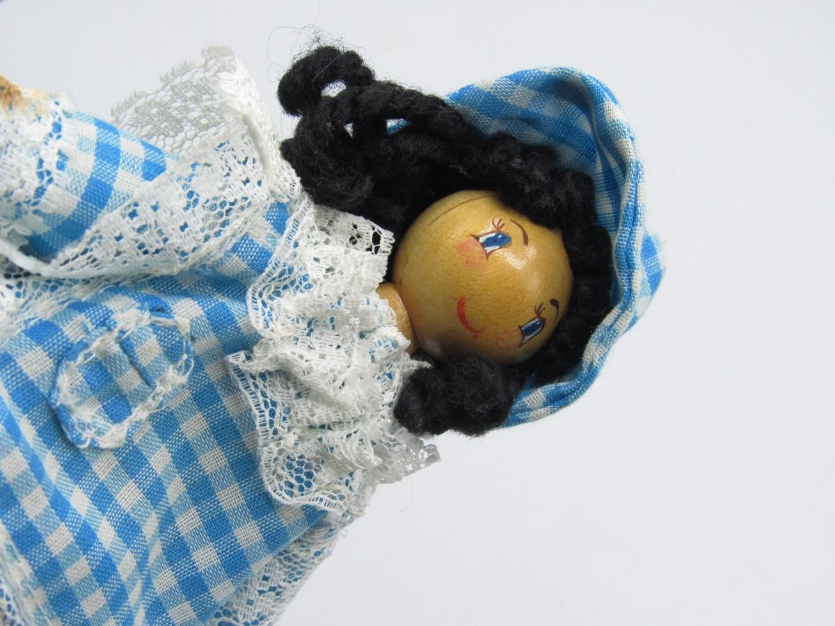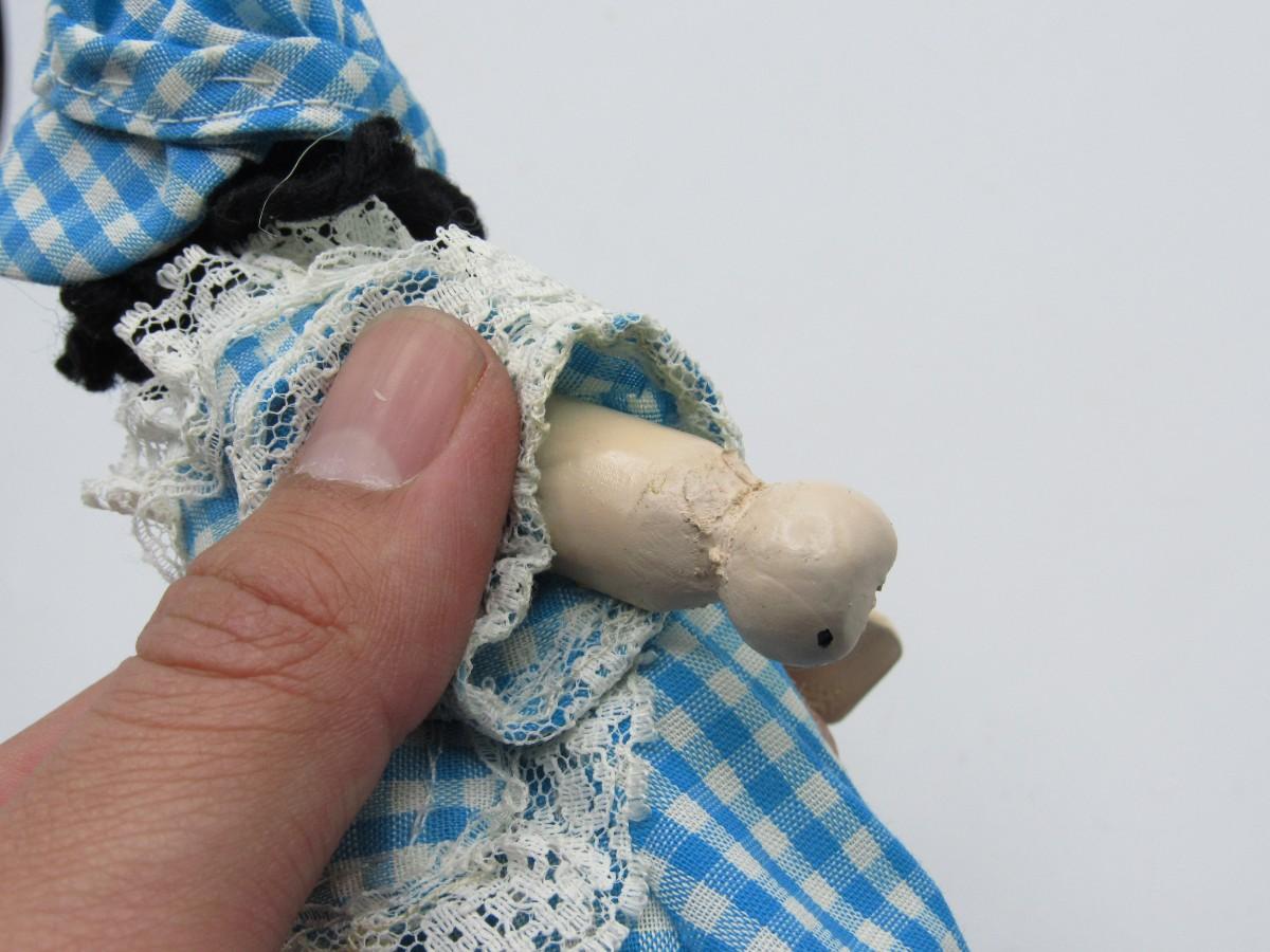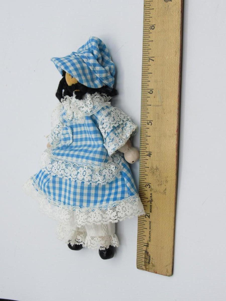 There is no damage to the wood or the material to the doll and is in good collectible condition. Check pictures for more details and sizing.