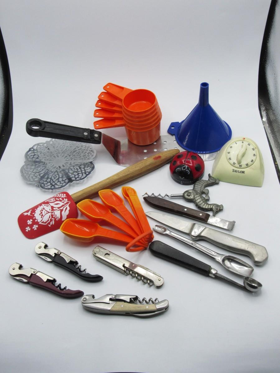Lot of Miscellaneous Kitchenware Utensils Wine Bottle Openers, Timers, Measuring Cups/Spoons, & More