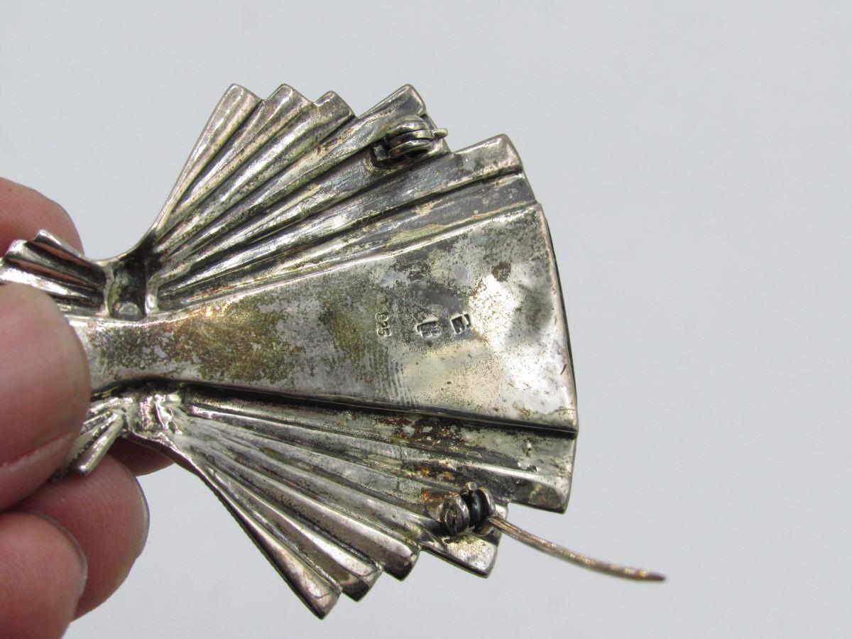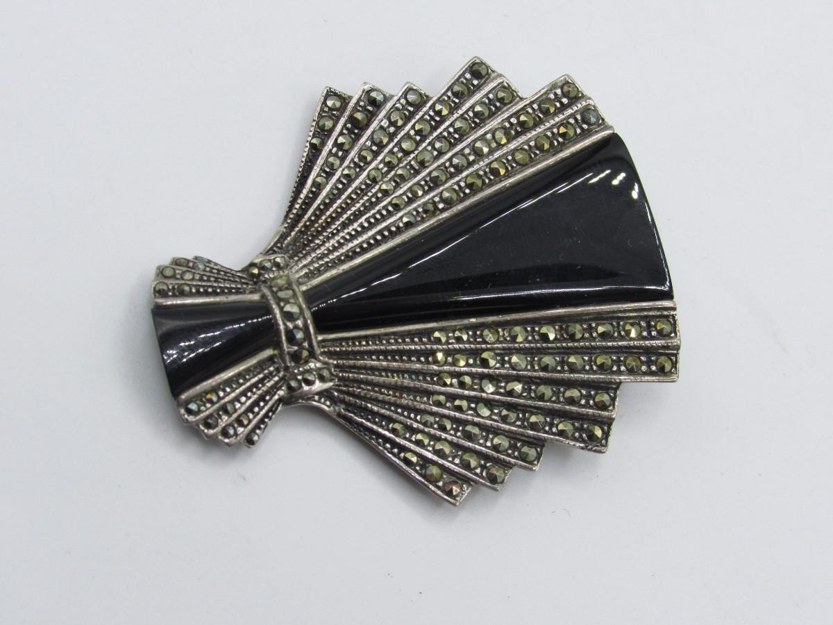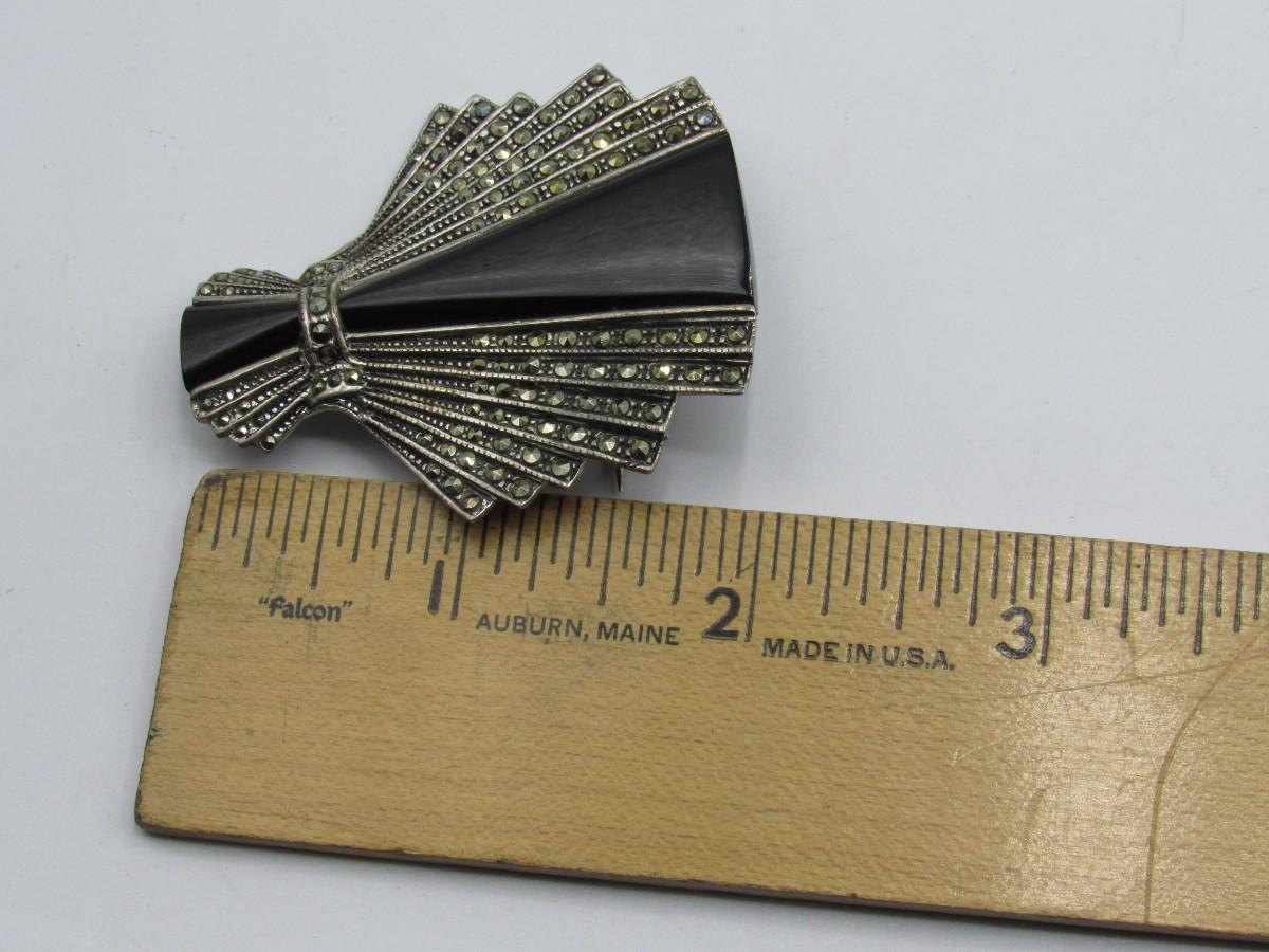 Silver and Black Lacquered Bejeweled Brooch Pin. Made to resemble gathered material. Approx 2" long.