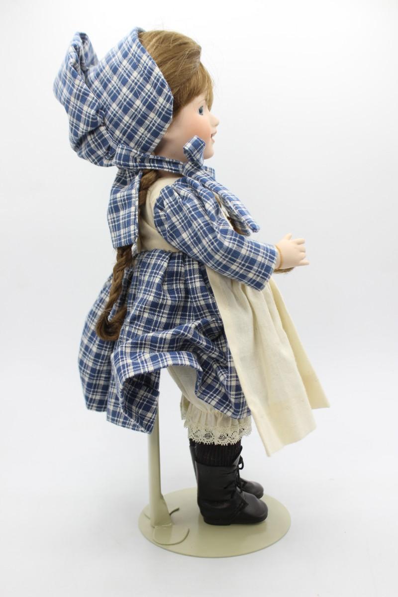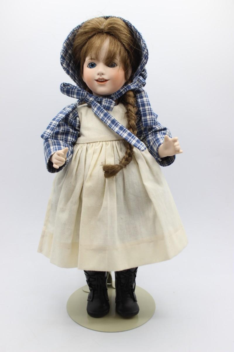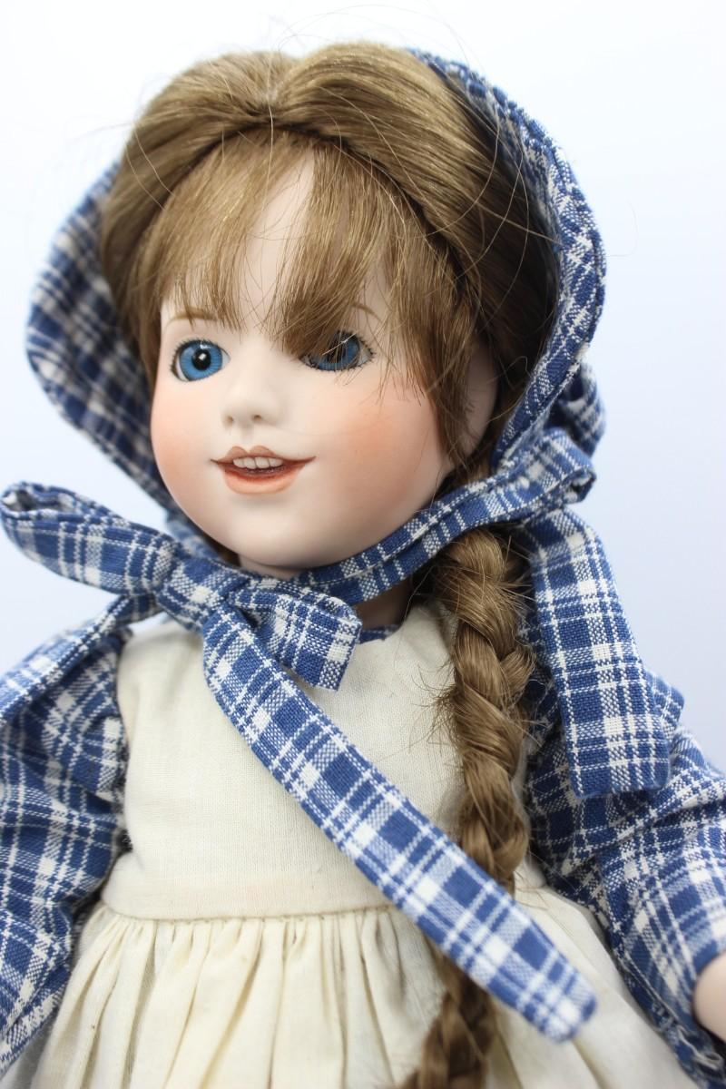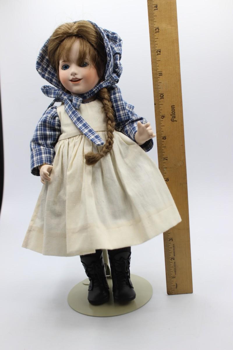 Vintage Doll Plaid top and bonnet cream jumper large curl porcelain face