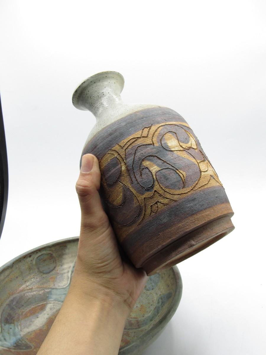 Vintage Primitive Handmade Pottery Art Pitcher Jug with Matching Washing Dish