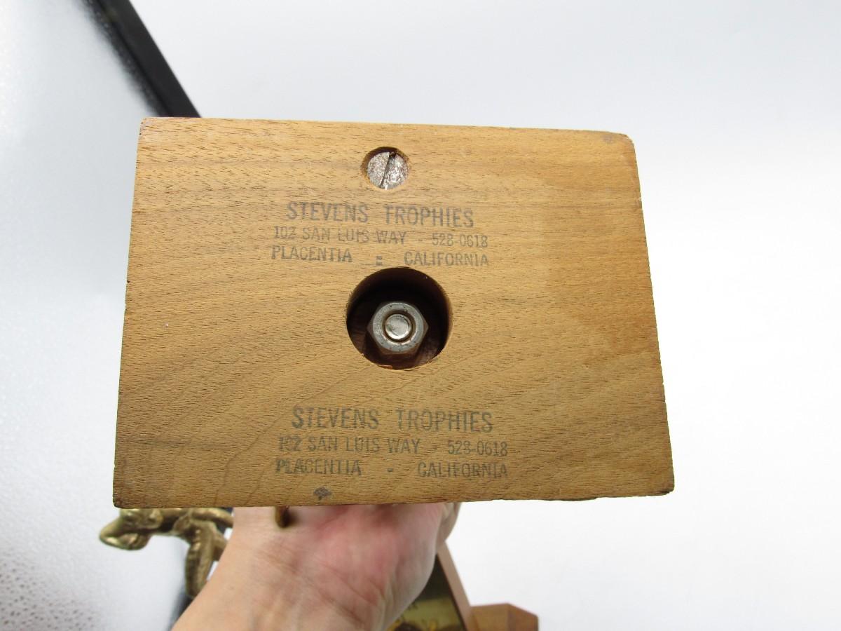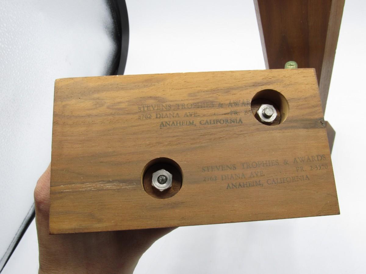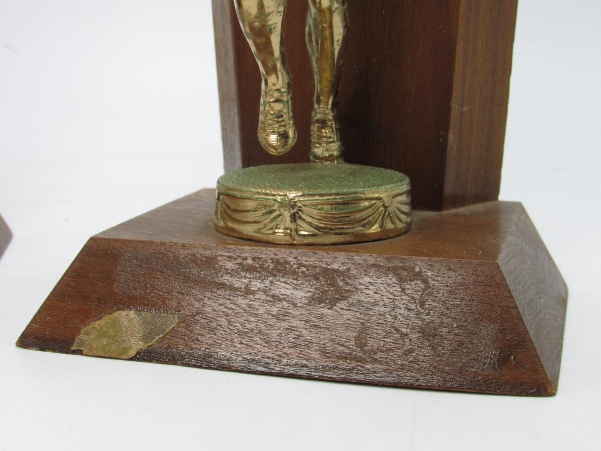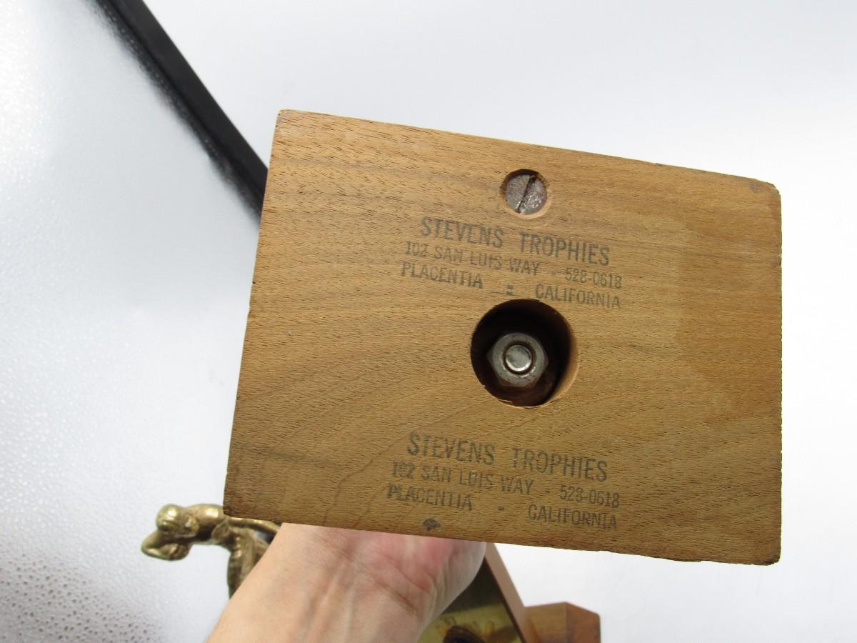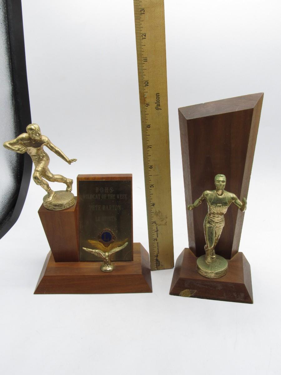 The plaque of one of the trophies has come off of the wood, there is no significant damage and is in good collectible or displayable condition. Check pictures for more details.