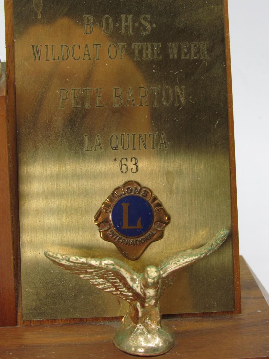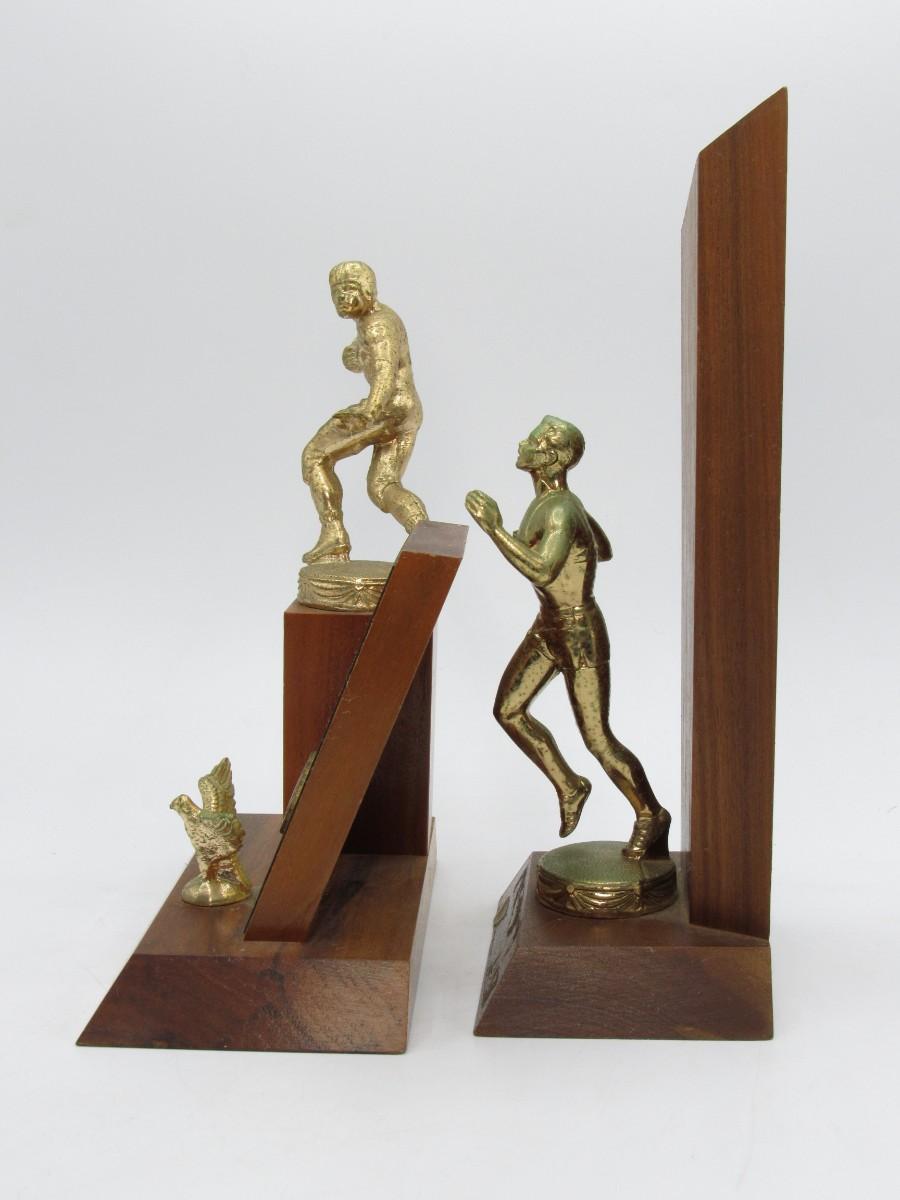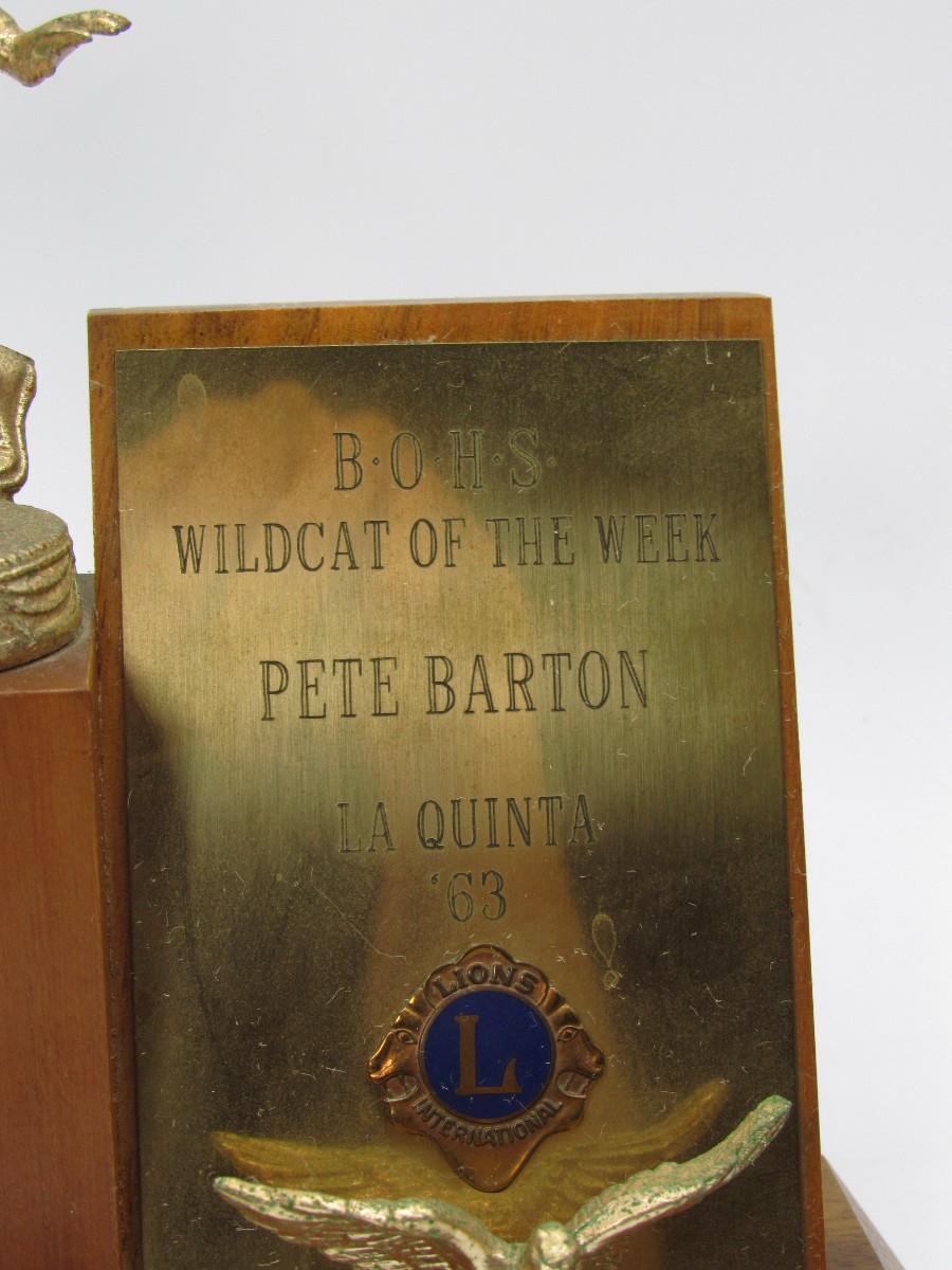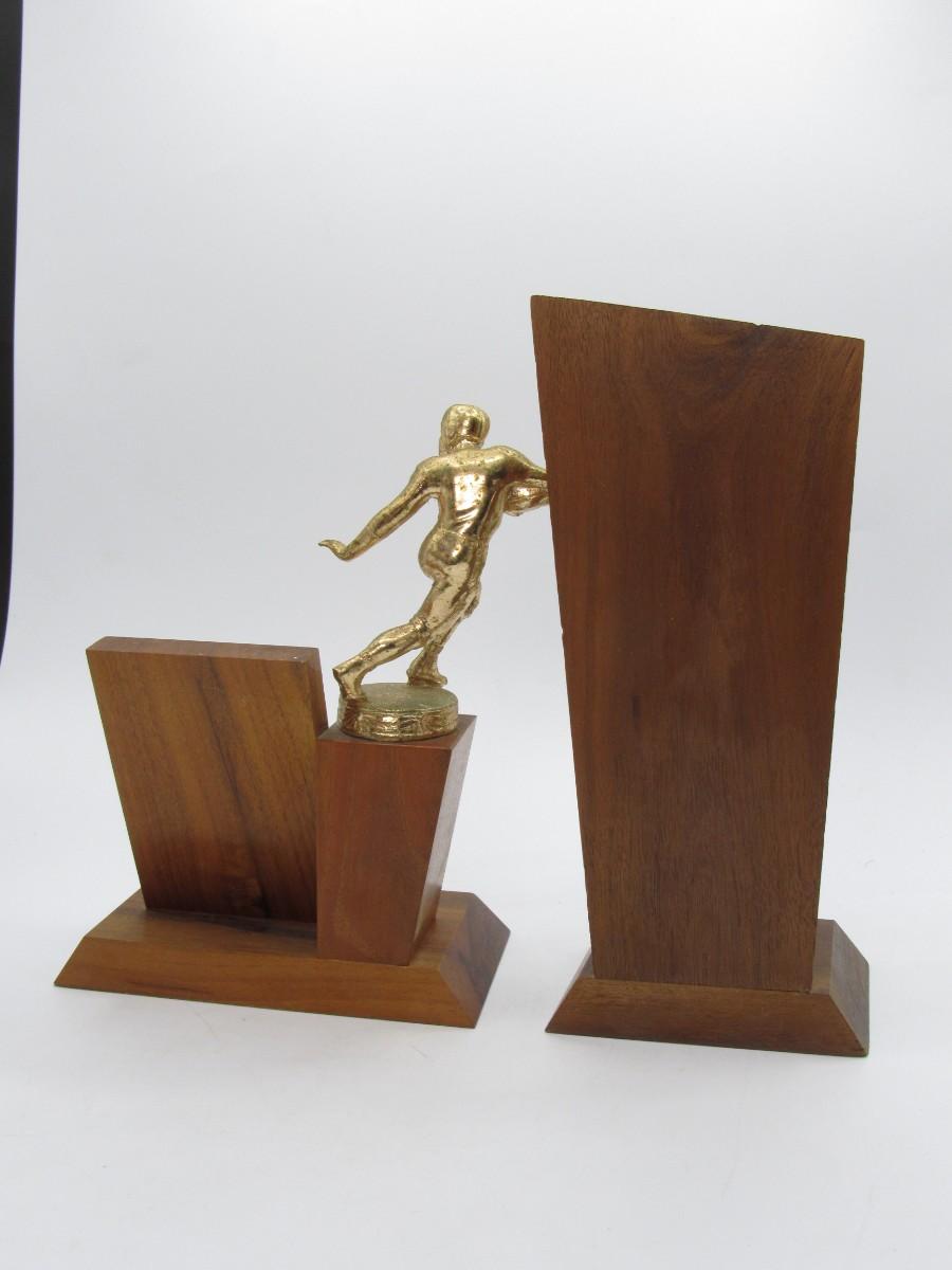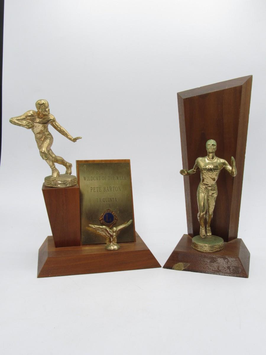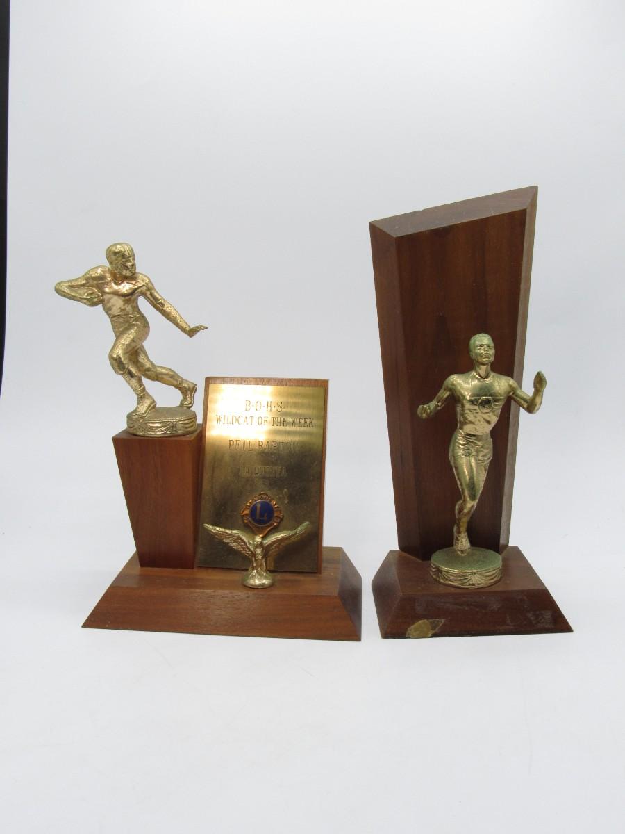The plaque of one of the trophies has come off of the wood, there is no significant damage and is in good collectible or displayable condition. Check pictures for more details.