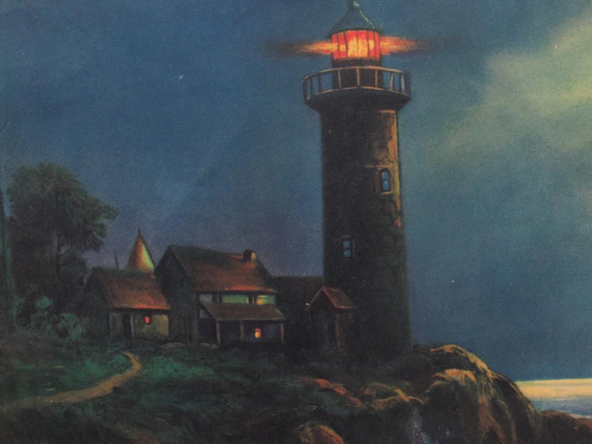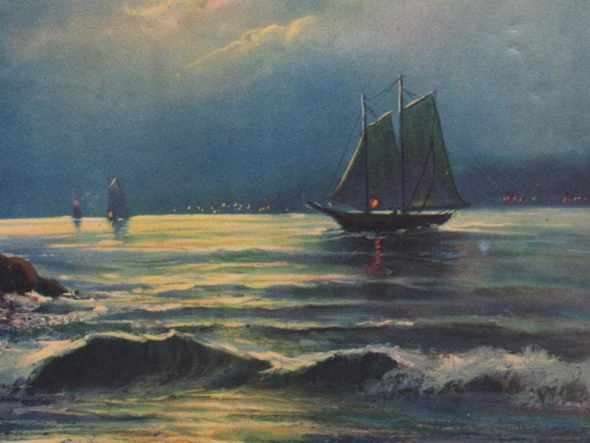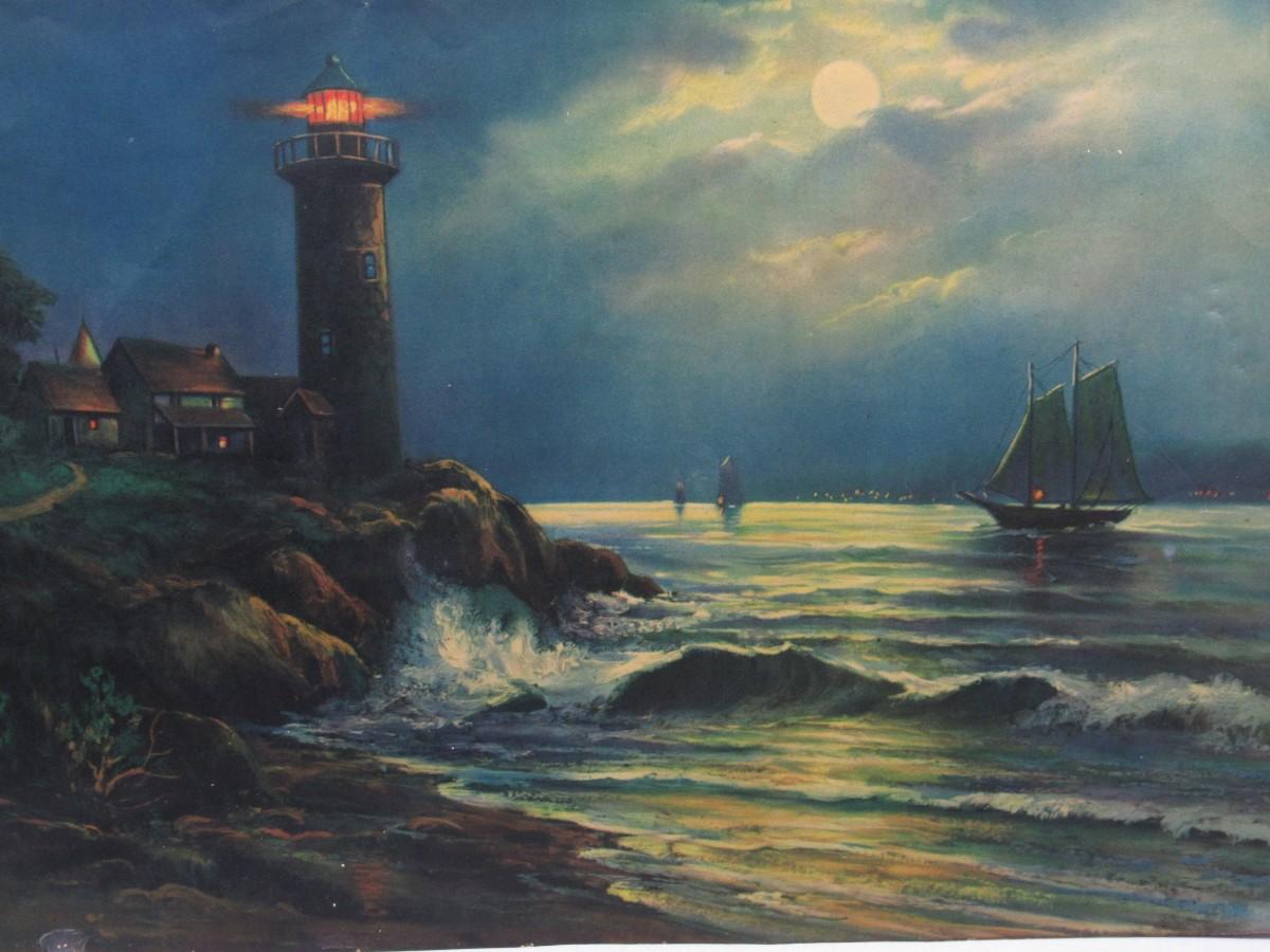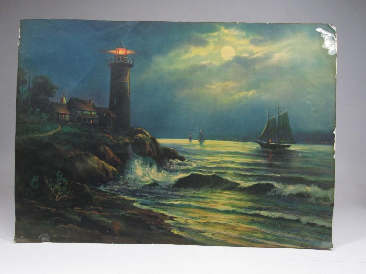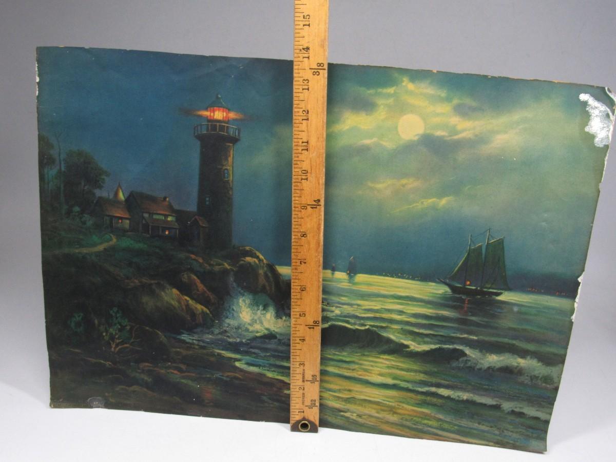 Vintage print Lighthouse Ocean Sea Waves Sailing Ship Moonlight Cliffs