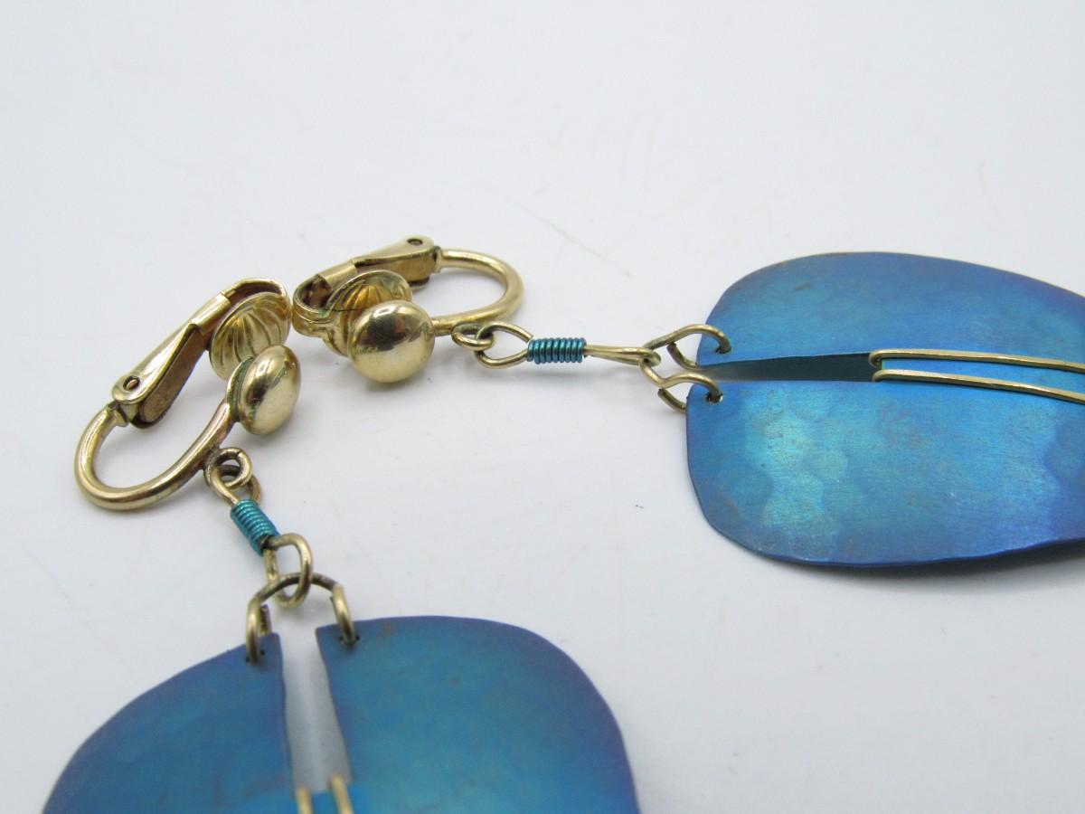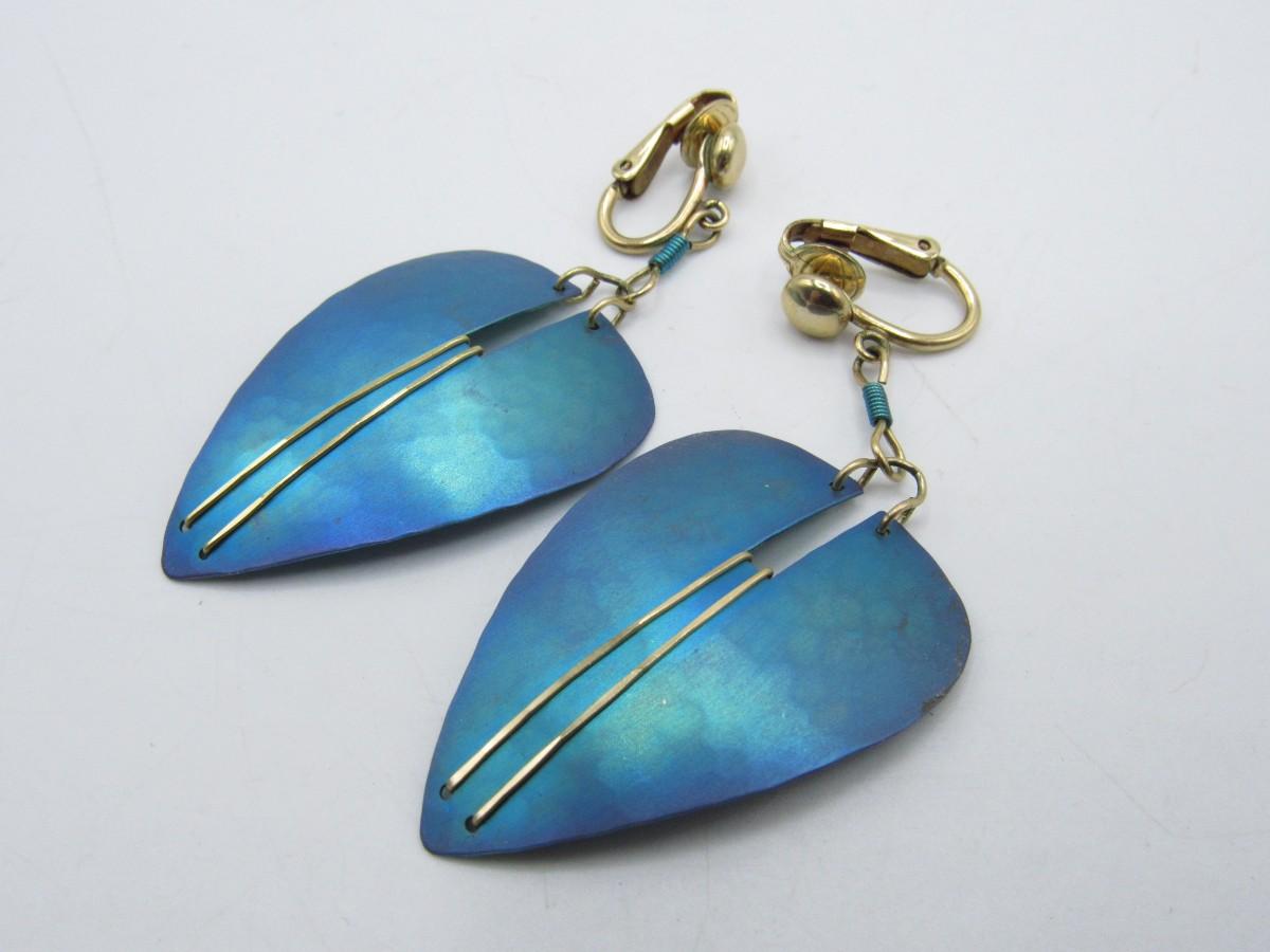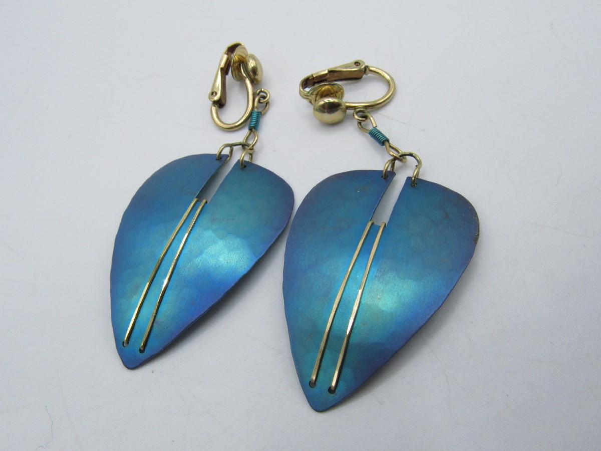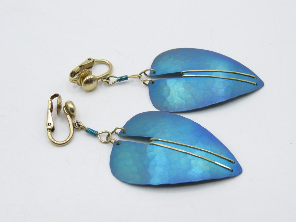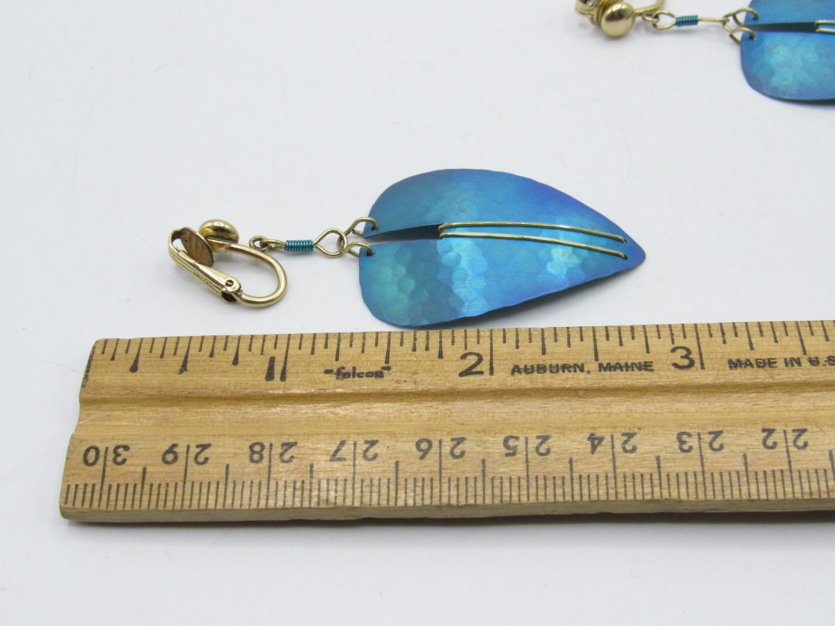 Vintage Costume Jewelry Clip-on Dangler Blue Leaf shaped Earrings