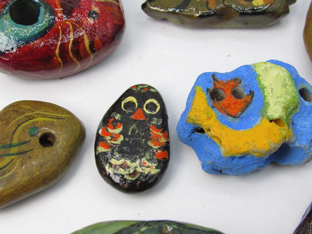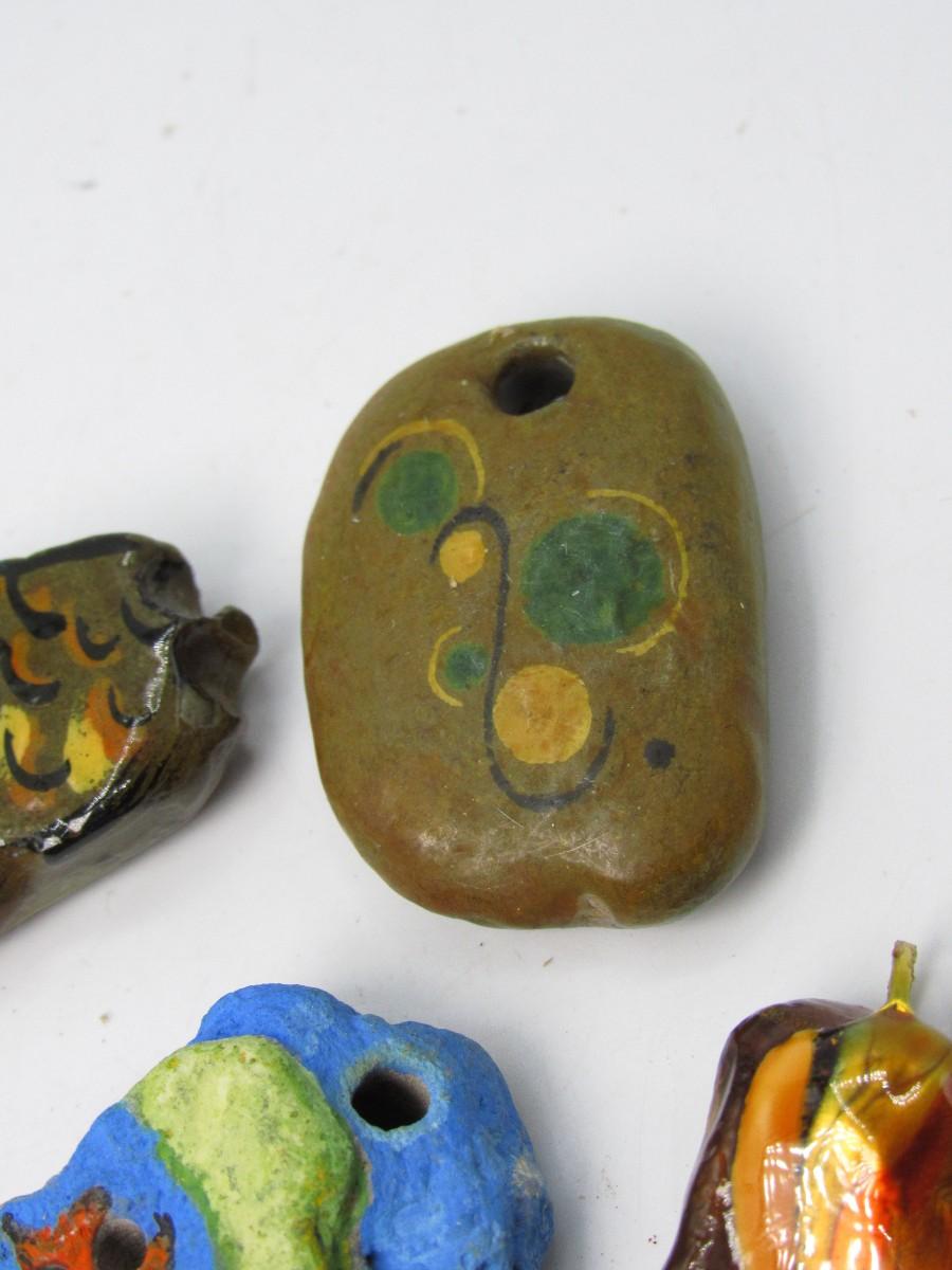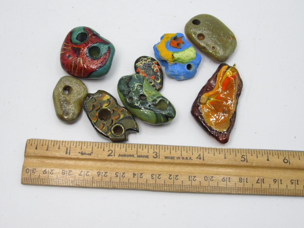 Many shapes and colors, some look to have abstract animal shapes and faces. Holes for inserting necklace cord are already in. All are in good condition.