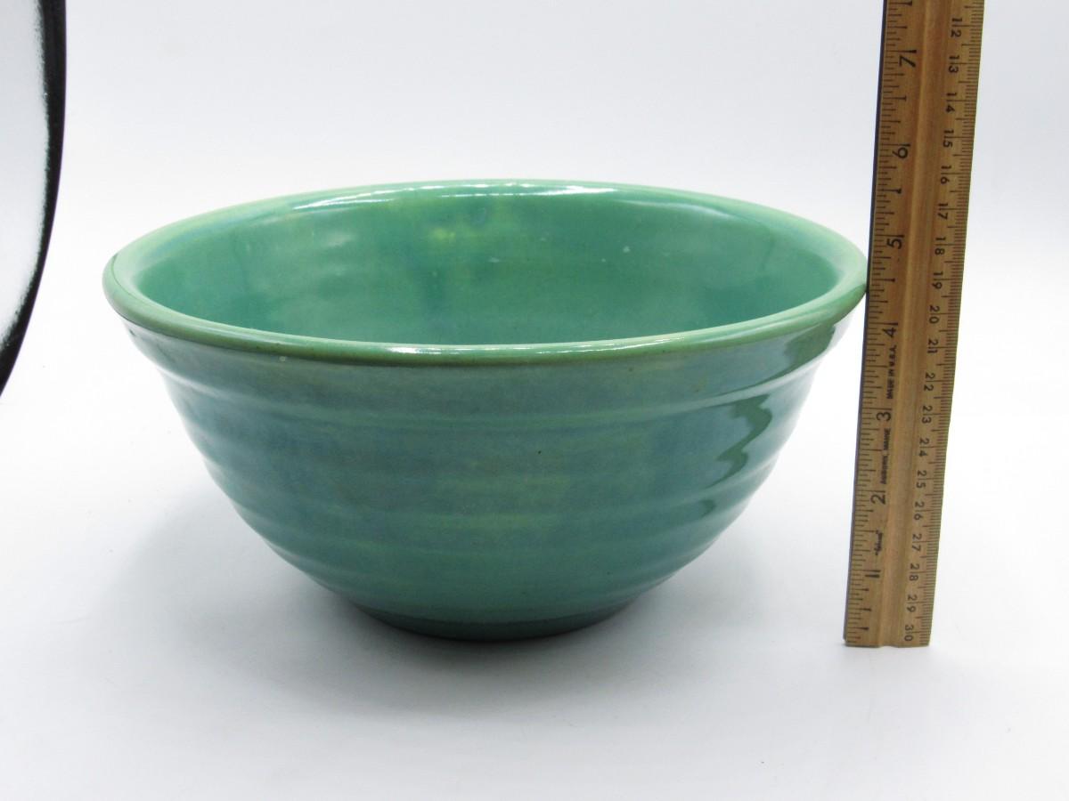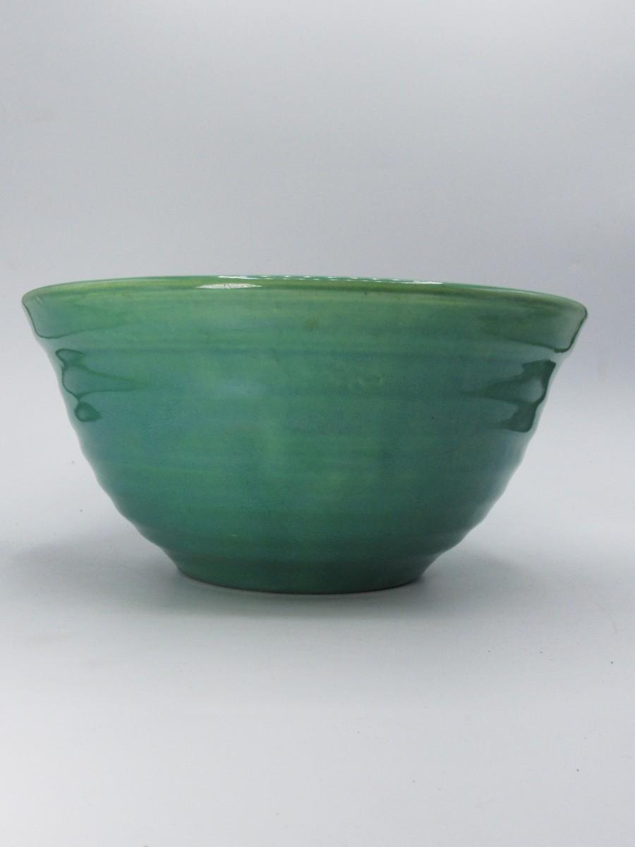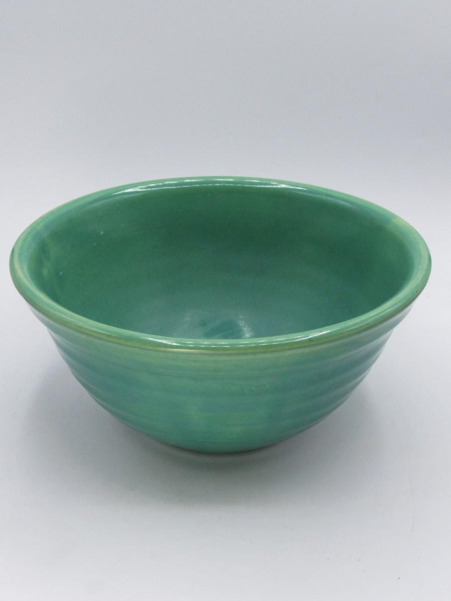 Jade green / mint green ringware #12 ceramic bowl by AJ Bauer Pottery. Made in Los Angeles c. 1930-1940s. In good to very good condition. One chip on side of the bowl, see photos. Signs of normal wear. Approx. 9" across.