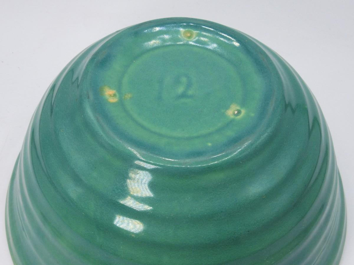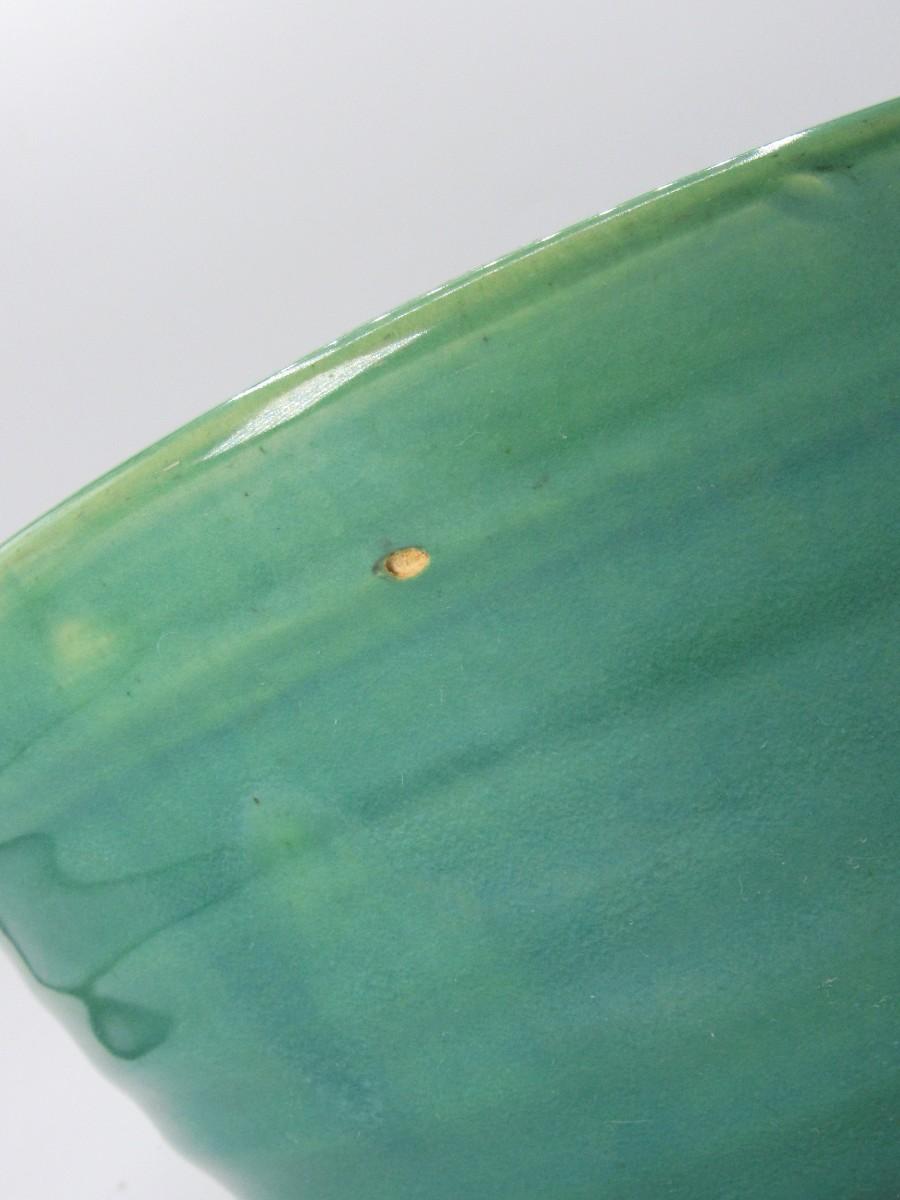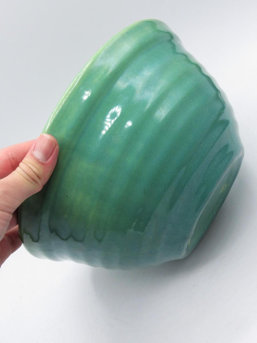 Jade green / mint green ringware #12 ceramic bowl by AJ Bauer Pottery. Made in Los Angeles c. 1930-1940s. In good to very good condition. One chip on side of the bowl, see photos. Signs of normal wear. Approx. 9" across.