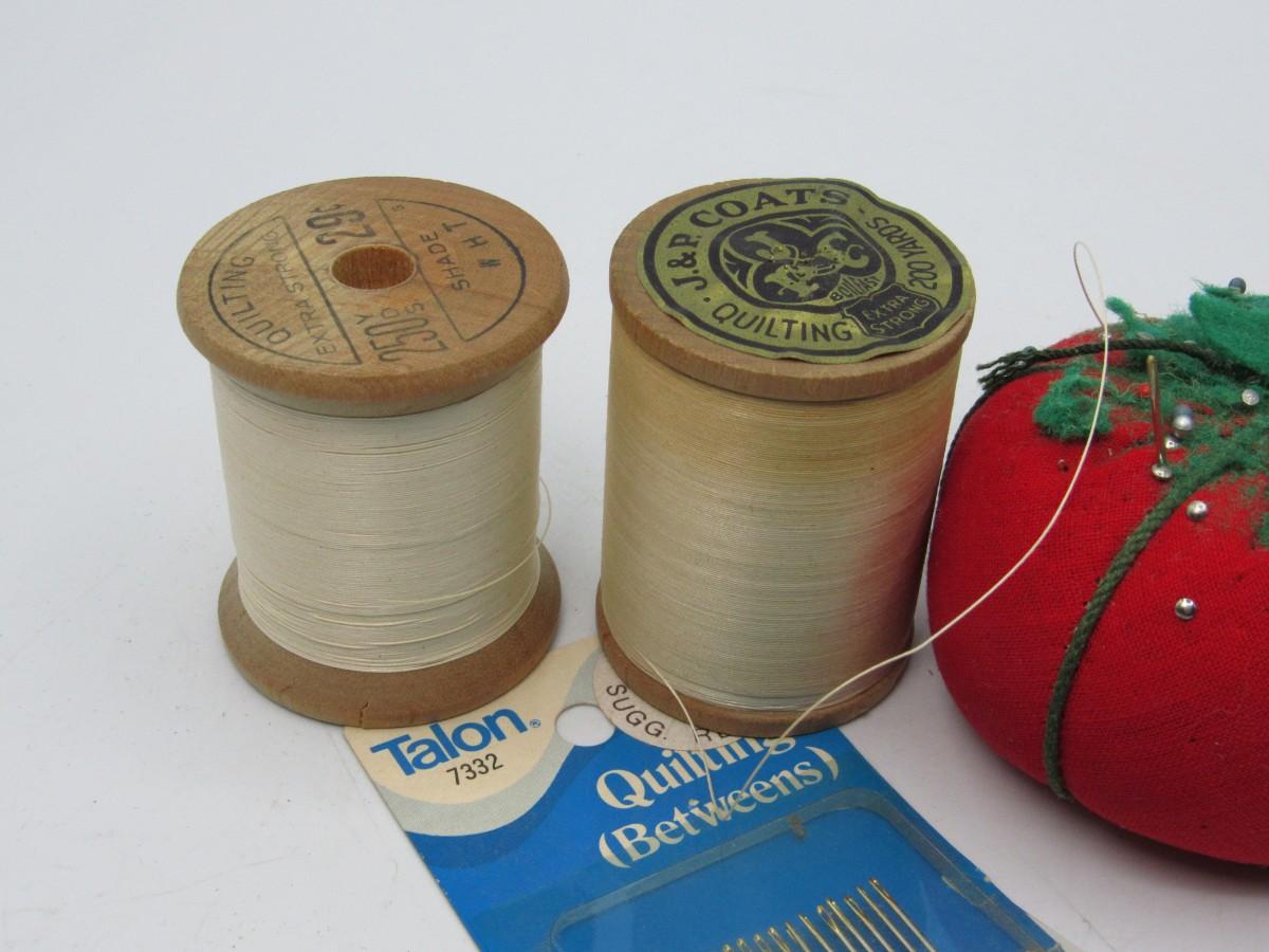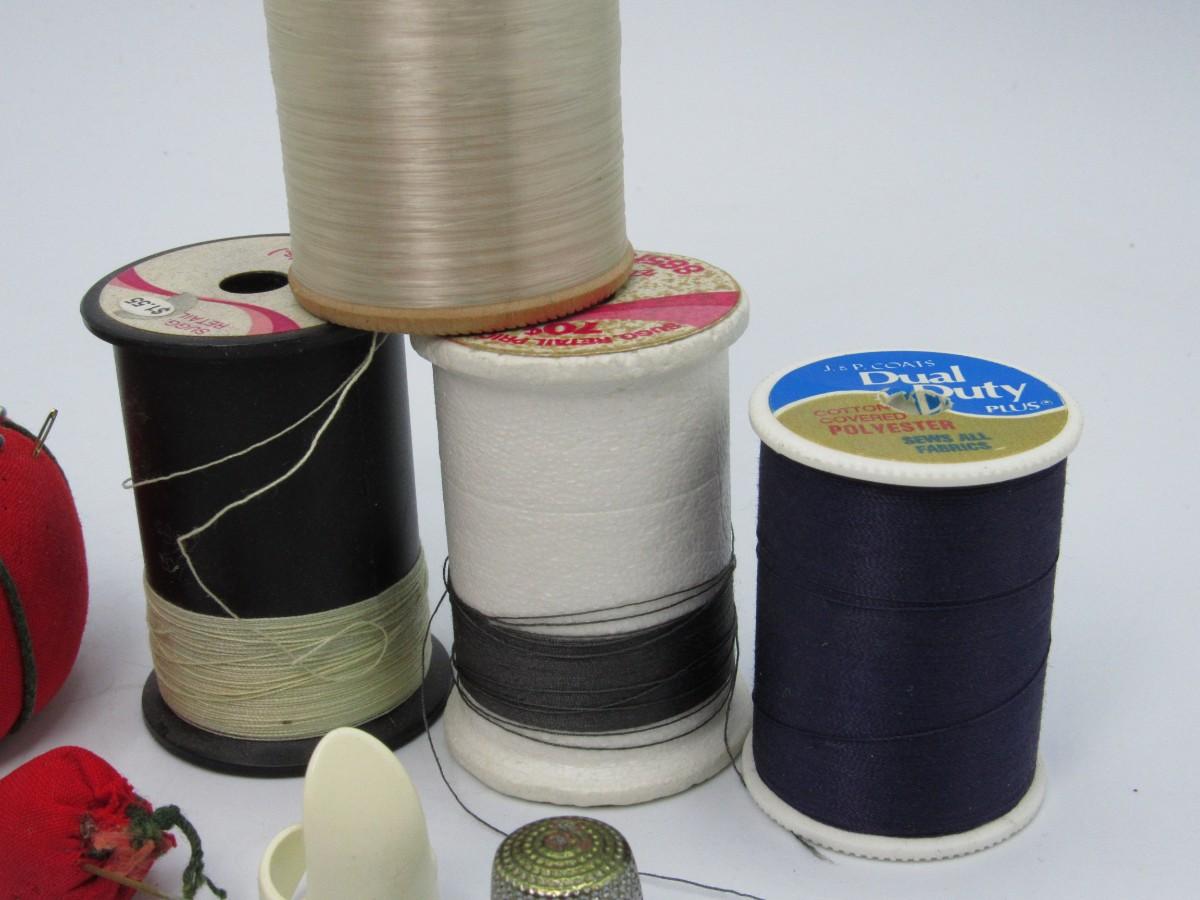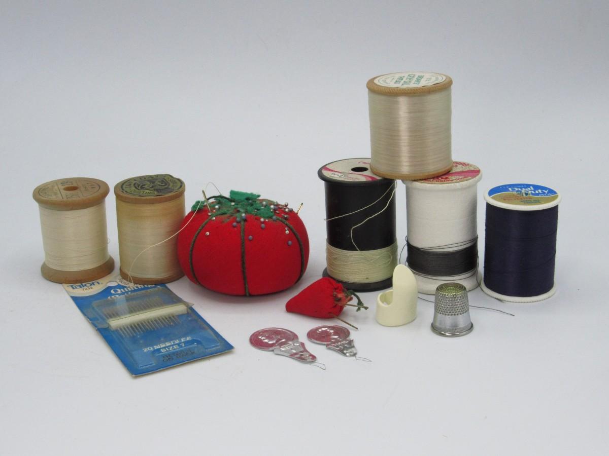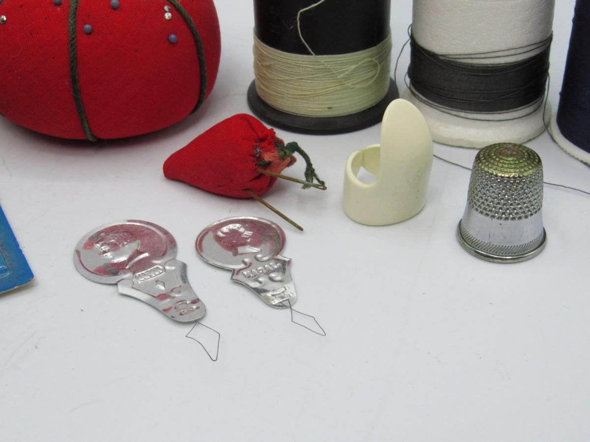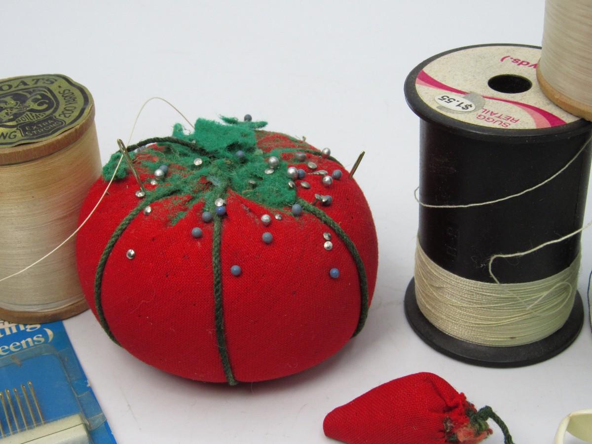 Tomato pin cushion, strawberry pin cushion, thimbles, needles, spools of thread,