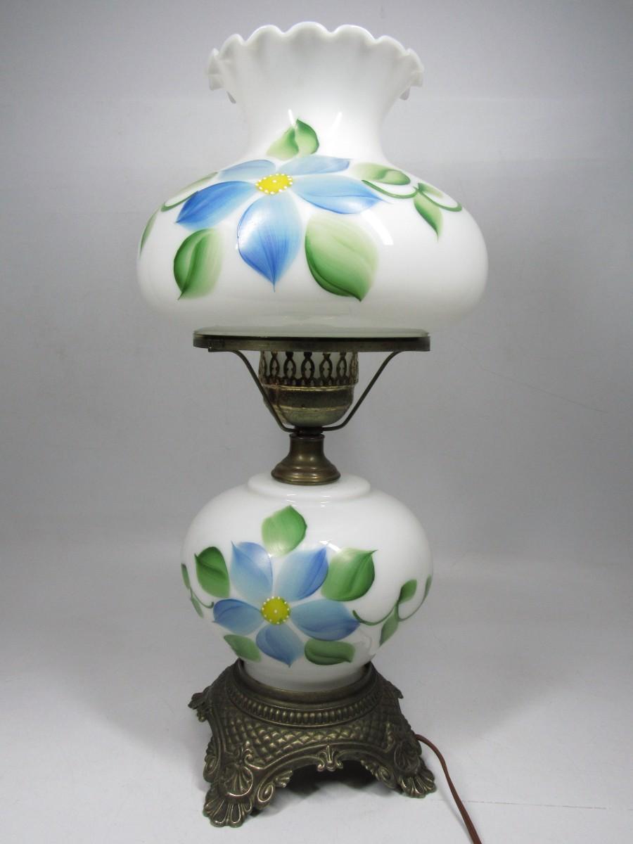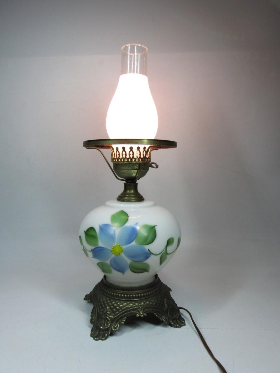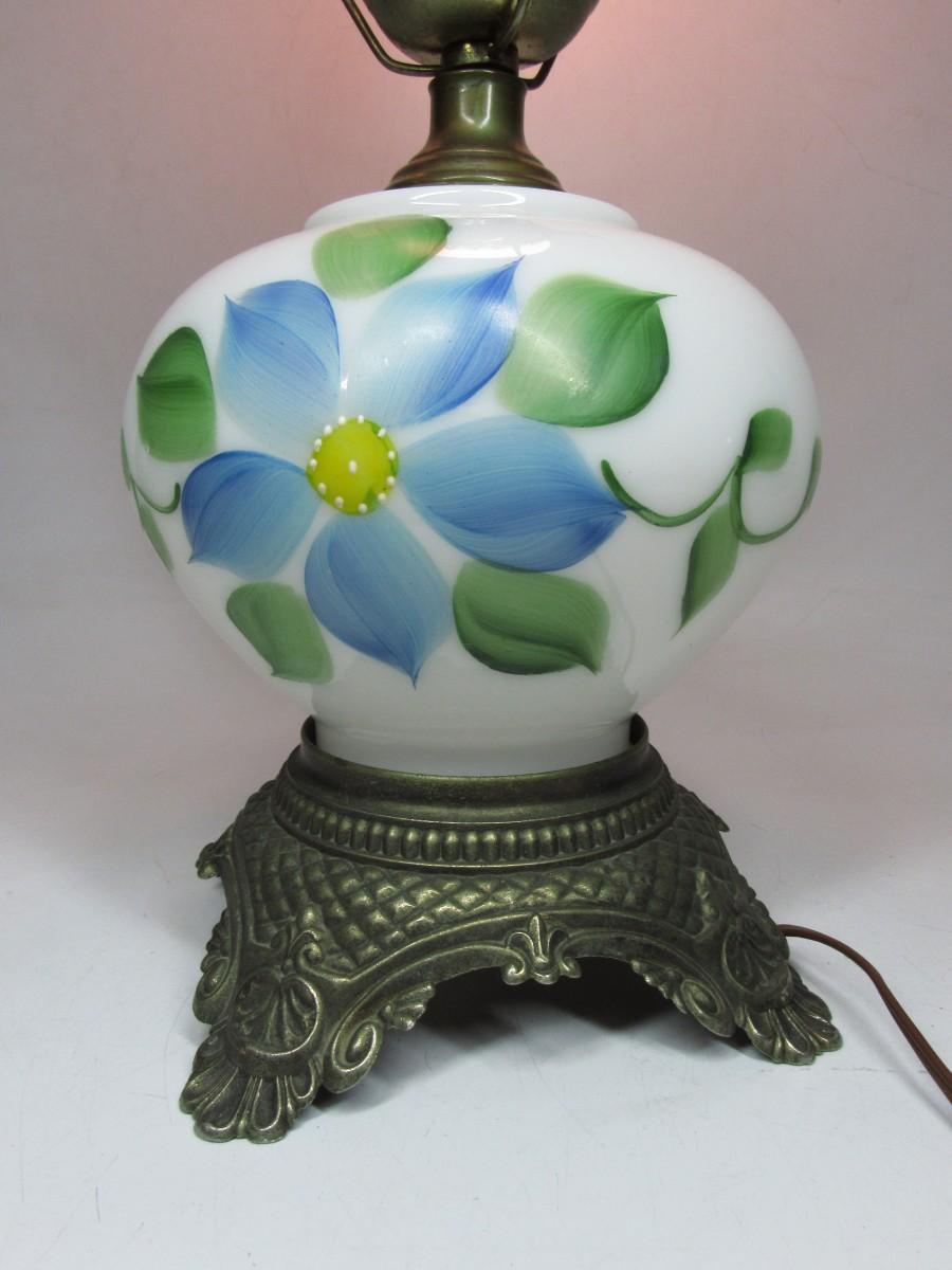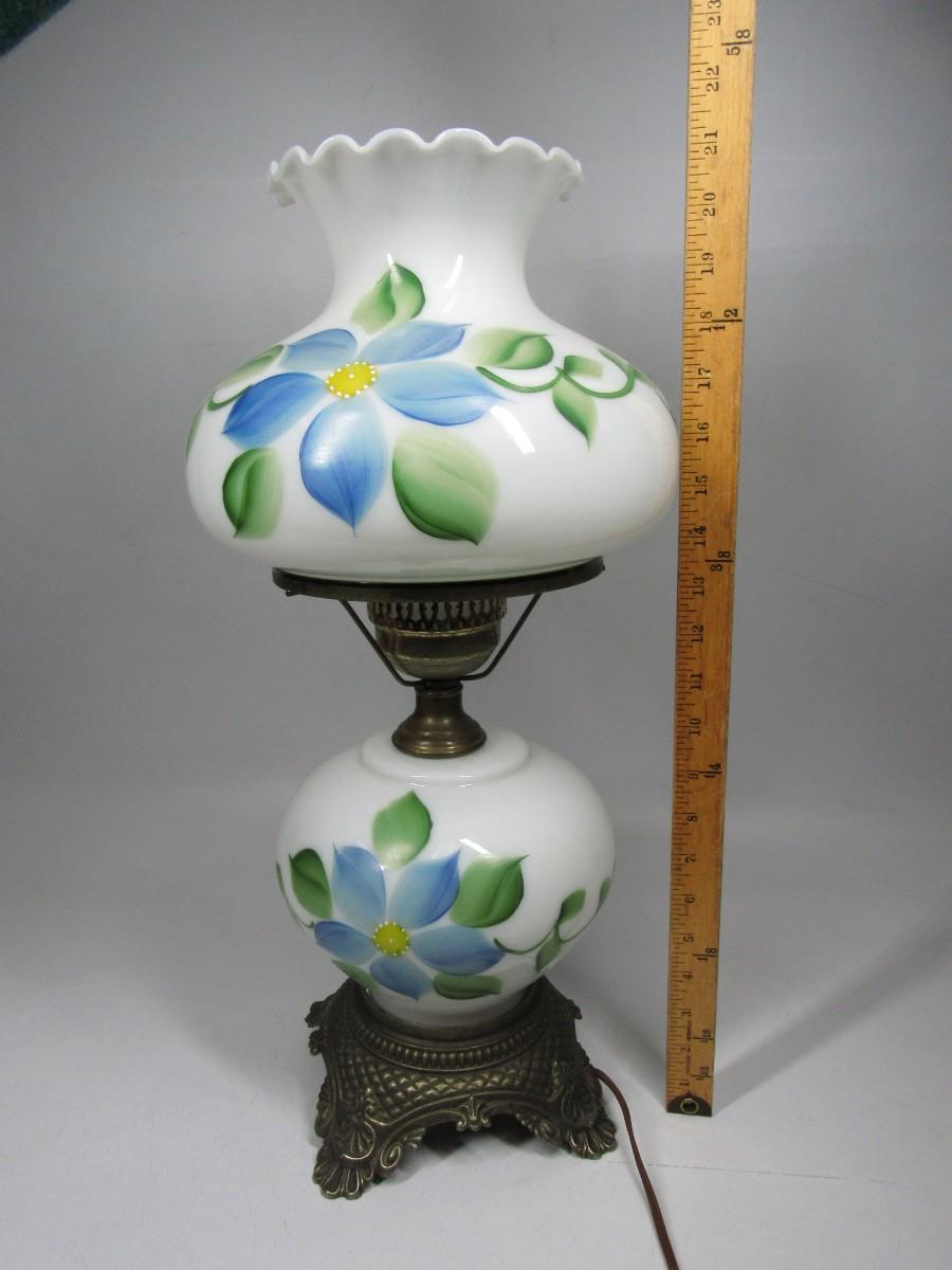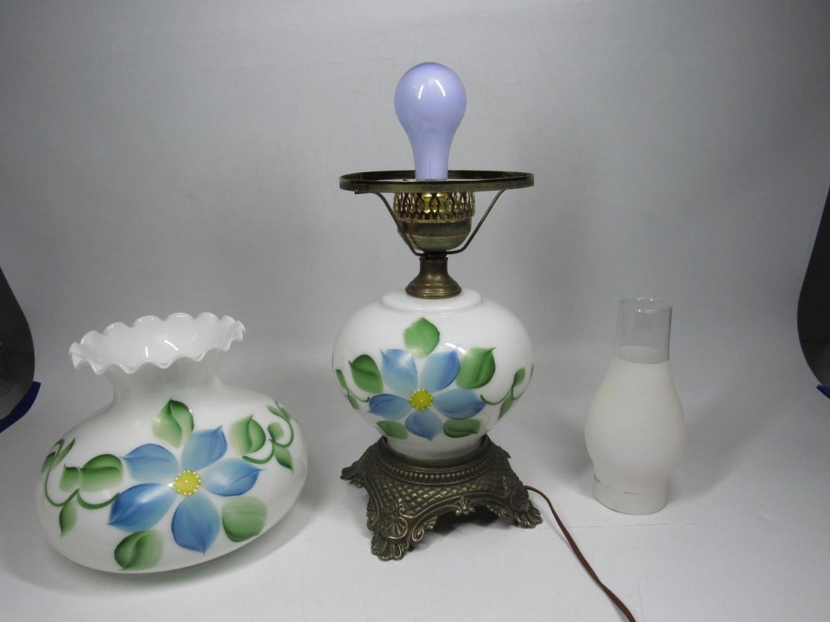 Vintage Milk Glass Hand Painted Blue Floral Hurricane Table Lamp